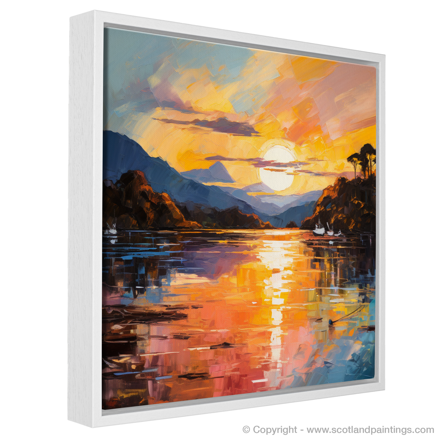 On the left, silhouetted against the setting sun, the rugged outlines of hills descend into the loch, their jagged forms softened by the emotive application of paint. The right bank reveals a copse of trees standing sentinel, their darkened shapes providing a stark contrast to the luminosity of the sky. Small boats, gently adrift, dot the water, offering a human element to this natural spectacle, while a vanishing jetty invites the viewer to step into this serene and dreamlike landscape.