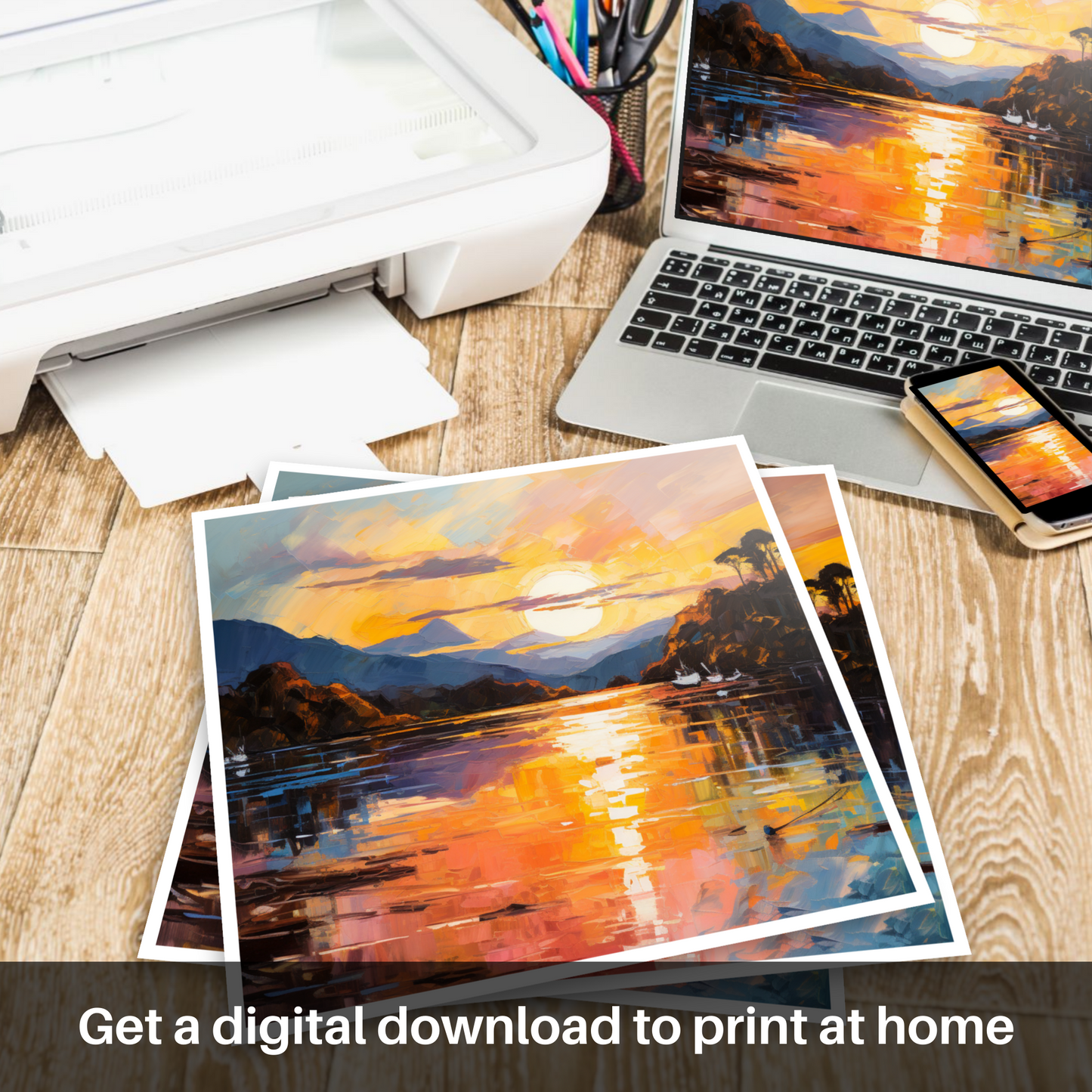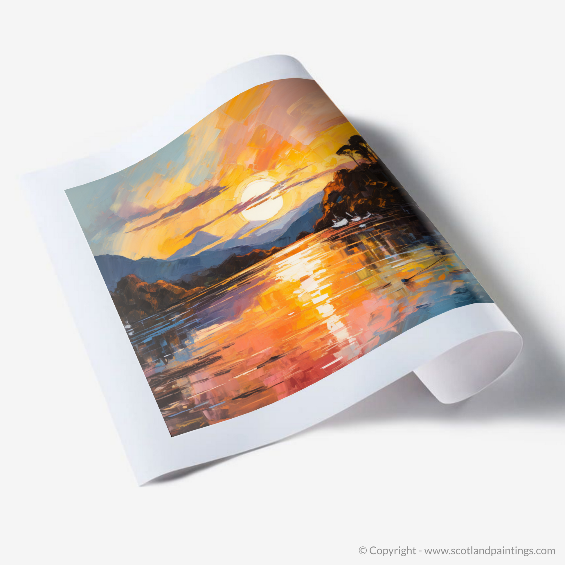 This evocative print captures not just the visual splendour but also the mood of a moment when time seems to pause, allowing one to revel in the glory of the Scottish Highlands' most cherished gems. It's more than an image; it's an invitation to the senses to experience the raw and impassioned embrace of Loch Lomond's ethereal hour.