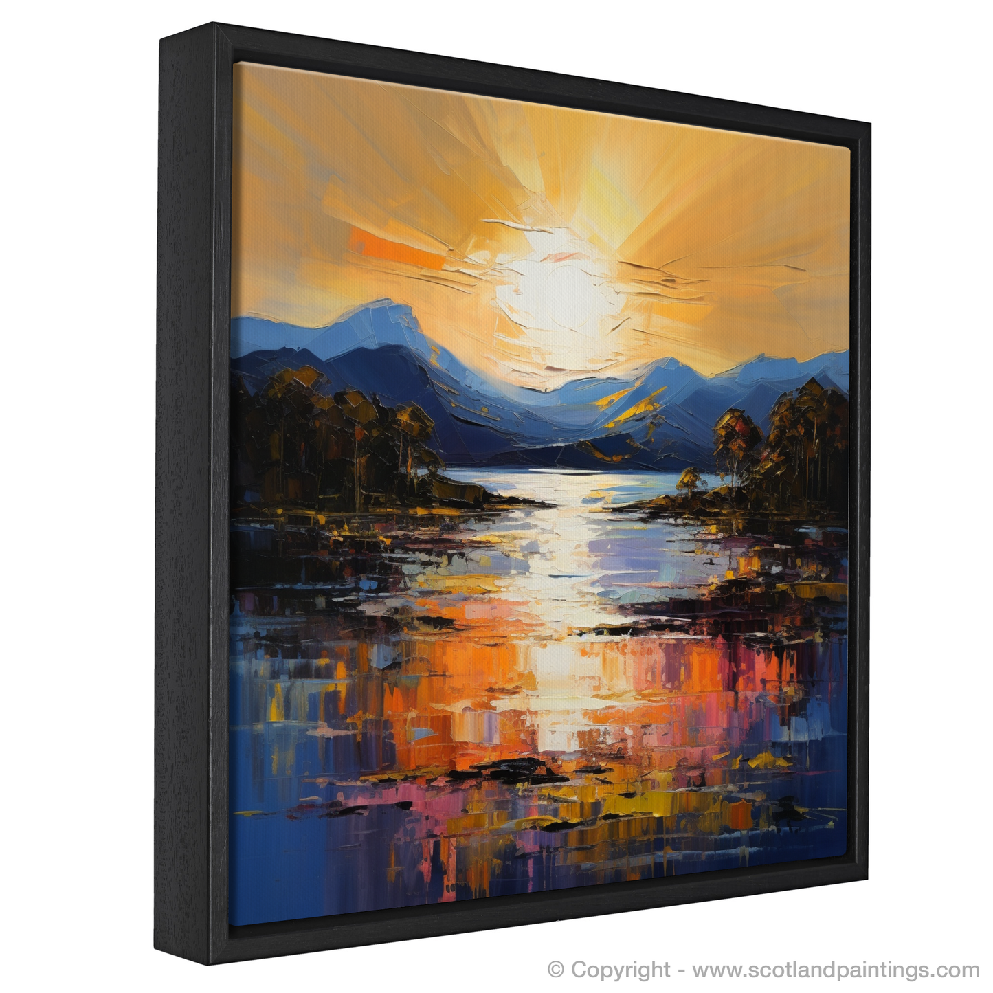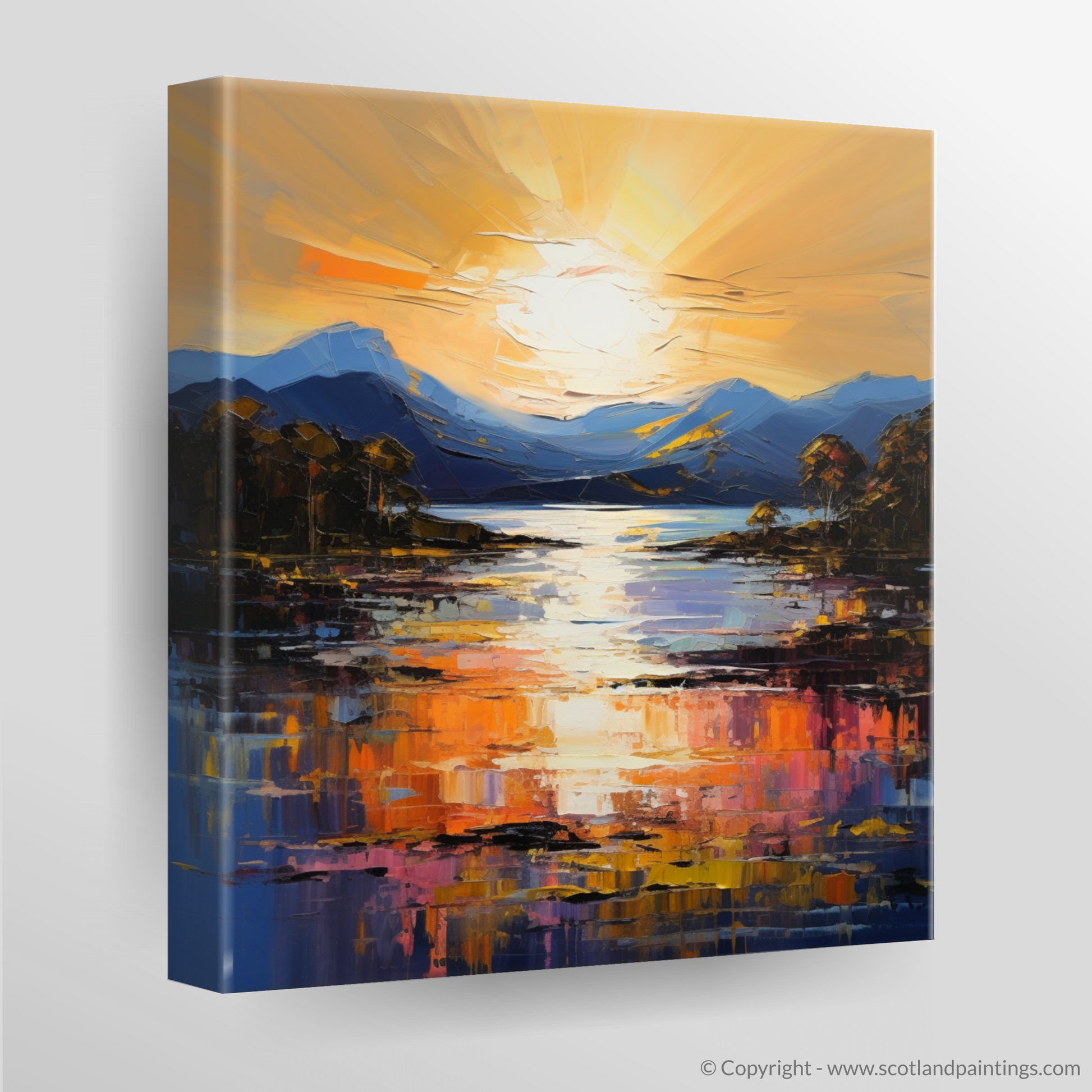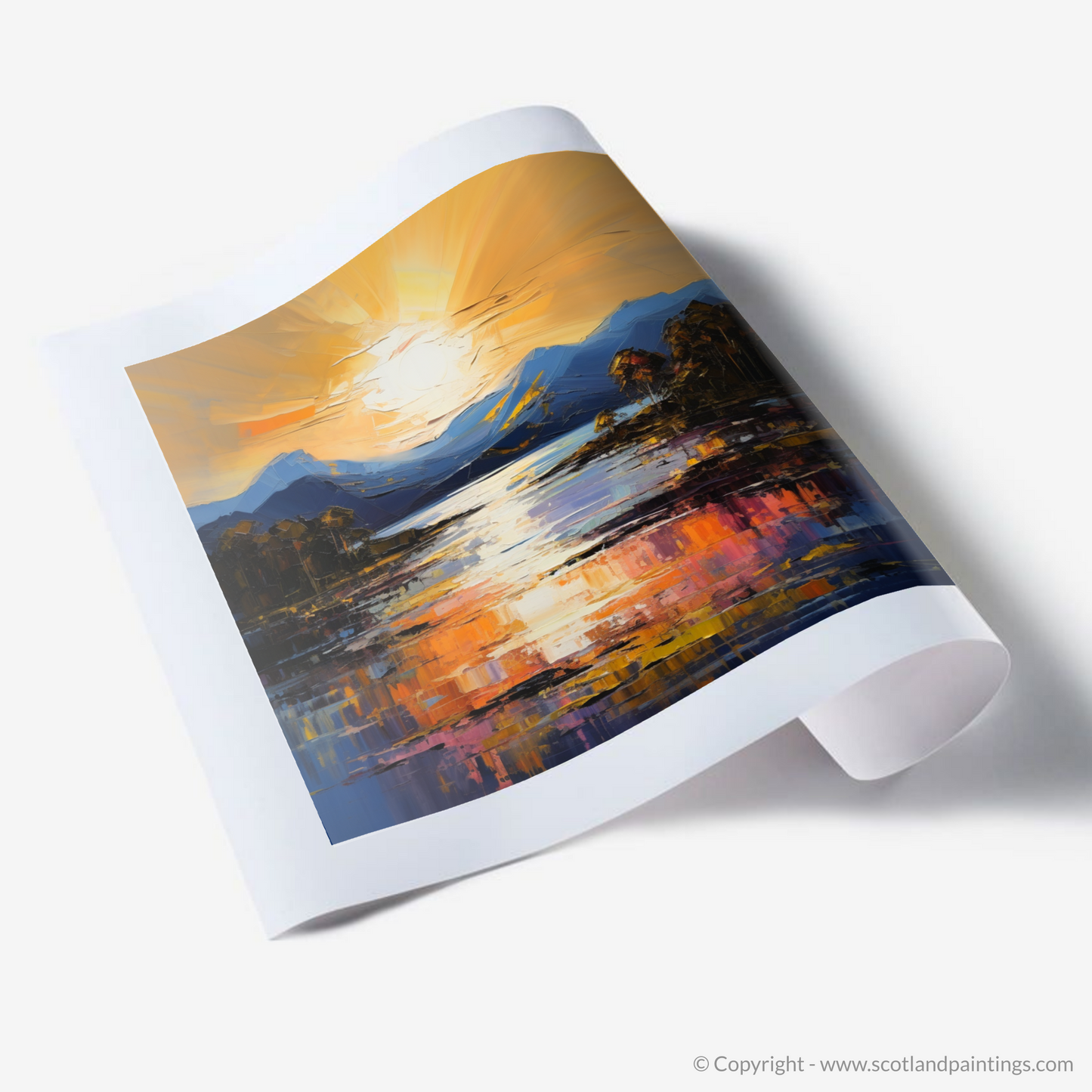 Capturing the breathtaking radiance of Golden hour, this piece is a vibrant tribute to Loch Lomond's serene beauty. The canvas comes alive with a symphony of vivid hues, where the setting sun casts an enchanting glow across the tranquil waters. Majestic mountains stand in the distance, awash with the subtle gradients of twilight.