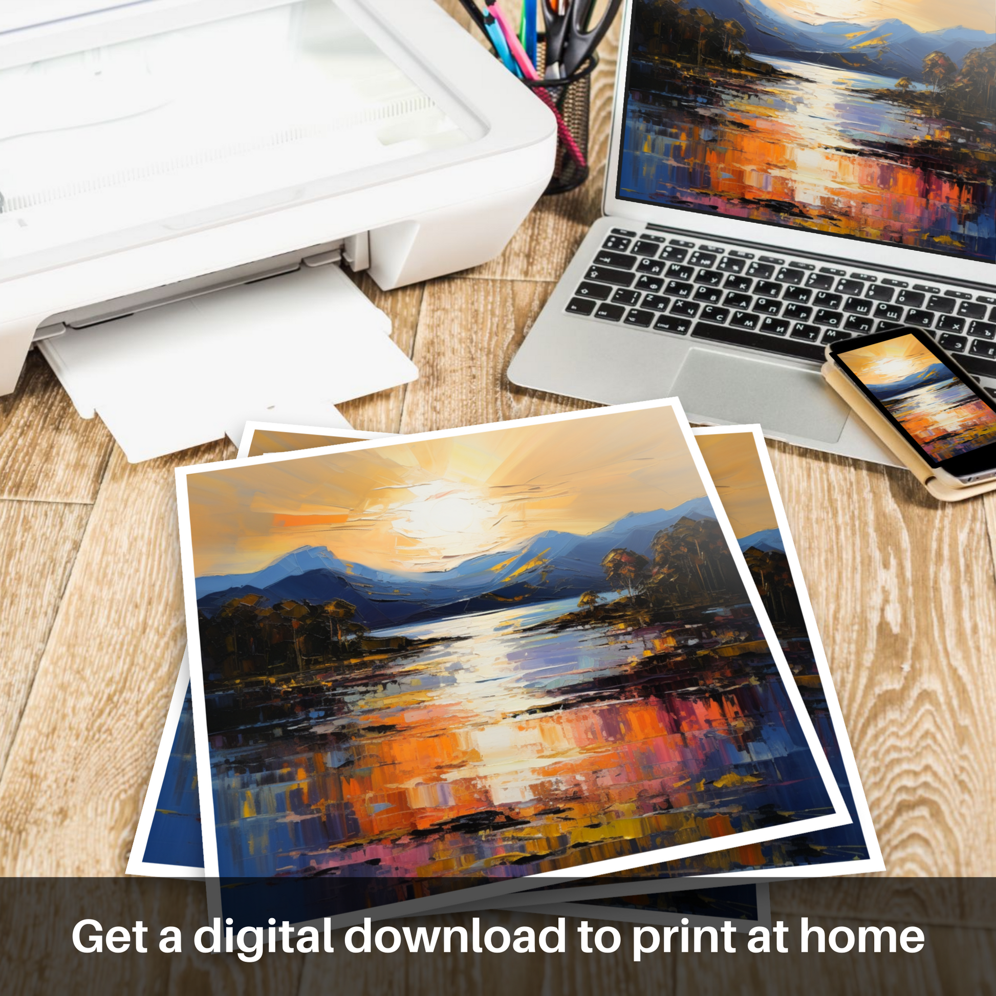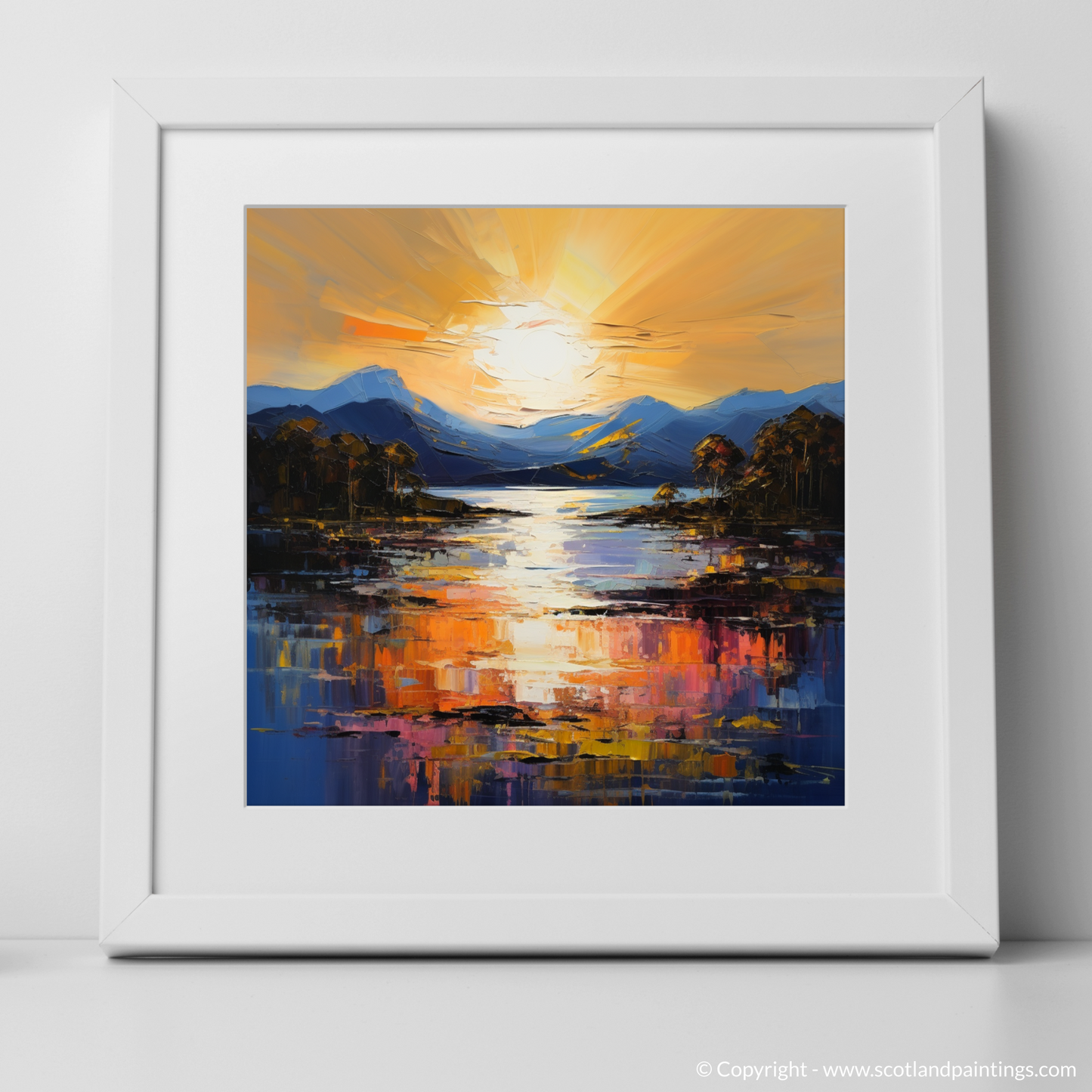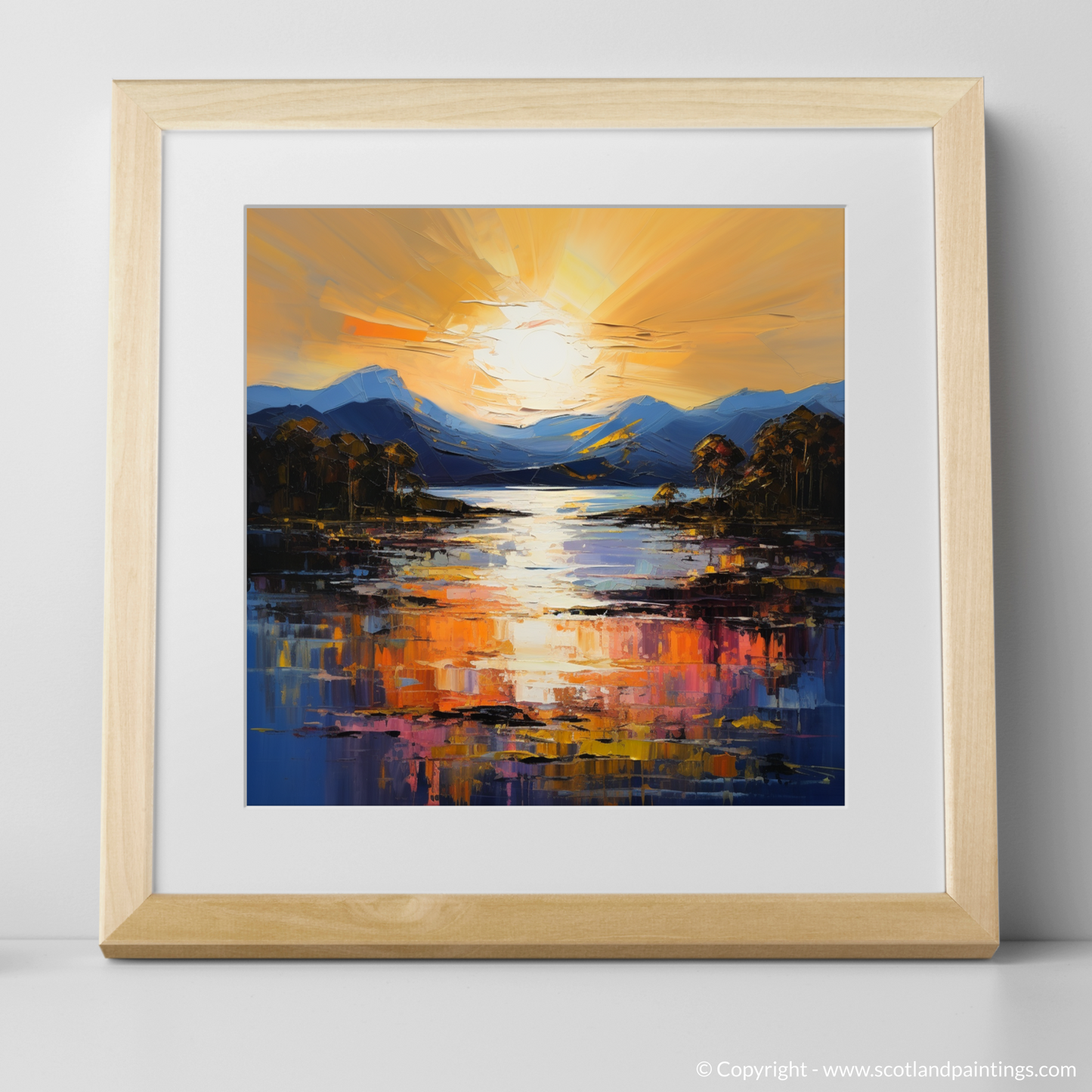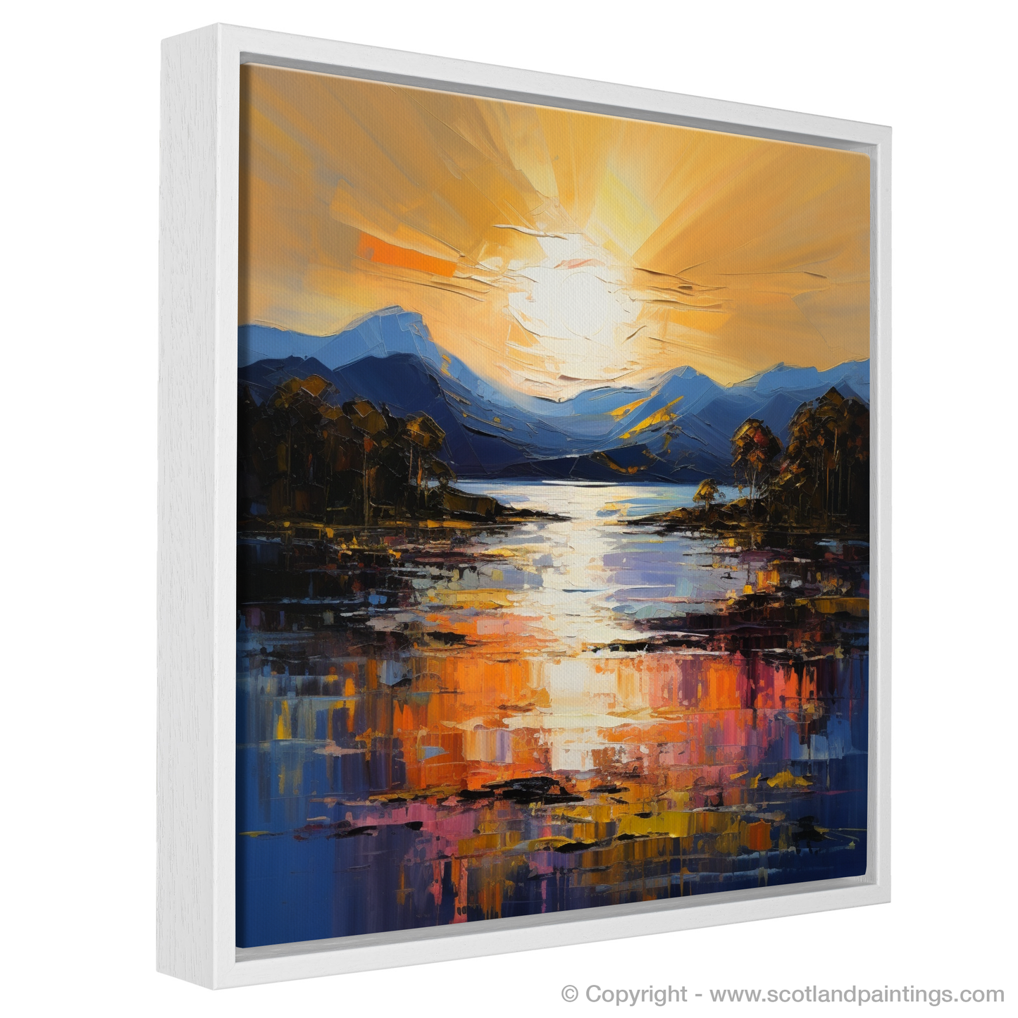 Capturing the breathtaking radiance of Golden hour, this piece is a vibrant tribute to Loch Lomond's serene beauty. The canvas comes alive with a symphony of vivid hues, where the setting sun casts an enchanting glow across the tranquil waters. Majestic mountains stand in the distance, awash with the subtle gradients of twilight.