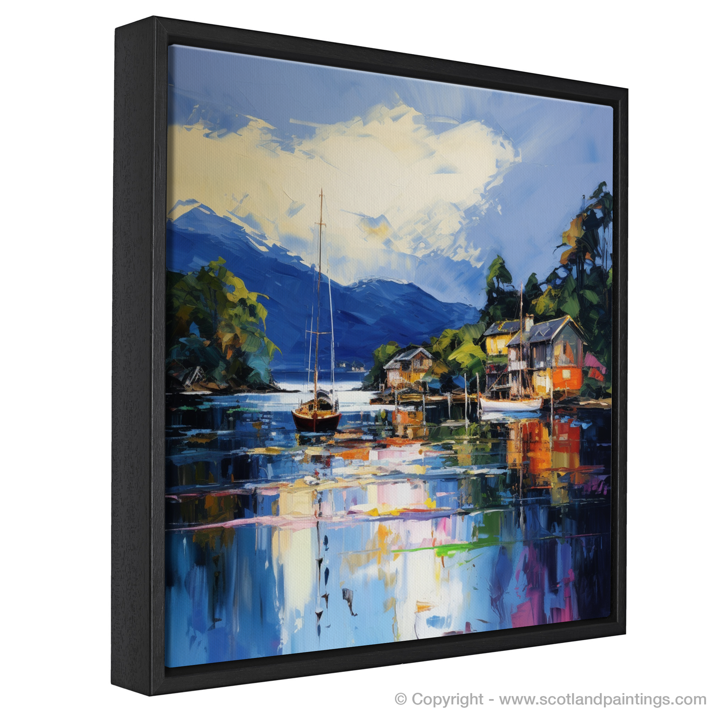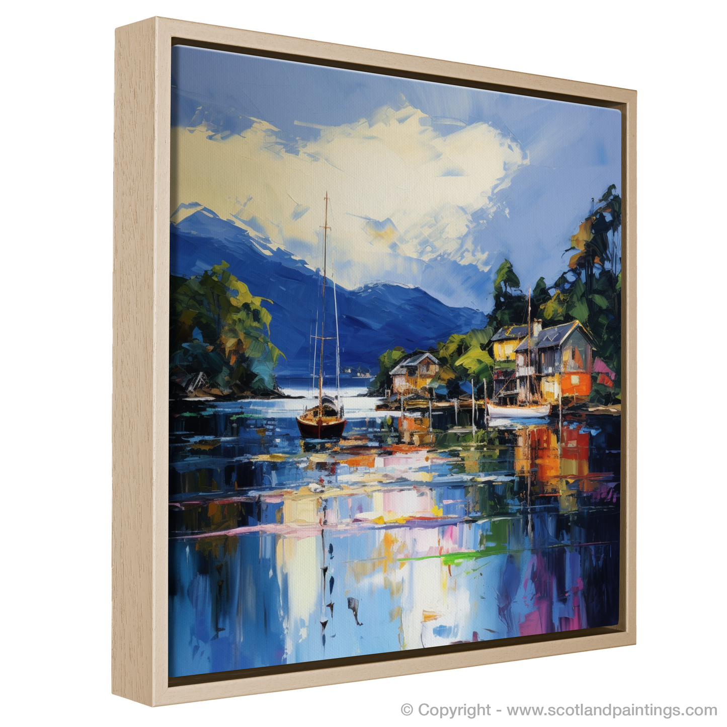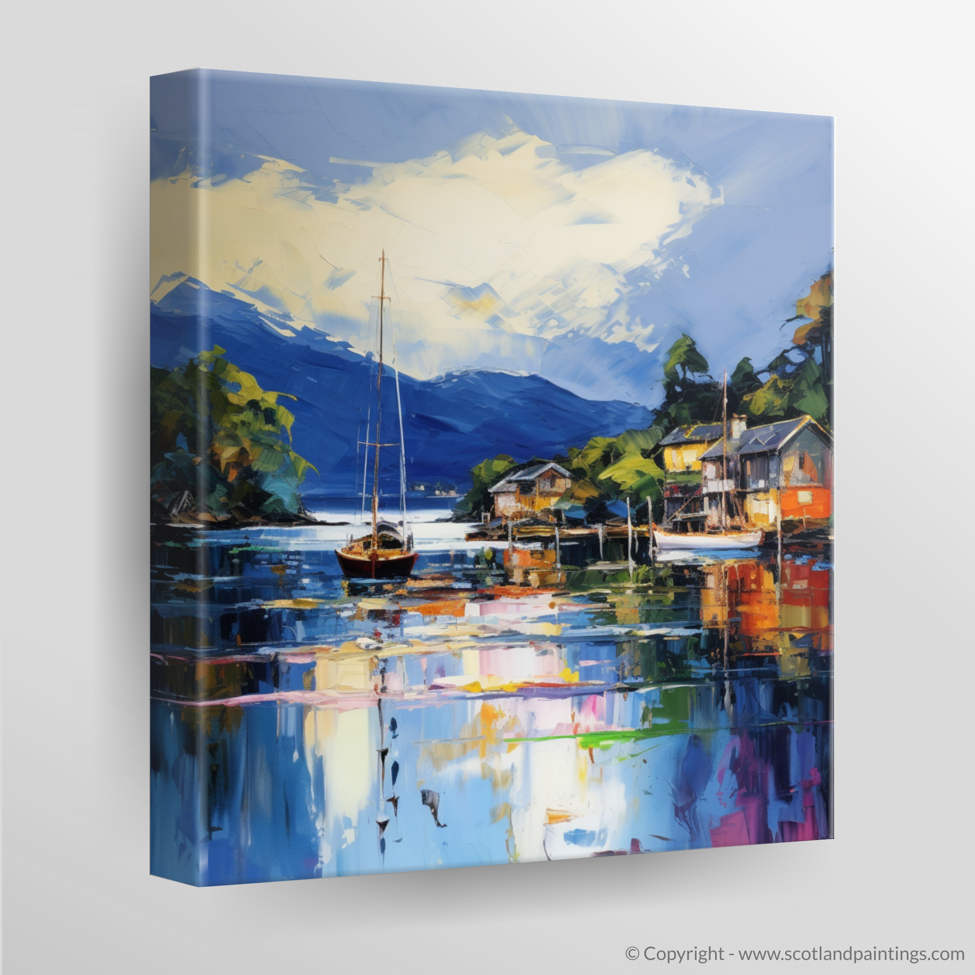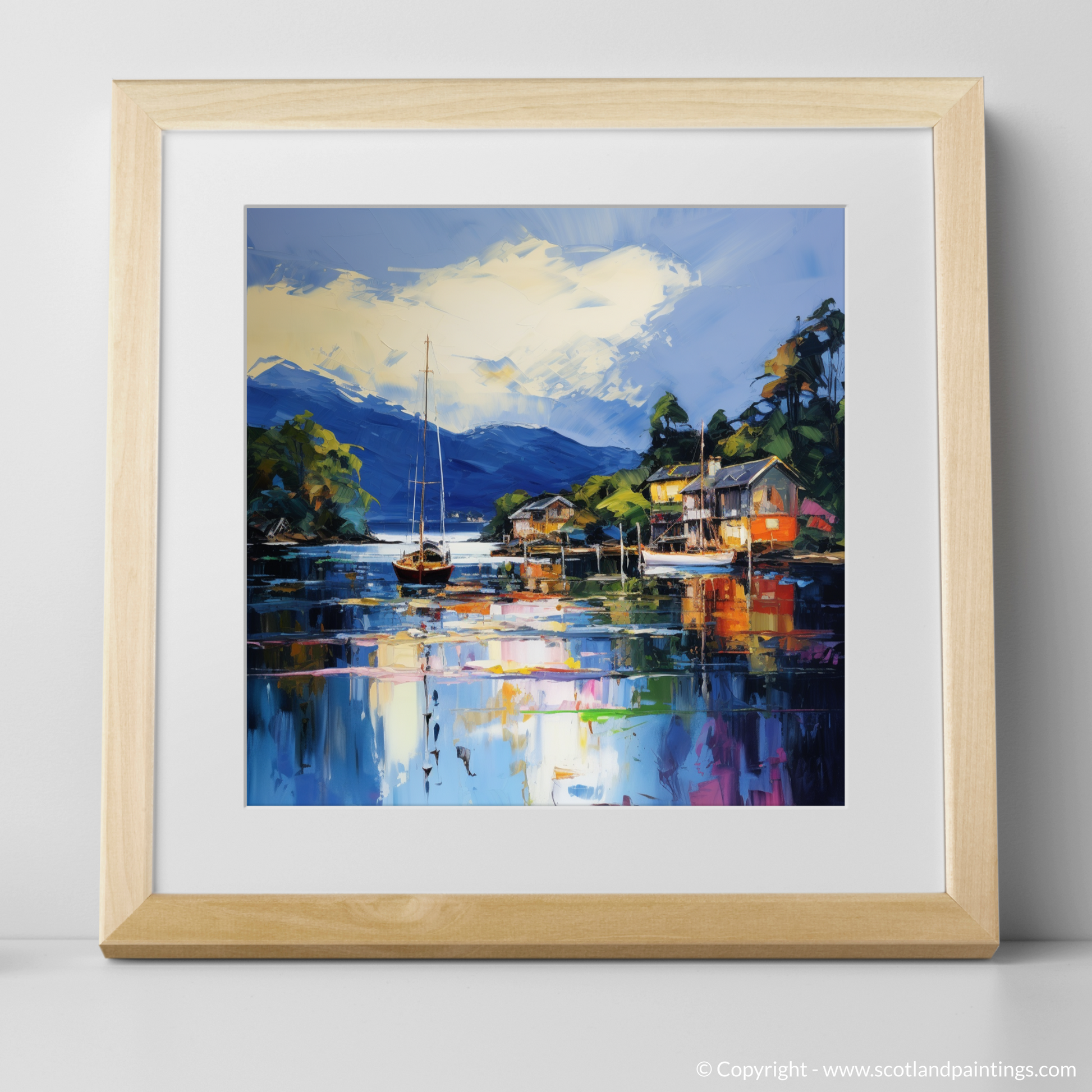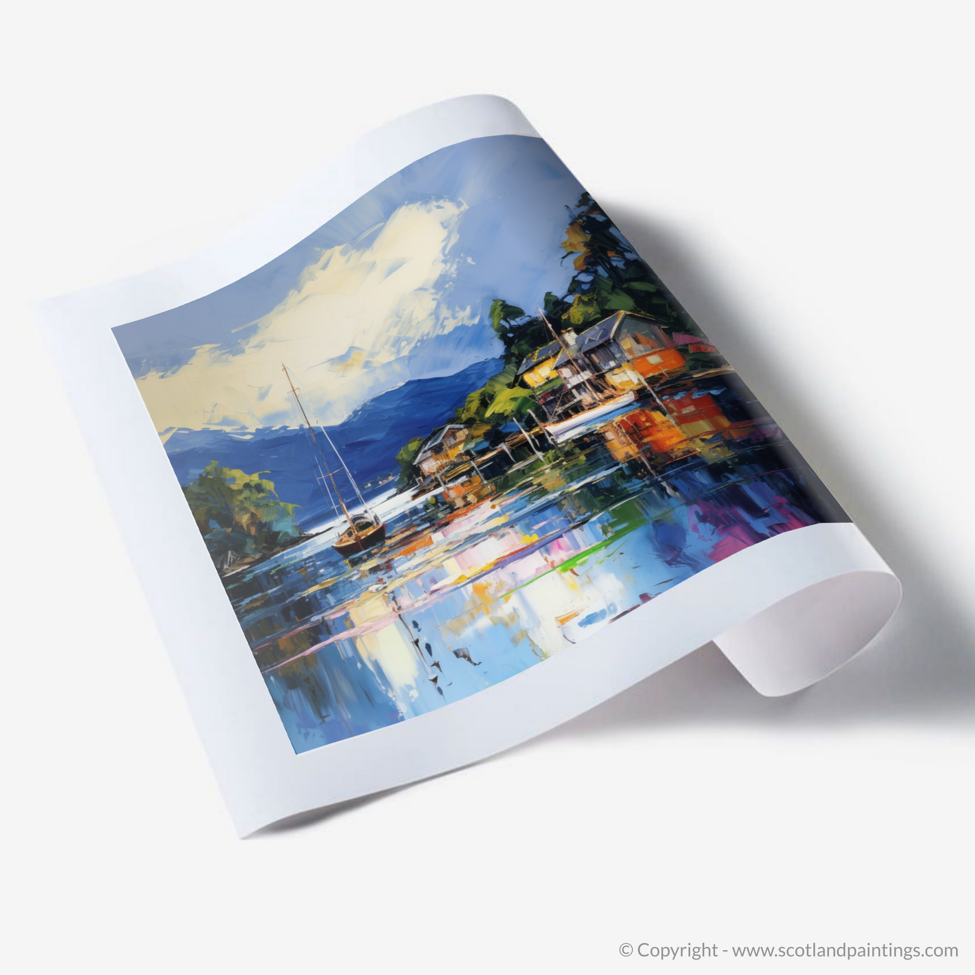 Capturing the essence of Balmaha Harbour, this arresting print is a celebration of colour and raw emotion, exemplifying the evocative style of Expressionism. The harbour scene comes alive with vivid brushstrokes and a bold palette, reflecting the vitality of the Scottish landscape. The waters of Loch Lomond are represented with dynamic swirls of blues and whites, suggesting the gentle movement of the water's surface. A solitary yacht with a richly hued hull anchors the composition, its mast cutting a fine line against the backdrop of a warmly lit sky.