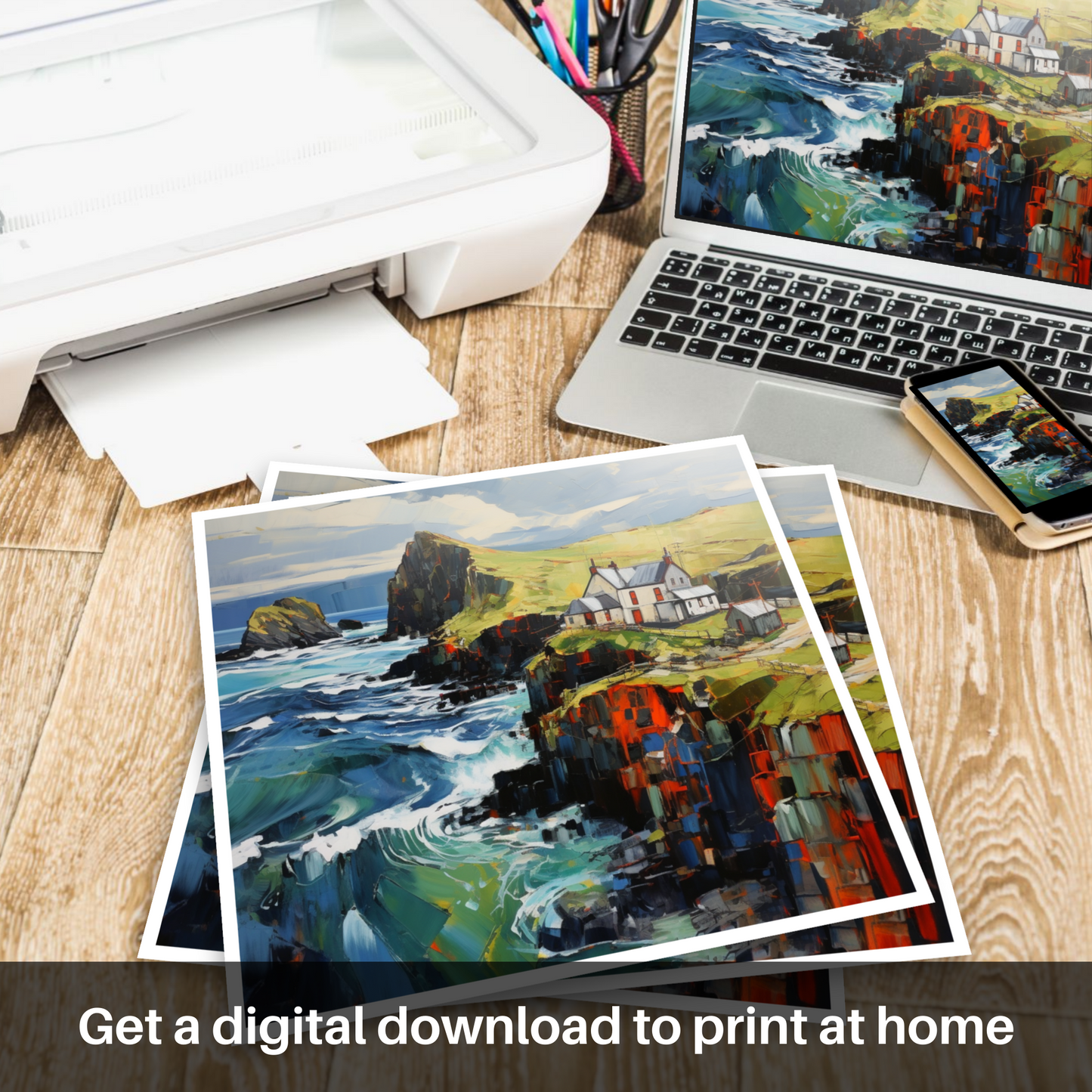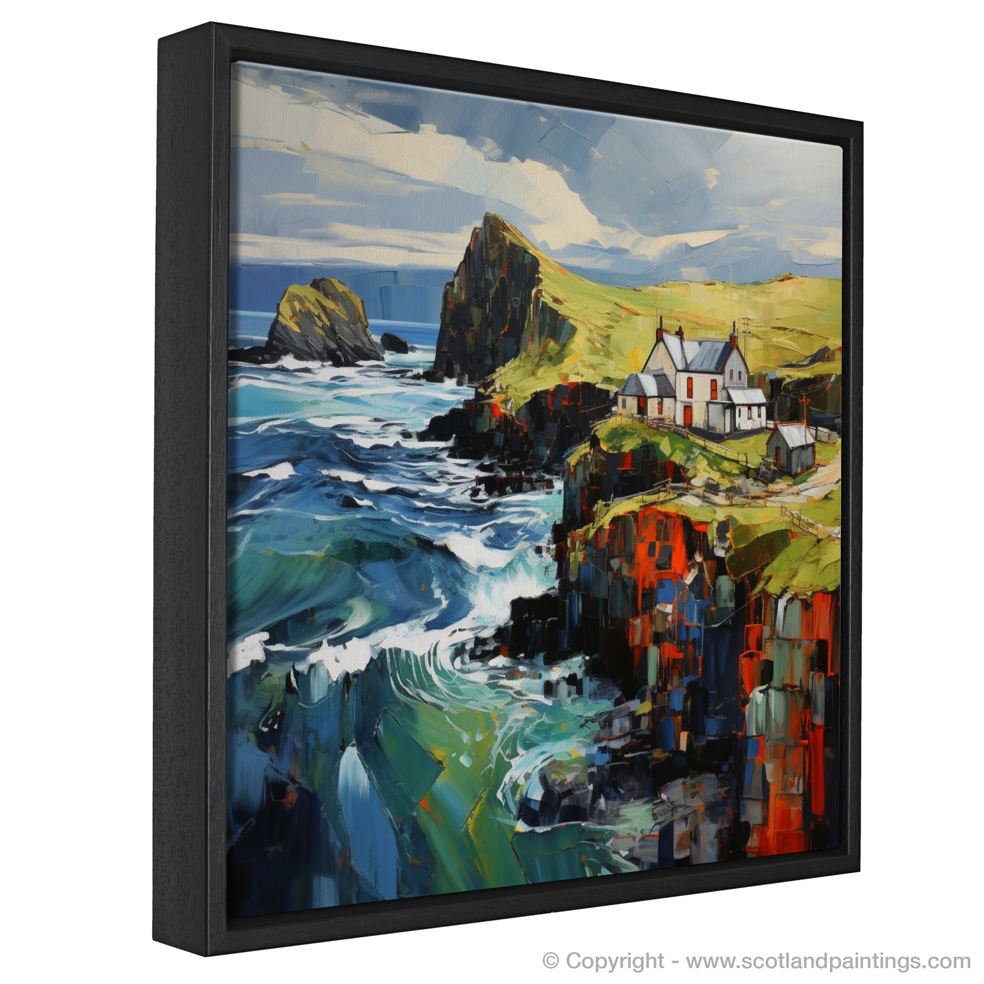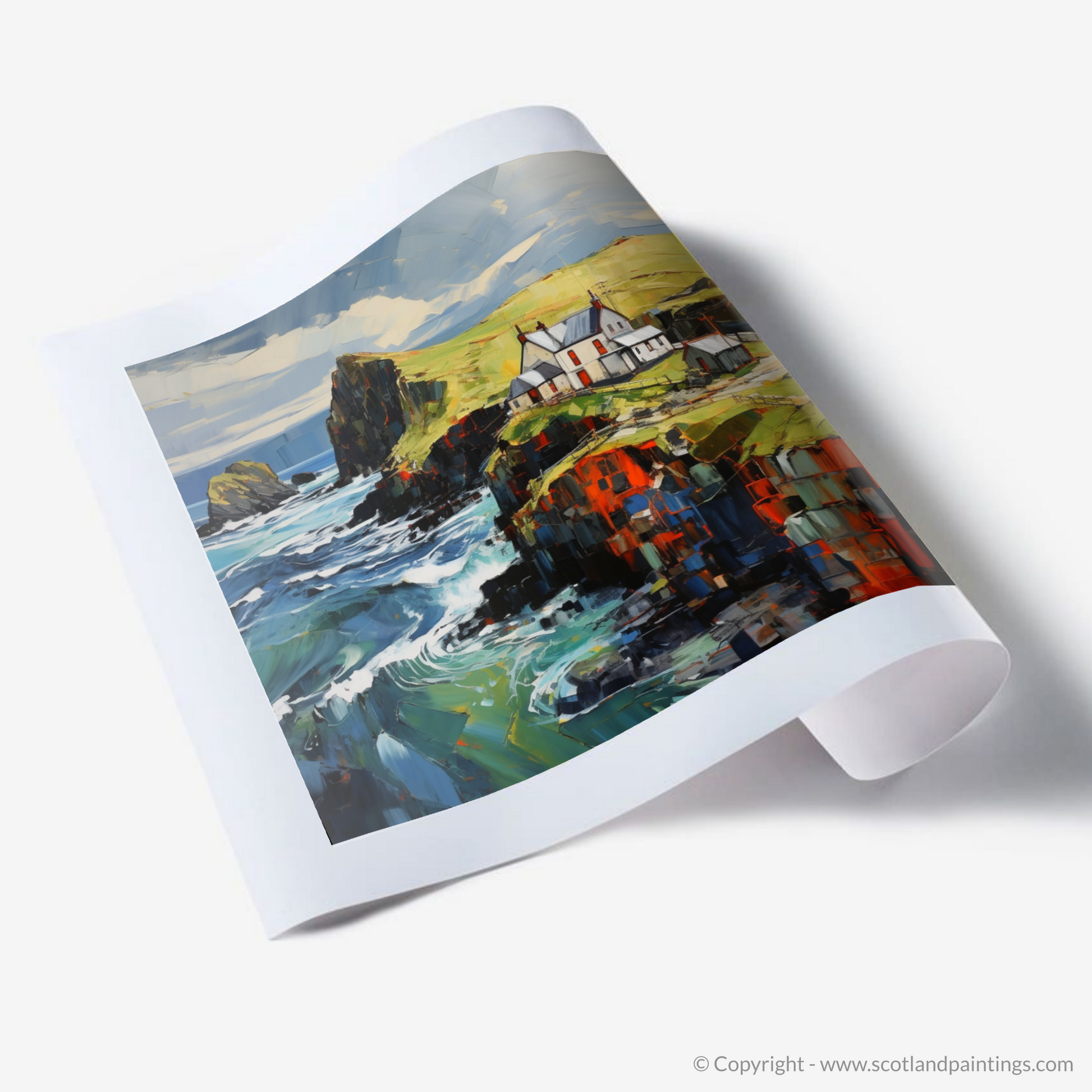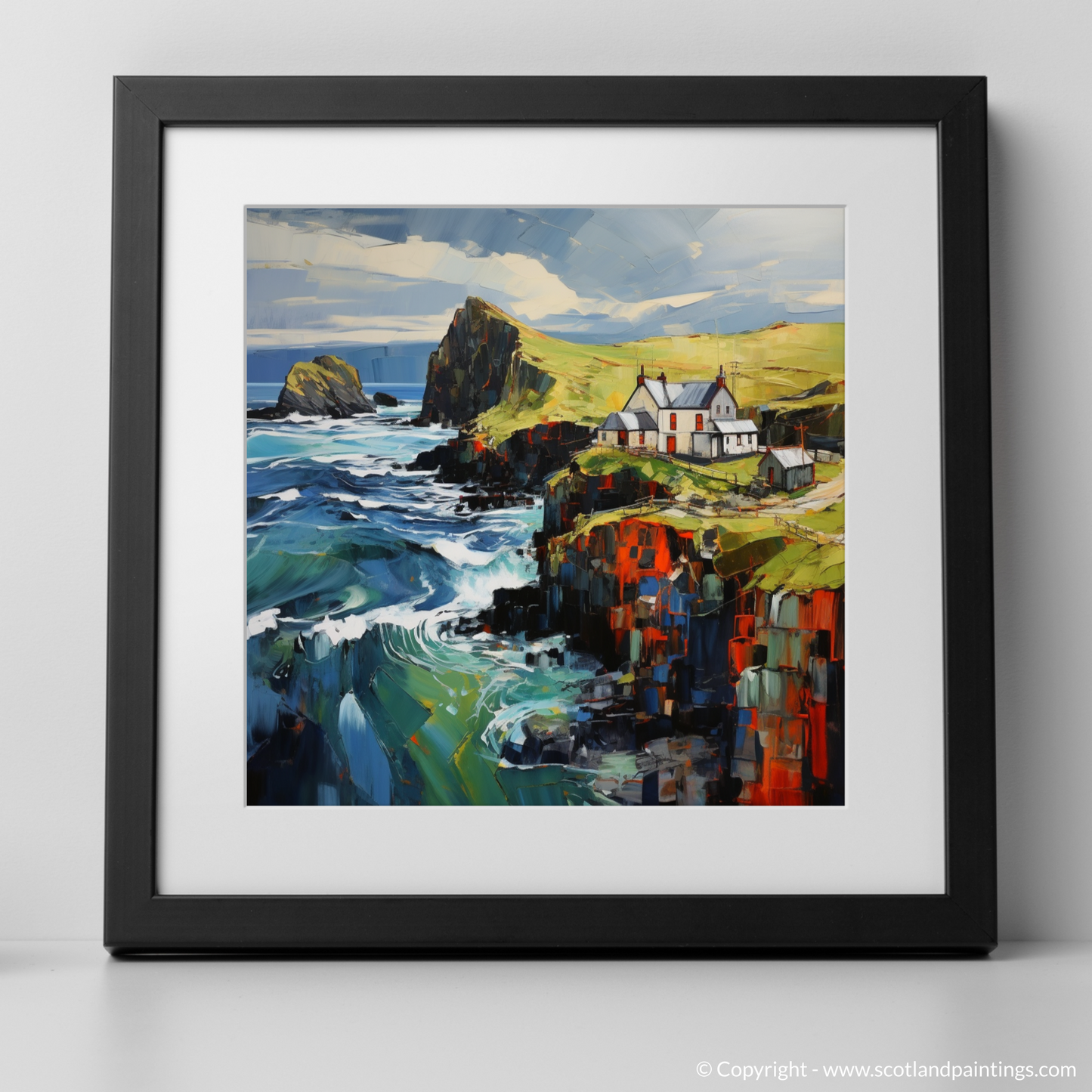 Captured with vibrant emotional fervour, this expressive print evokes the untamed beauty of Shetland, an archipelago steeped in mystery and natural splendour. The scene unfolds amidst a tempestuous dance of land, sea, and sky, where bold strokes and rich colours convey the raw energy of this northern haven.