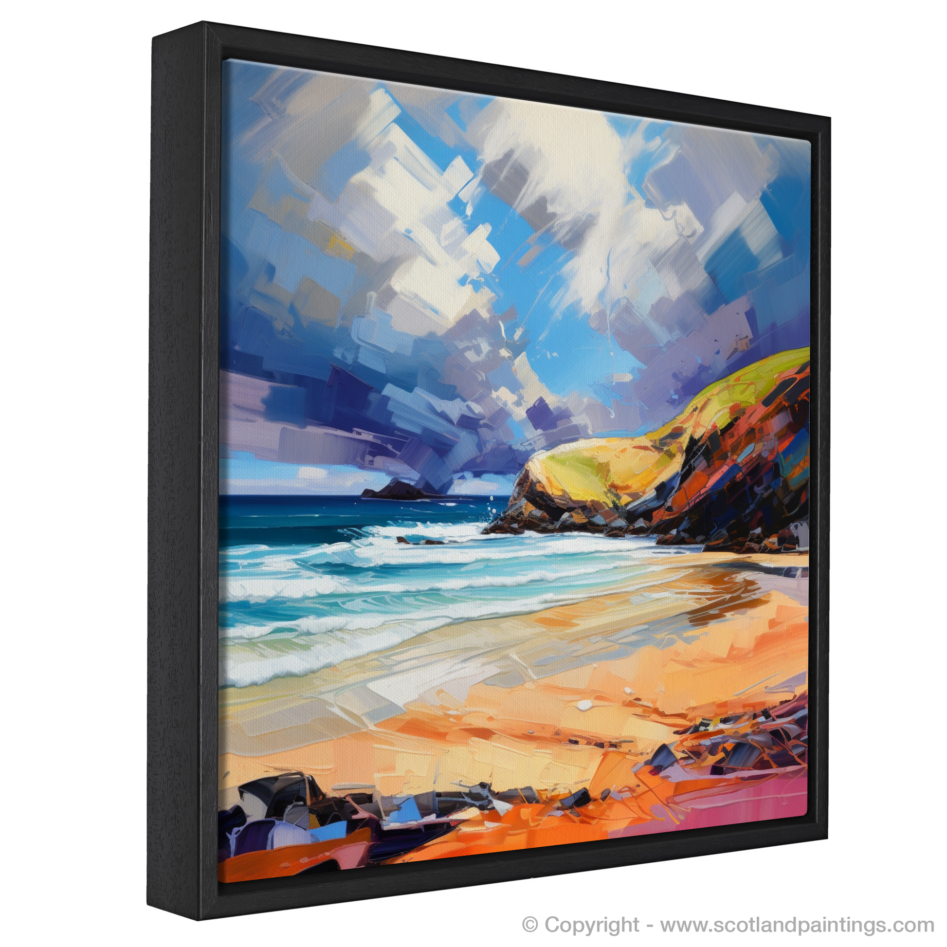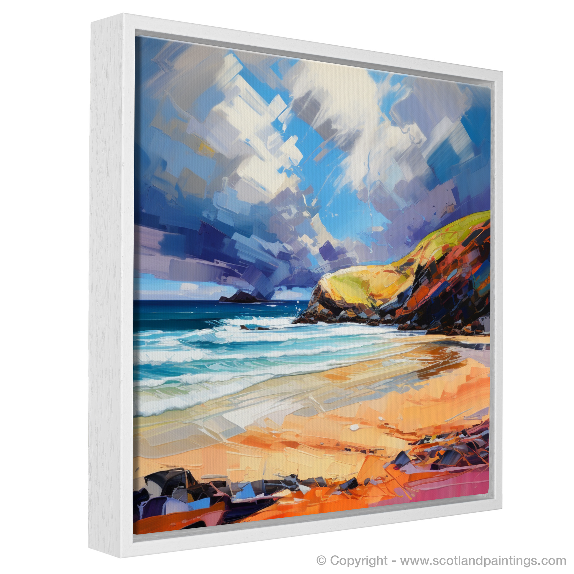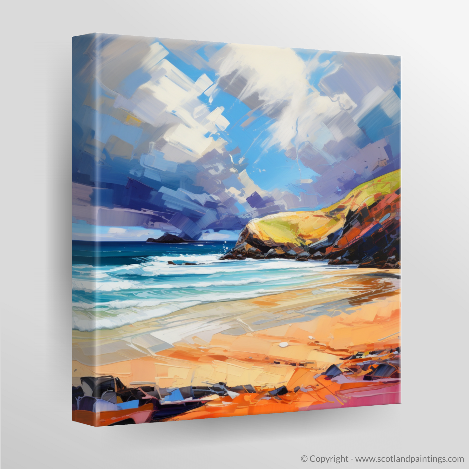 Capturing the raw, untamed beauty of Sandwood Bay, this expressive print portrays the dramatic essence of one of Scotland's most secluded beaches. The tempestuous sky, rendered in a tumult of blues and whites, conveys a palpable sense of movement, mirroring the restless energy of the Scottish weather. Stark, dynamic brushstrokes evoke the howling winds and fast-moving clouds, giving viewers a feeling of the storm's imminent approach.