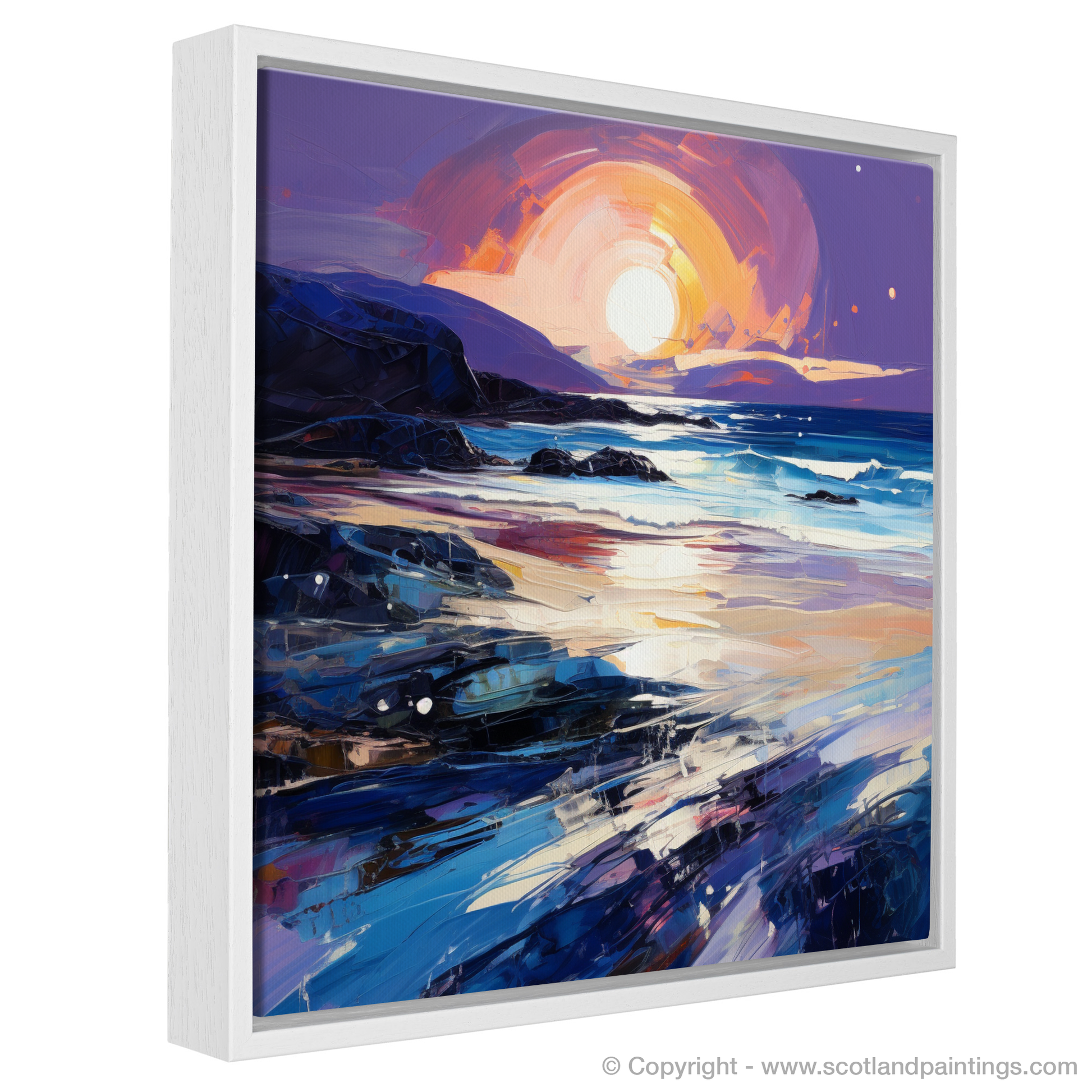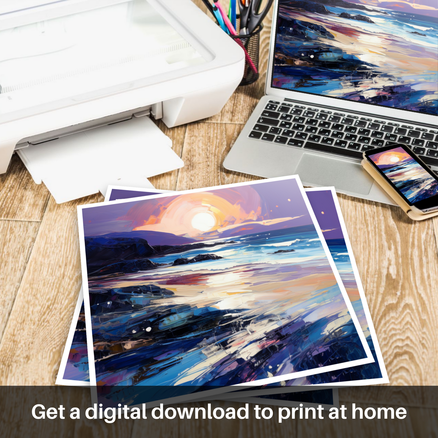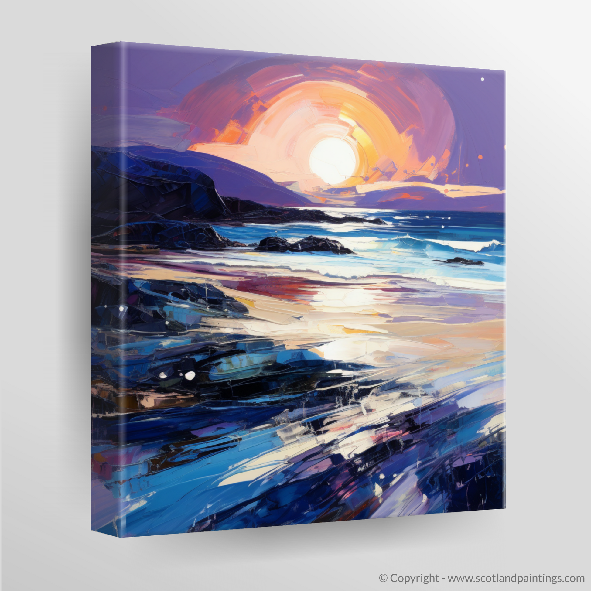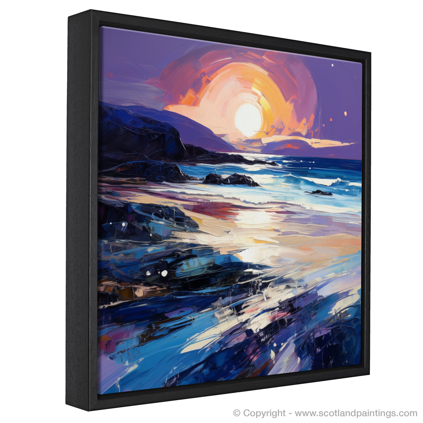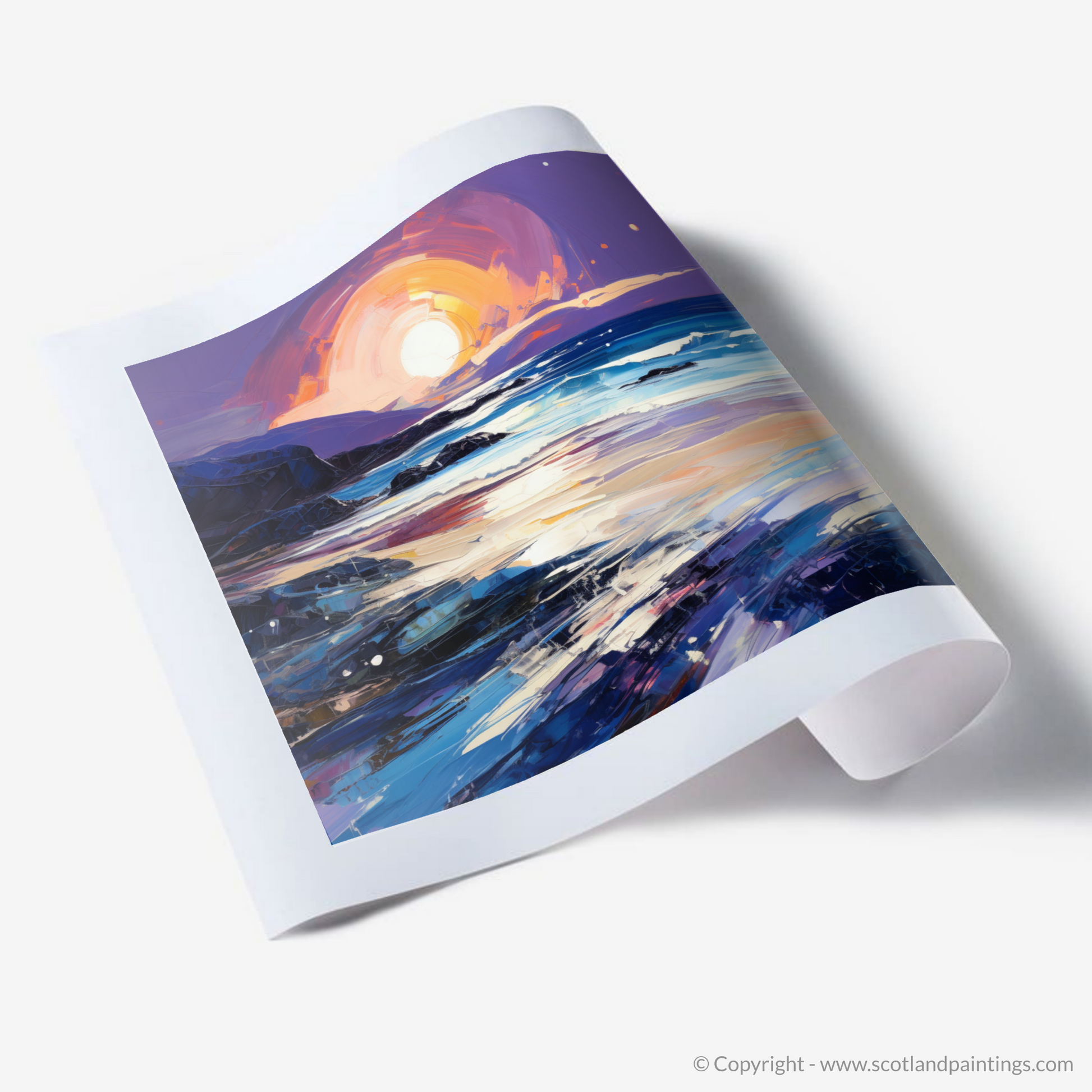 Capturing the fleeting beauty of Traigh Mhor at the enchanting hour of dusk, this print is a masterpiece of vivid colours and emotive ambiance. The palette is awash with the rich purples, fiery oranges, and cool blues of a twilight sky reflected in the serene waters below. Bold, impulsive strokes convey the movement of the tide and the serenity of the landscape as the sun dips below the horizon, casting its warm glow over the sea.