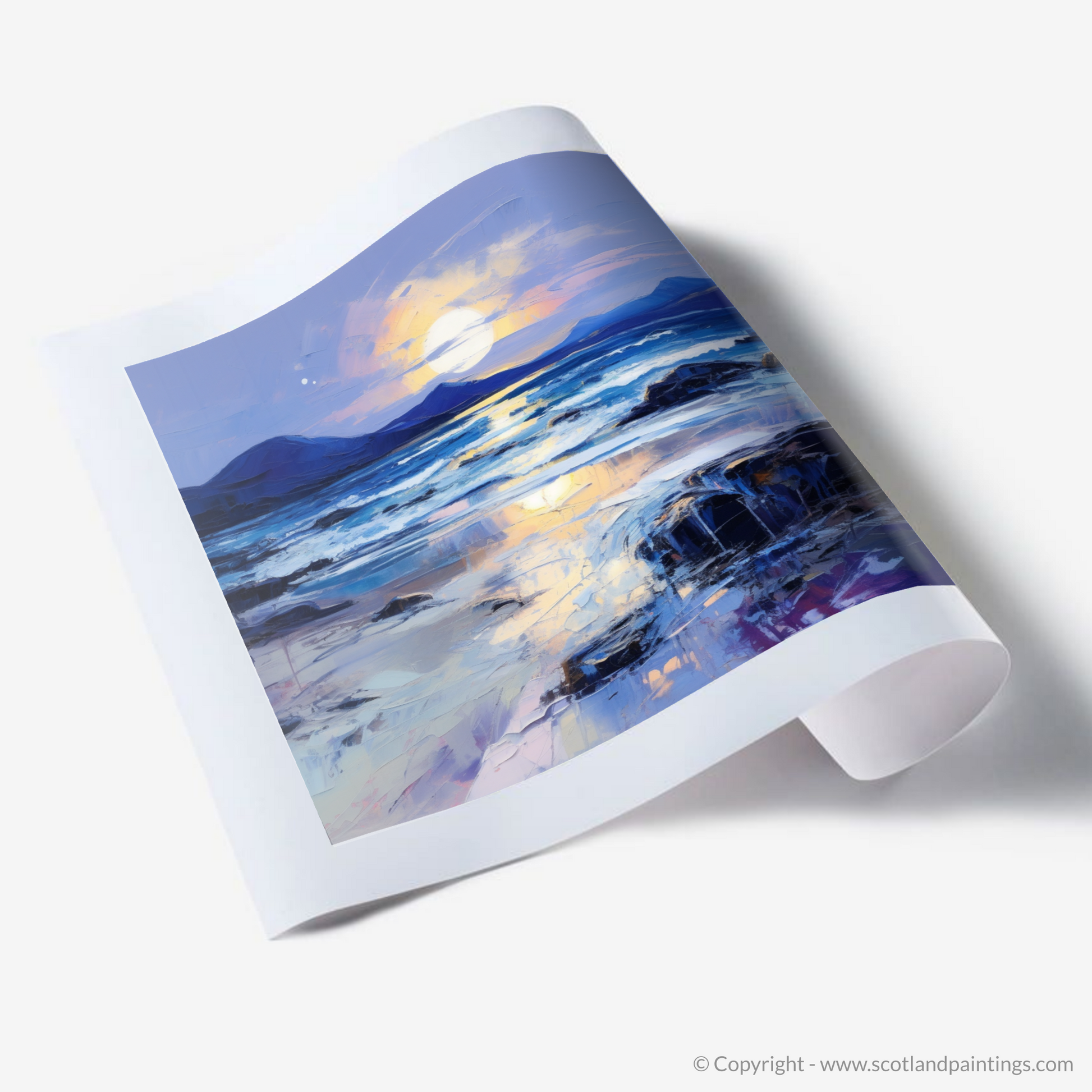 This exquisite print draws its inspiration from the serene beauty of Traigh Mhor at dusk, with its palette brimming with the rich colours of the setting sun. The artwork is a striking example of Expressionism, where the interplay of vivid hues and bold brushstrokes captures the emotional essence and dynamic atmosphere of this Scottish cove.
