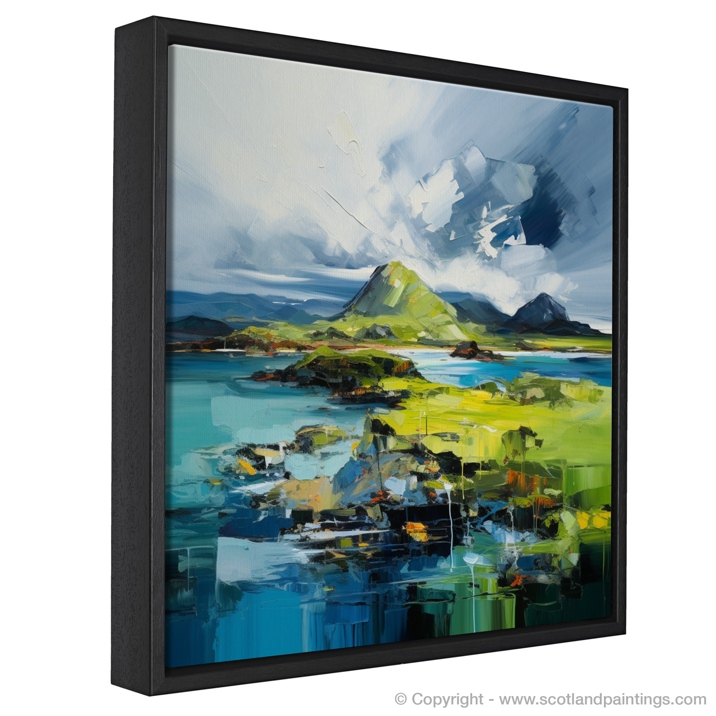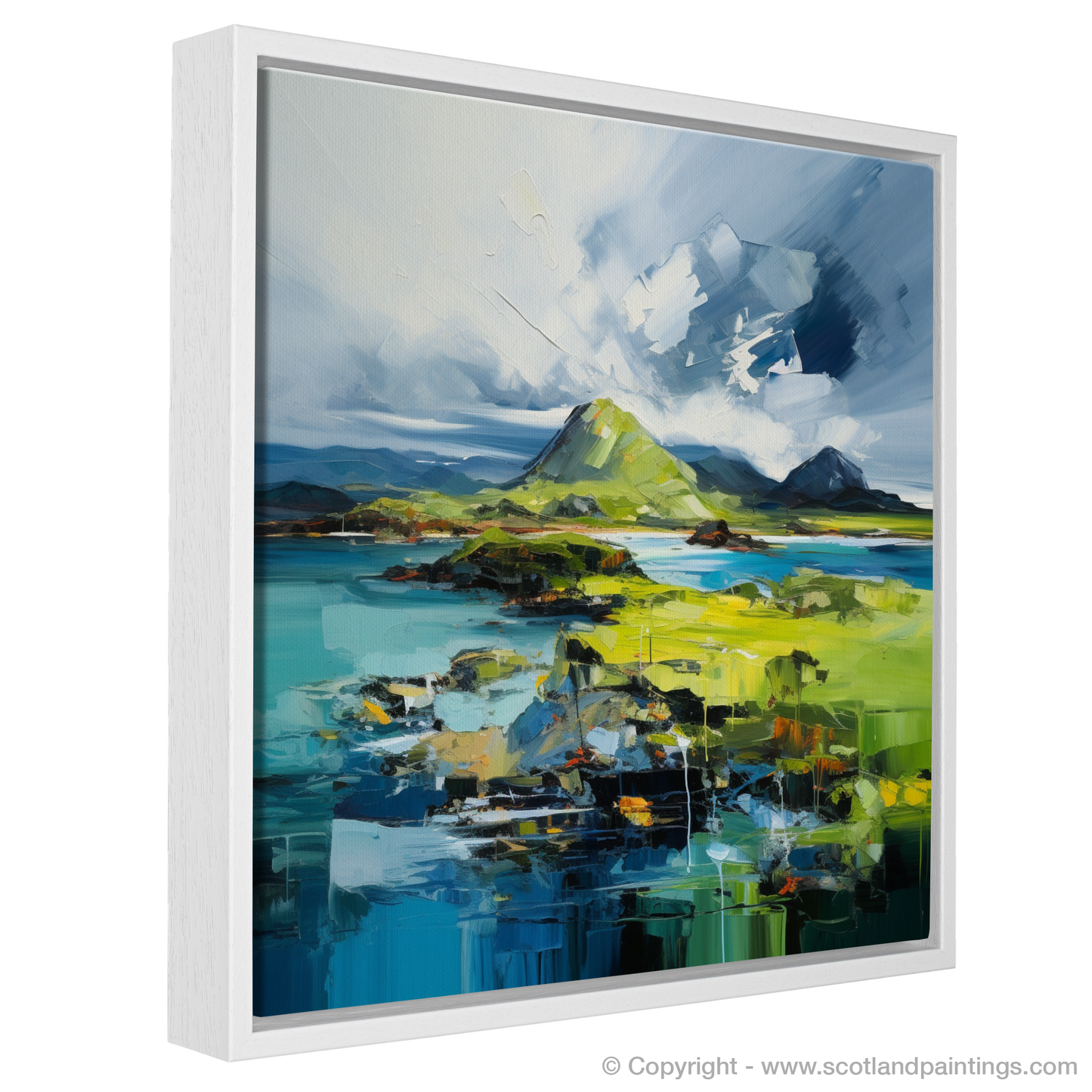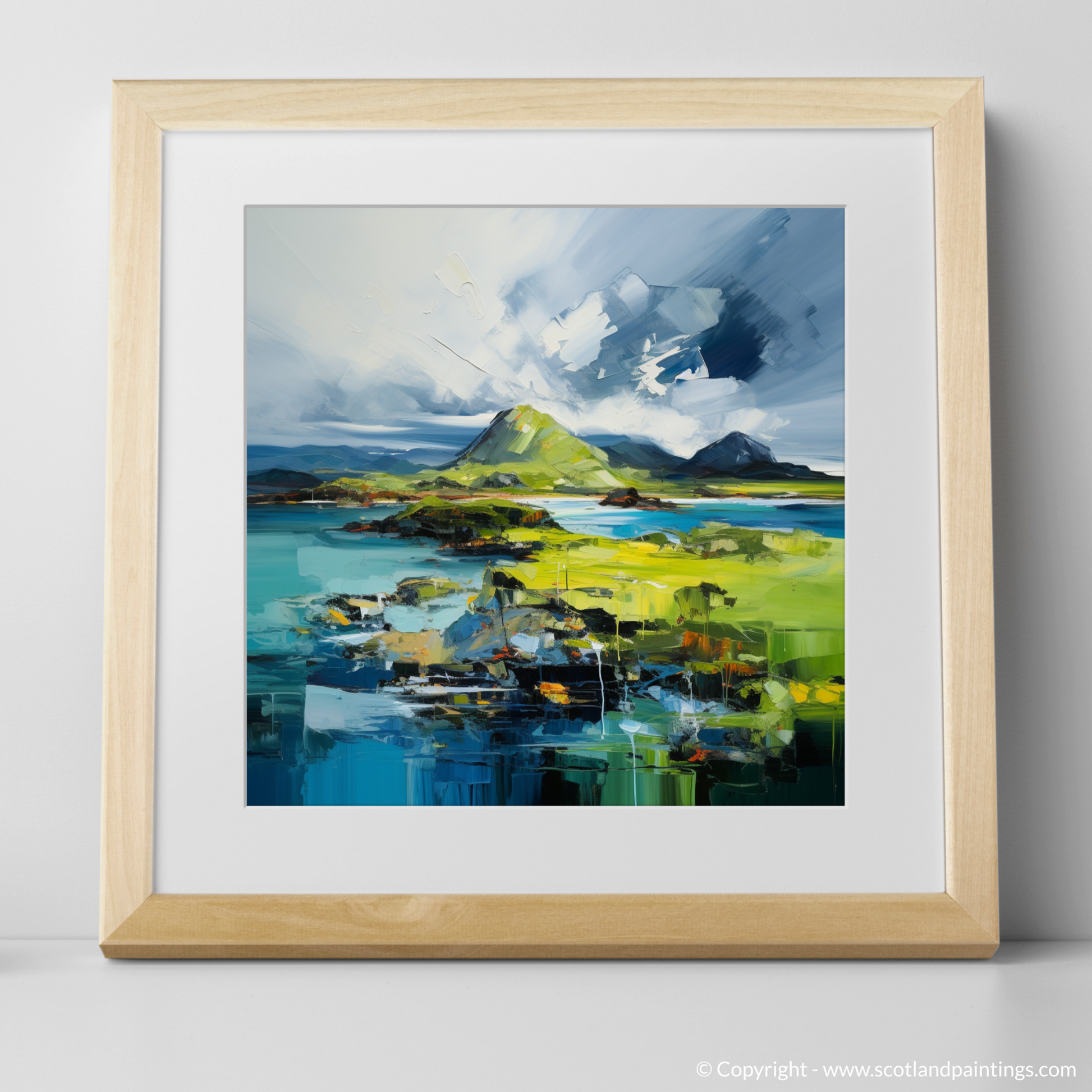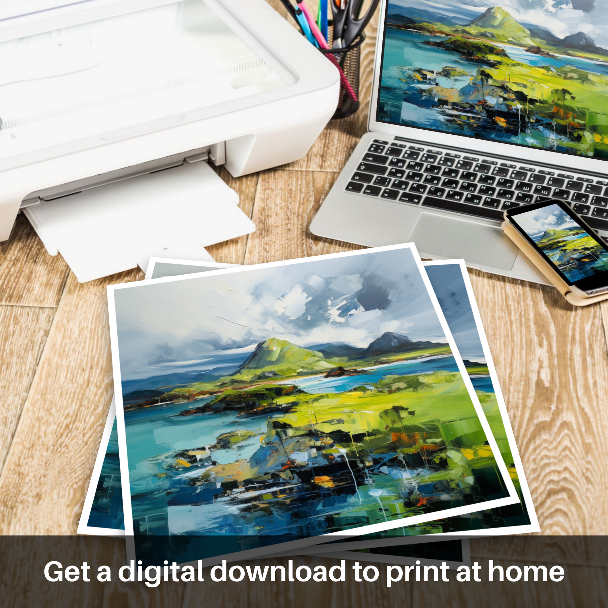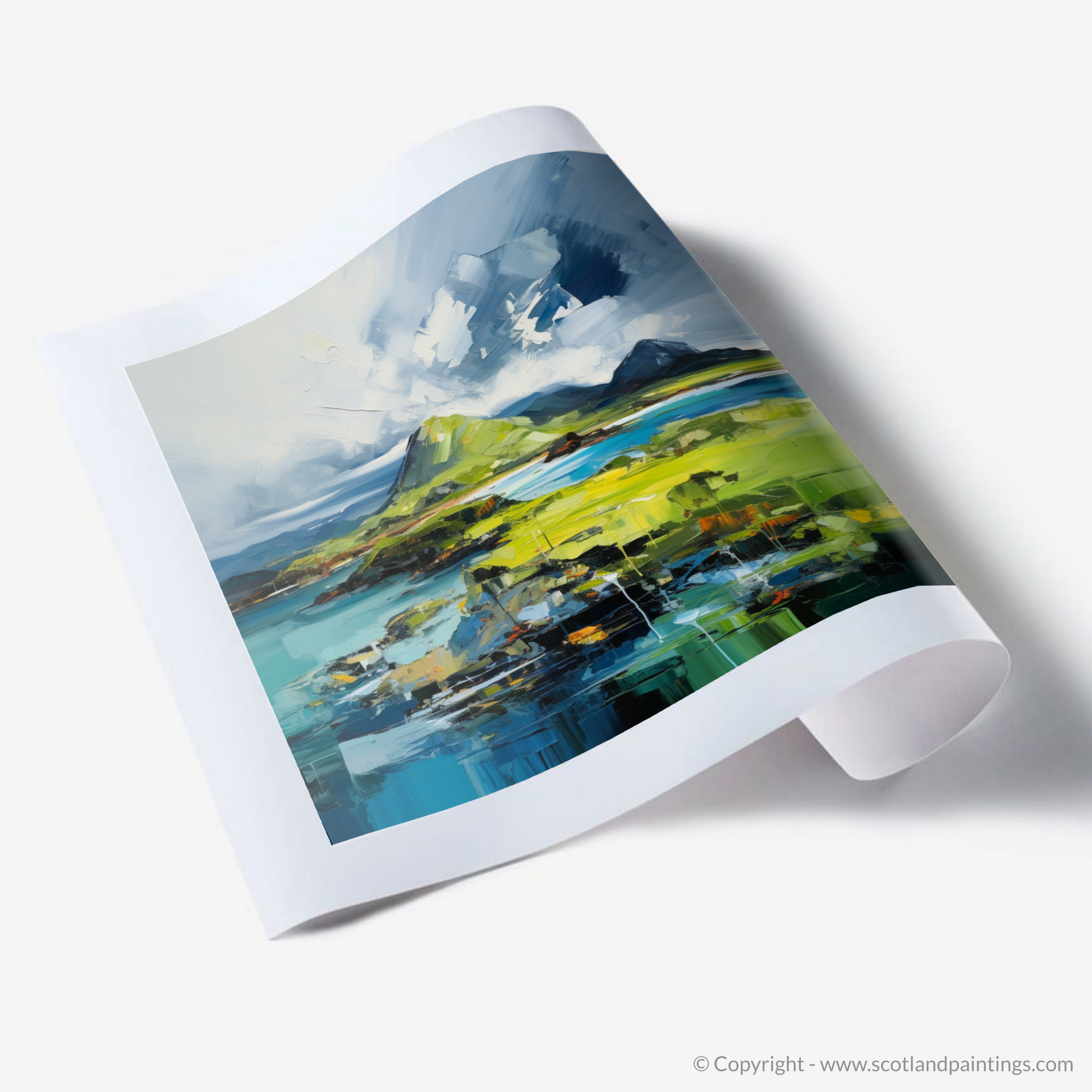 Capturing the rugged beauty of the Scottish coastline, this vivid print brings to life the distinctive landscape of the Isle of Lismore, nestled within the Inner Hebrides. With its bold, impasto strokes and a palette awash with intense hues, the artwork invites viewers on a visual journey across this enchanting isle.