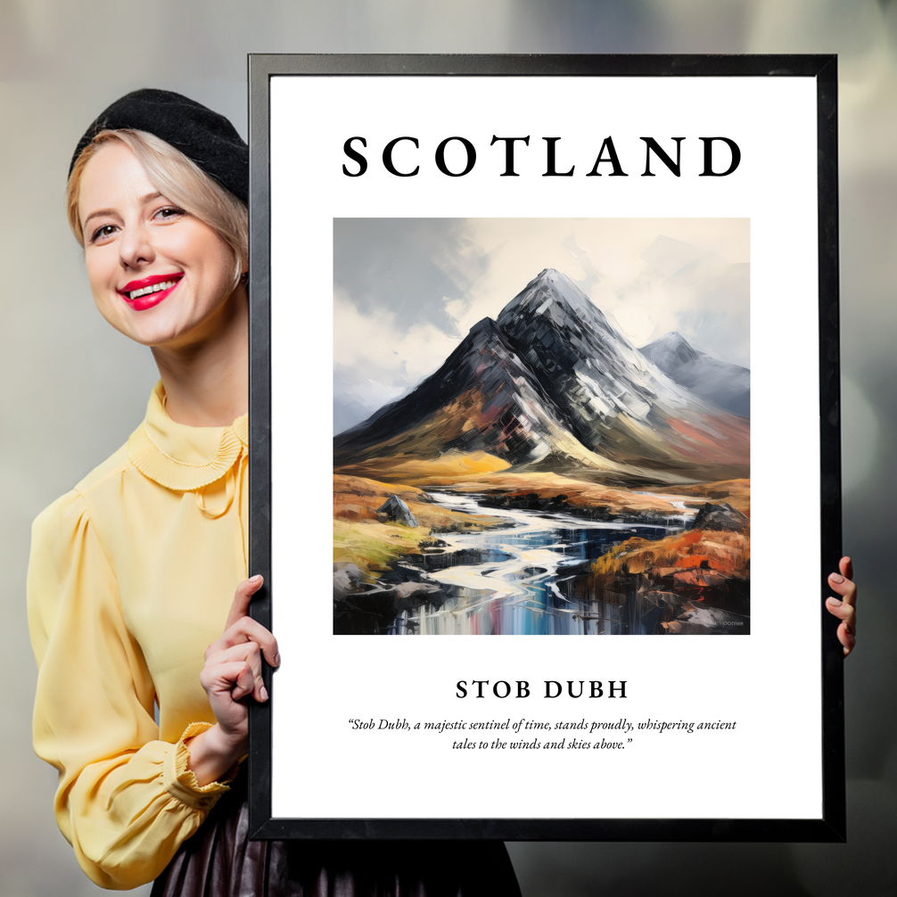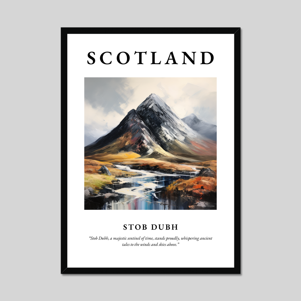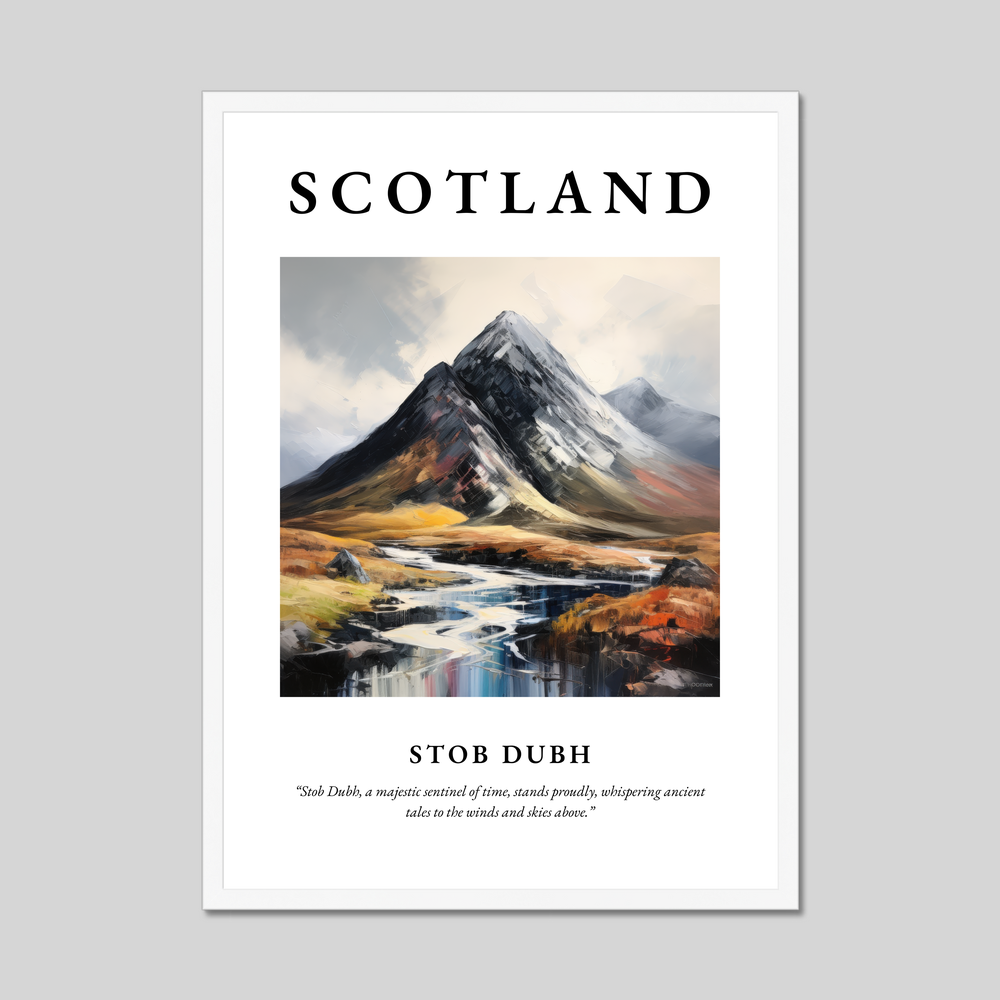 Stob Dubh, located in the iconic Glencoe region, stands as a breathtaking testament to the raw power and serene beauty of nature. Known to hikers and mountaineers as a challenging yet rewarding ascent, this mountain is a cherished symbol of Scotland’s storied landscape. The poster’s artwork captures the essence of Stob Dubh's rugged slopes and tranquil valleys, conjuring images of mist-shrouded mornings and the vibrant glow of heather-covered hills.