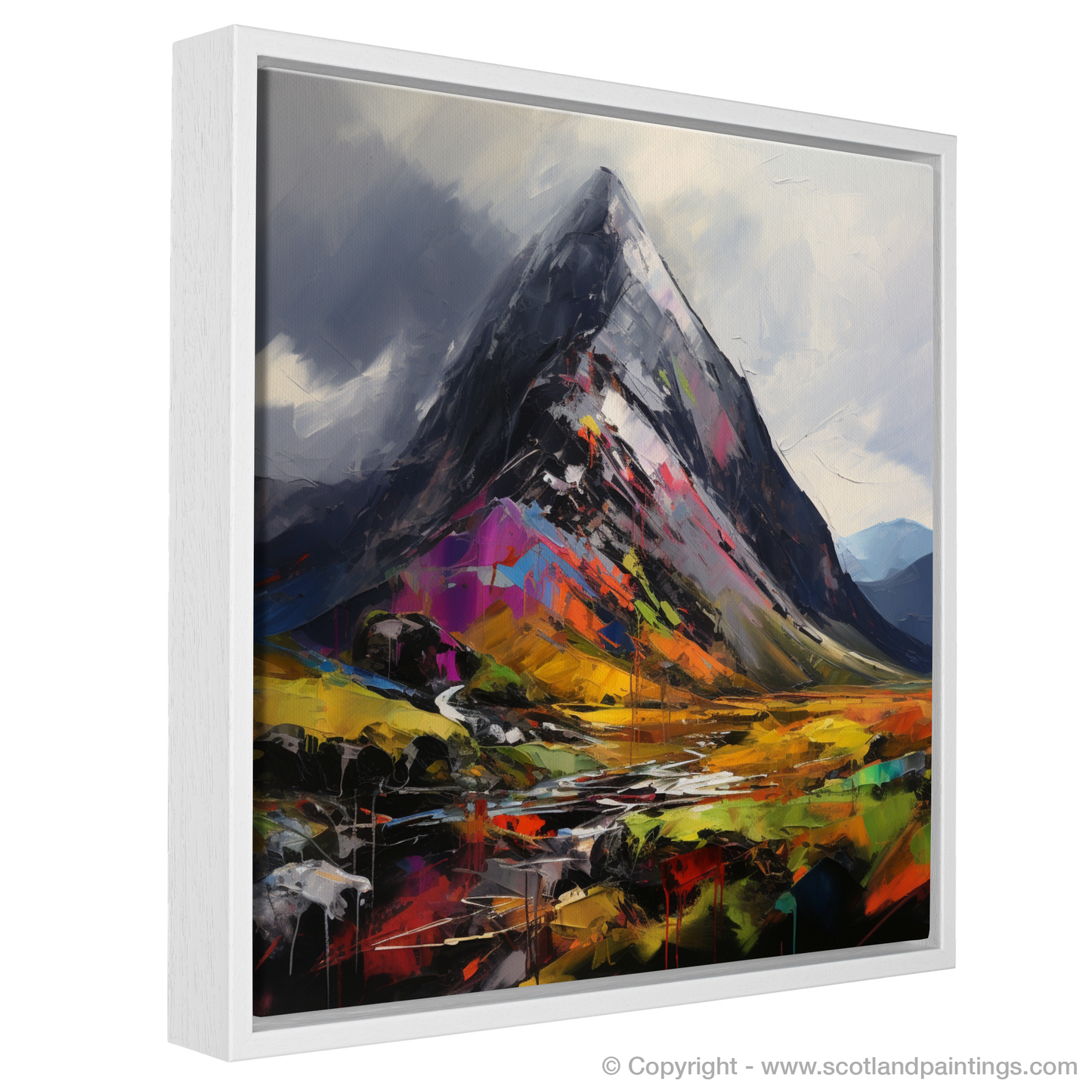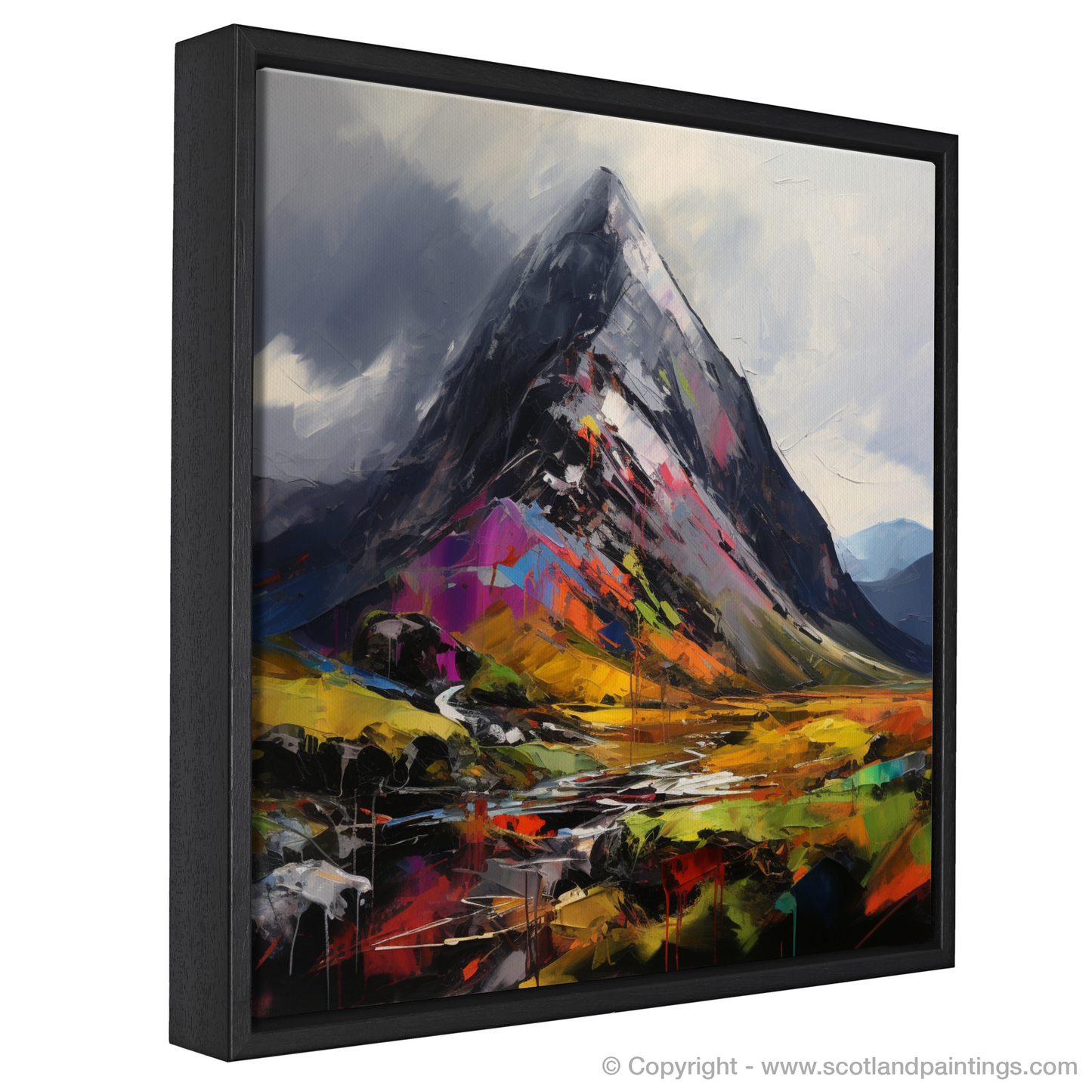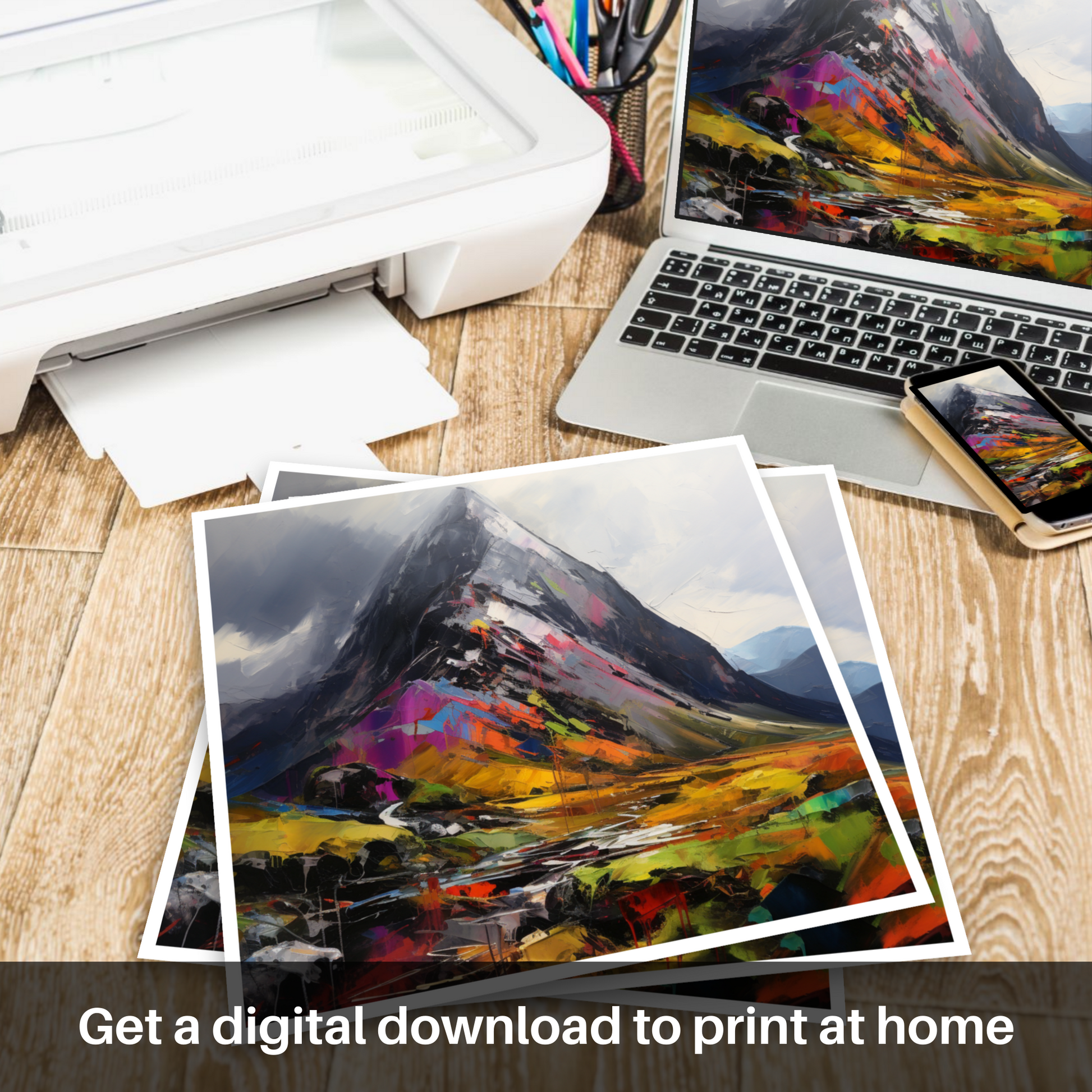Capturing the raw and untamed beauty of the Scottish Highlands, this evocative print brings the majestic Stob Dubh of Buachaille Etive Beag into your home with a vibrant swirl of expressionistic fervour. The painting pulsates with a kaleidoscope of colours, where deep purples and crimson strokes meet the intense oranges and yellows that paint the landscape, suggesting a land alive with natural beauty and dramatic contrasts.