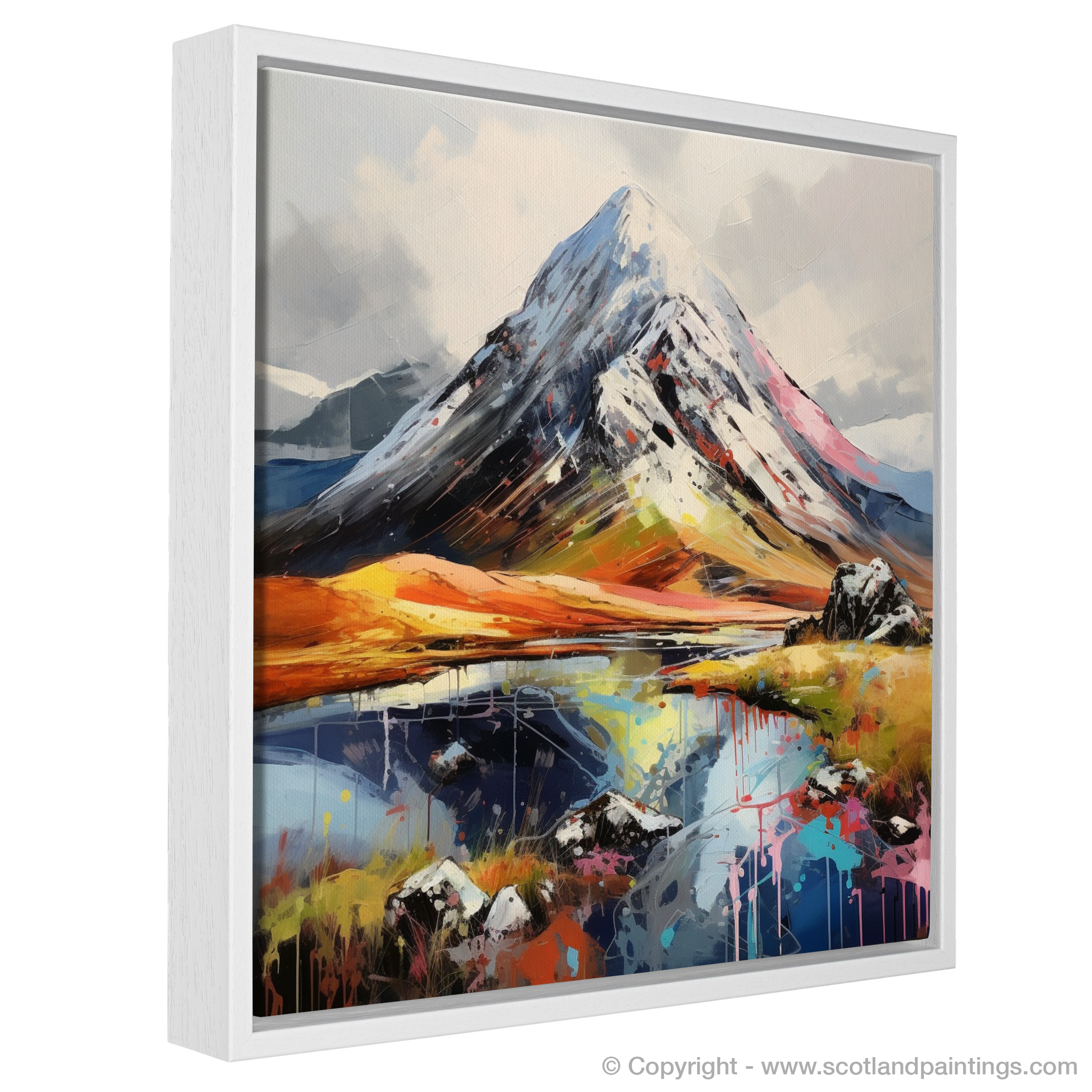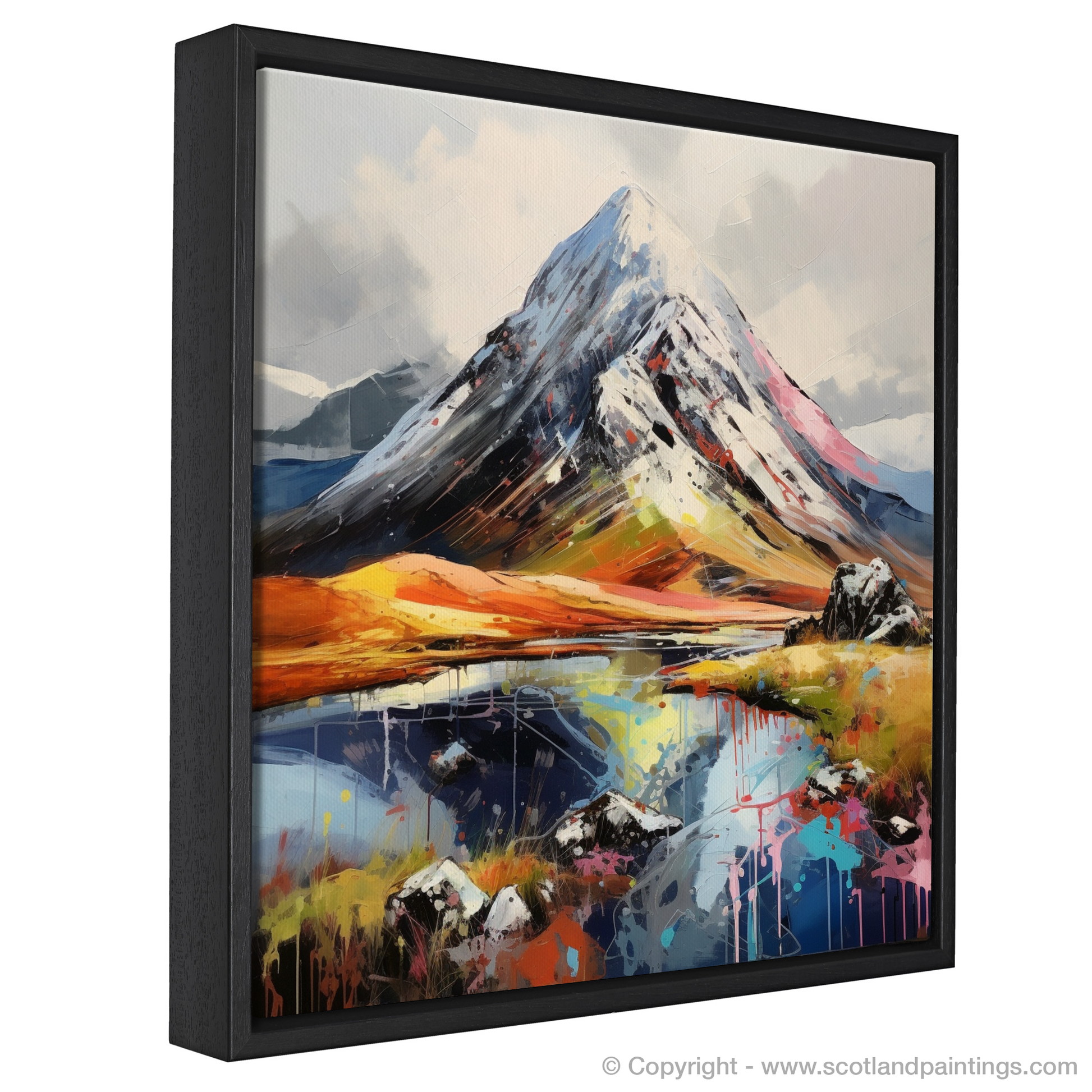Capturing the raw and majestic beauty of the Scottish Highlands, this expressionist print is an evocative tribute to Stob Dubh of Buachaille Etive Beag. The mountain, a sentinel of stone and earth, rises dramatically against a backdrop of expansive skies, its rugged slopes a tapestry of shadow and light. The artist has masterfully employed a vivid palette, with strokes of bold color that enliven the landscape and infuse the scene with an energetic vibrancy.