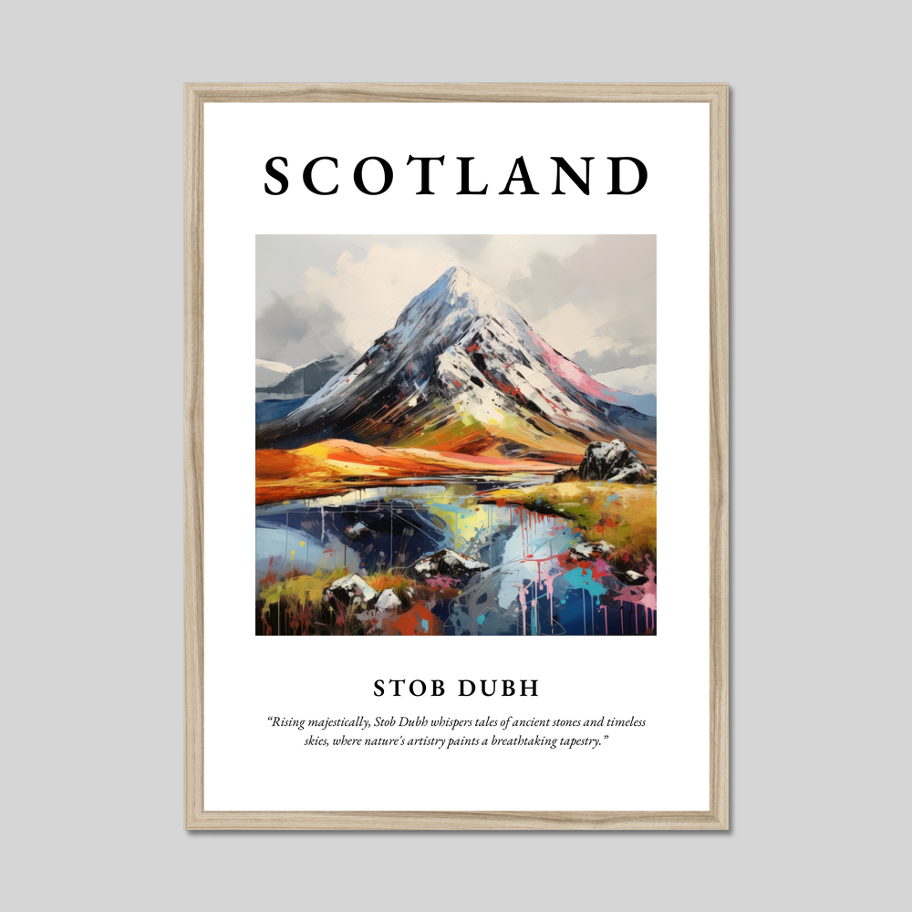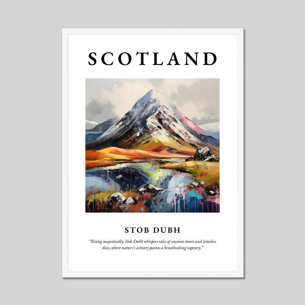 Above the painting, the word “SCOTLAND” is displayed in bold lettering, serving as a proud tribute to the land’s majestic allure. Beneath the imagery, a poetic quote dances across the surface: “Rising majestically, Stob Dubh whispers tales of ancient stones and timeless skies, where nature's artistry paints a breathtaking tapestry.” This sentiment captures the essence of the land, resonating deeply with art lovers and those enchanted by Scotland's spellbinding vistas.