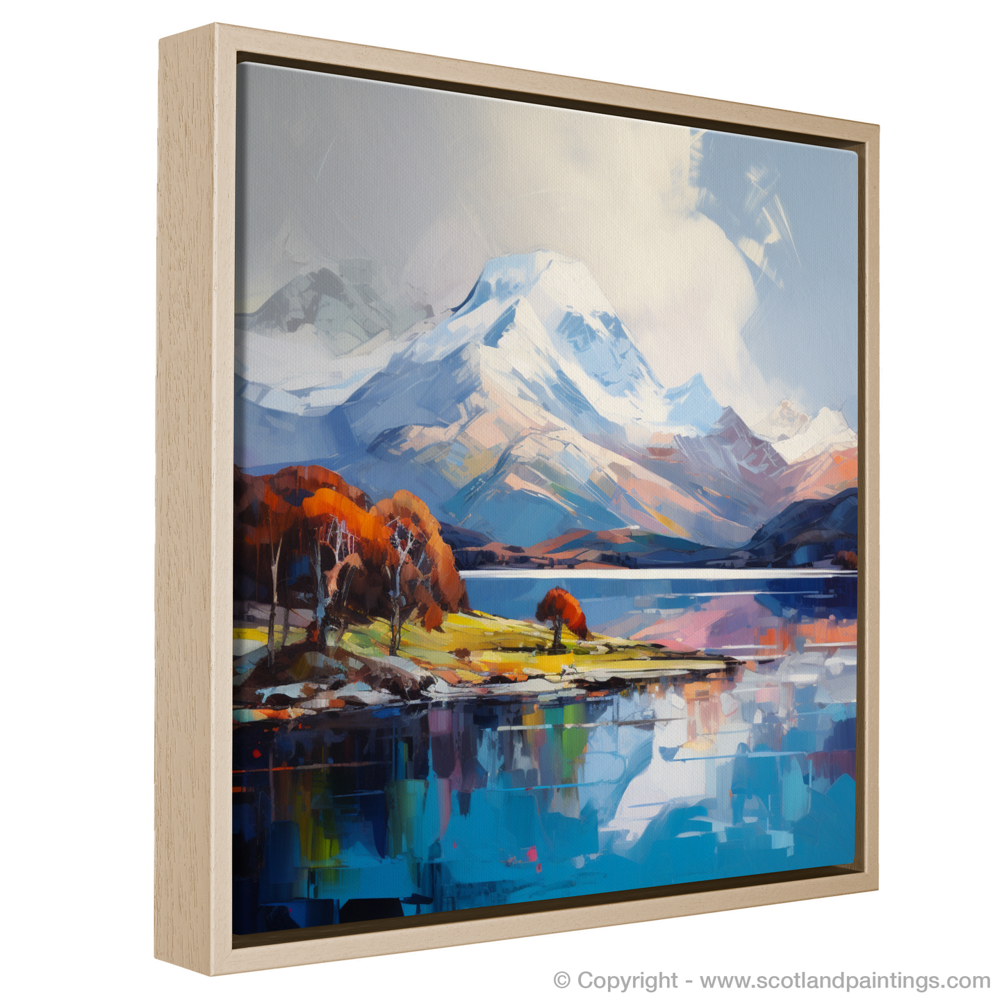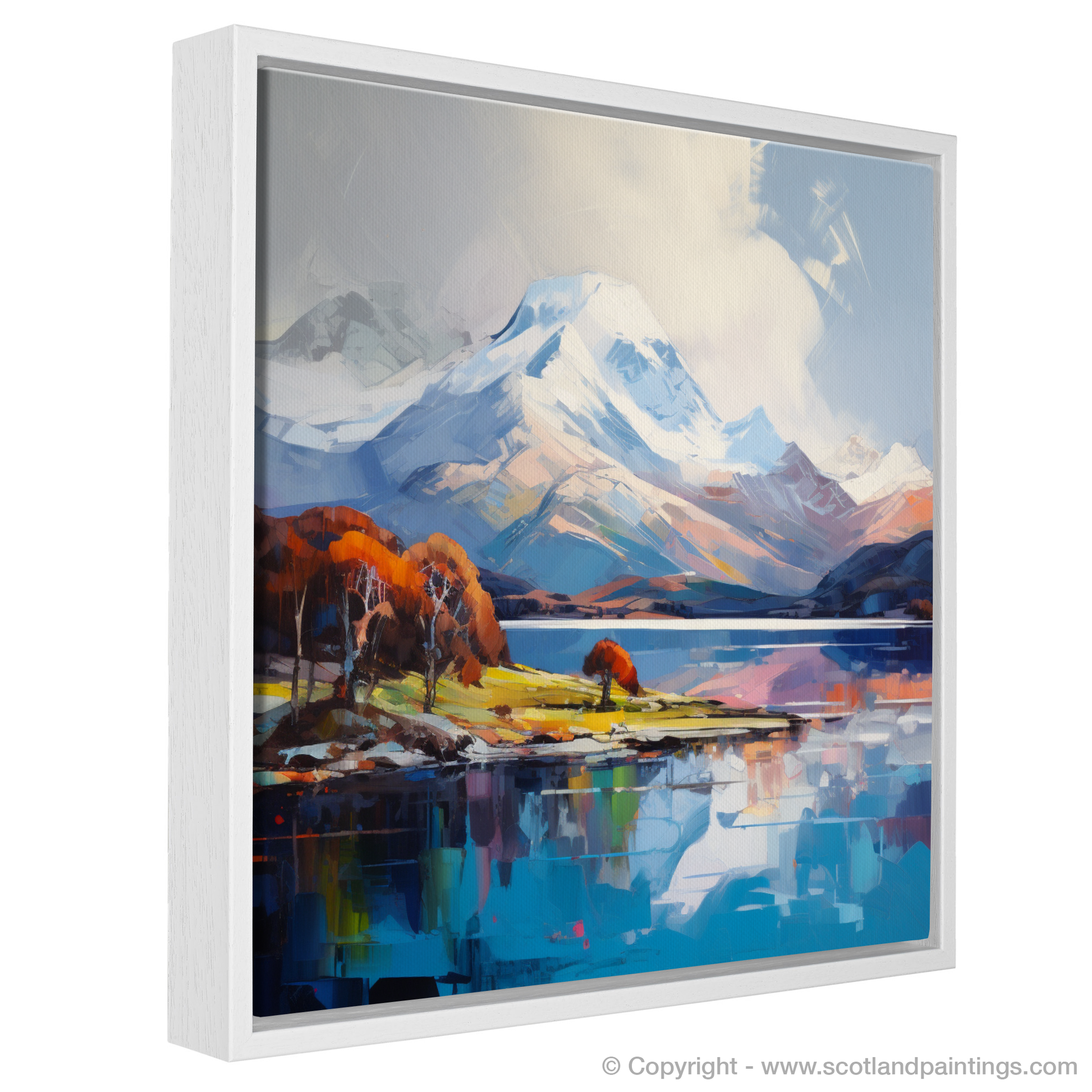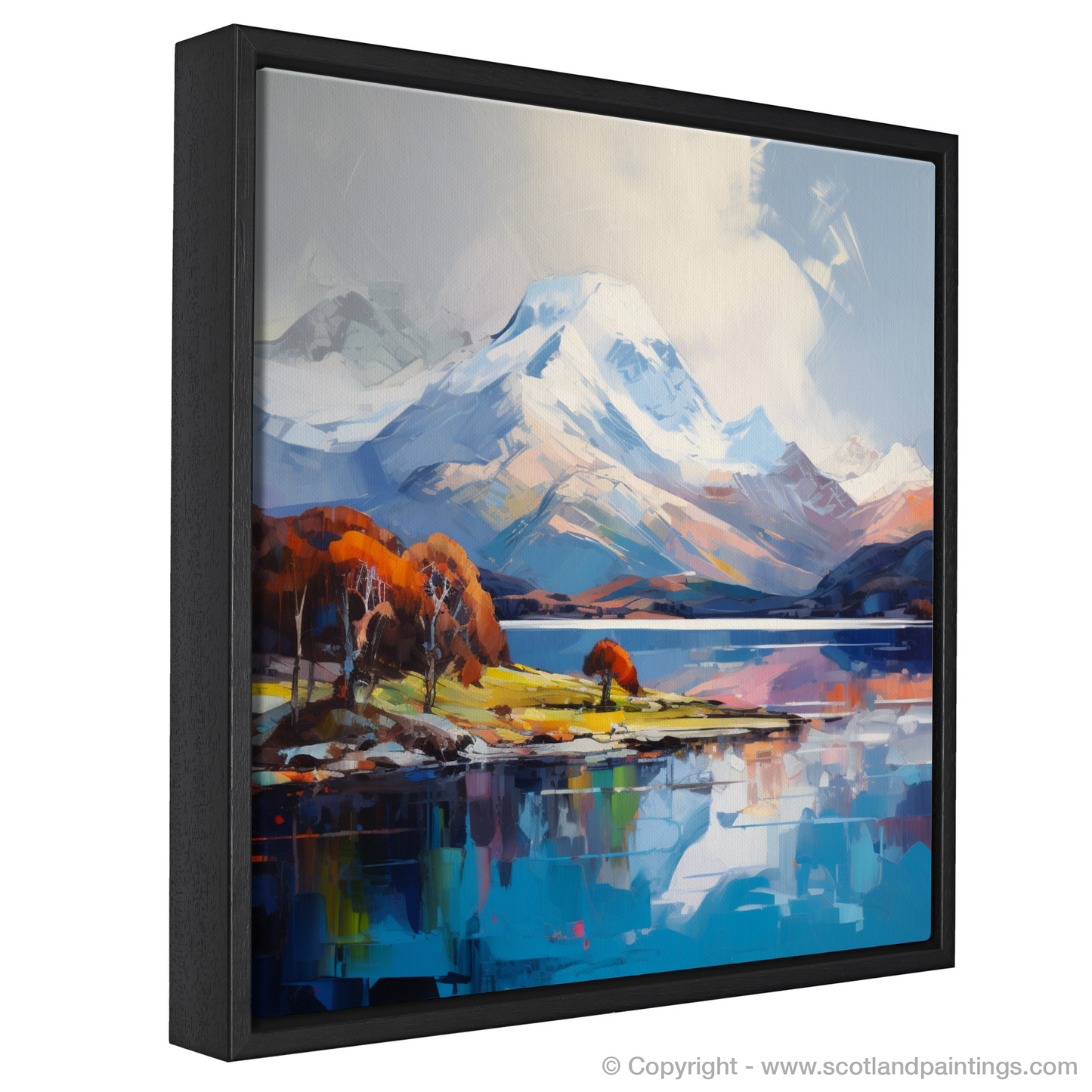 Capturing the majestic essence of Scotland's natural beauty, this expressive print presents the grandeur of snow-capped peaks standing guard over the tranquil waters of Loch Lomond. Bold brushstrokes and a vivid palette convey the dynamic interplay of light and shadow, with the frosty blues and whites of the towering mountains contrasting starkly against the warmer tones of the autumnal foliage adorning the lakeside.