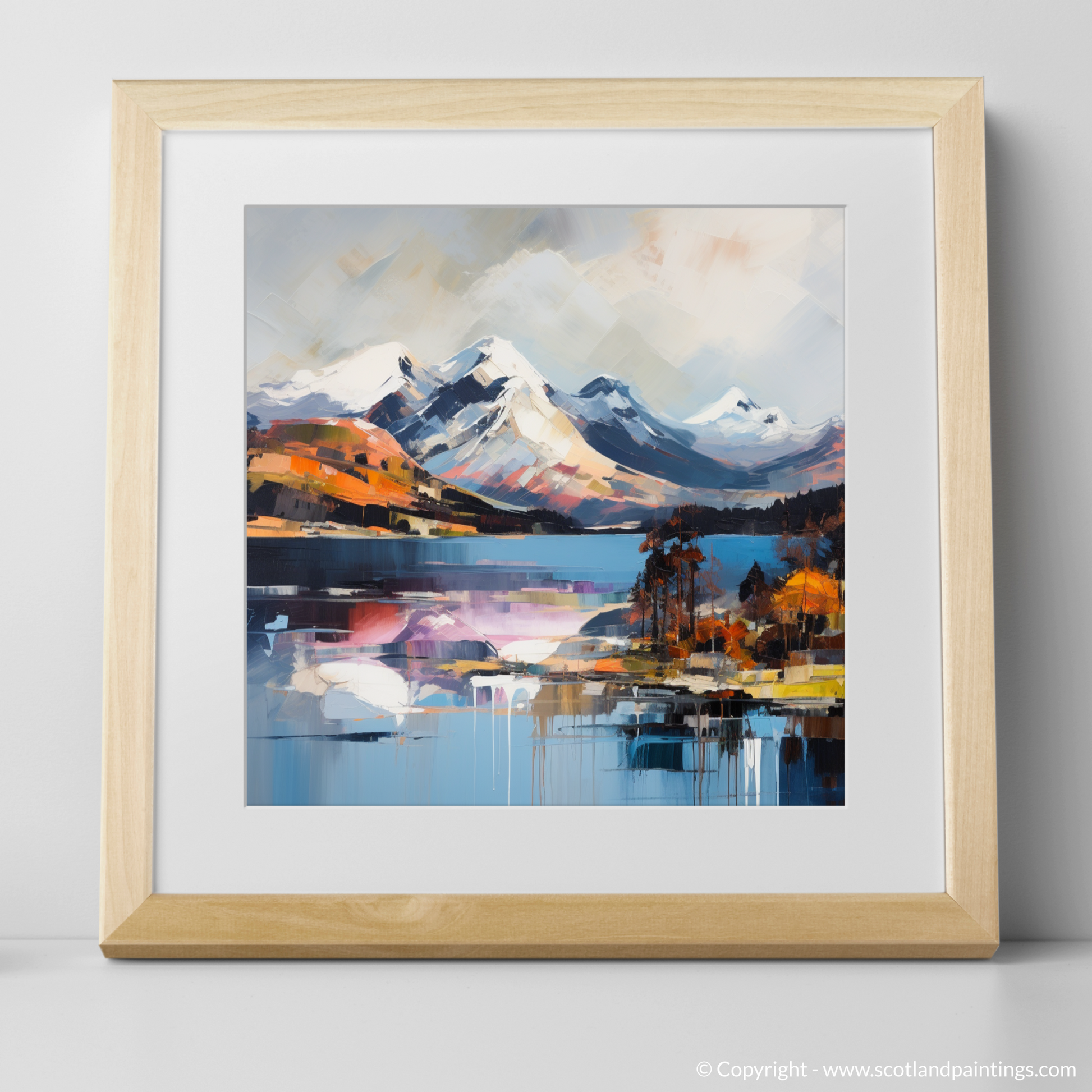 This captivating print features the majestic beauty of snow-capped peaks presiding over the serene waters of Loch Lomond. The artwork is a striking composition of bold colours and dynamic brushstrokes characteristic of Expressionism, inviting viewers to experience the Scottish landscape through a vibrant and emotional lens.