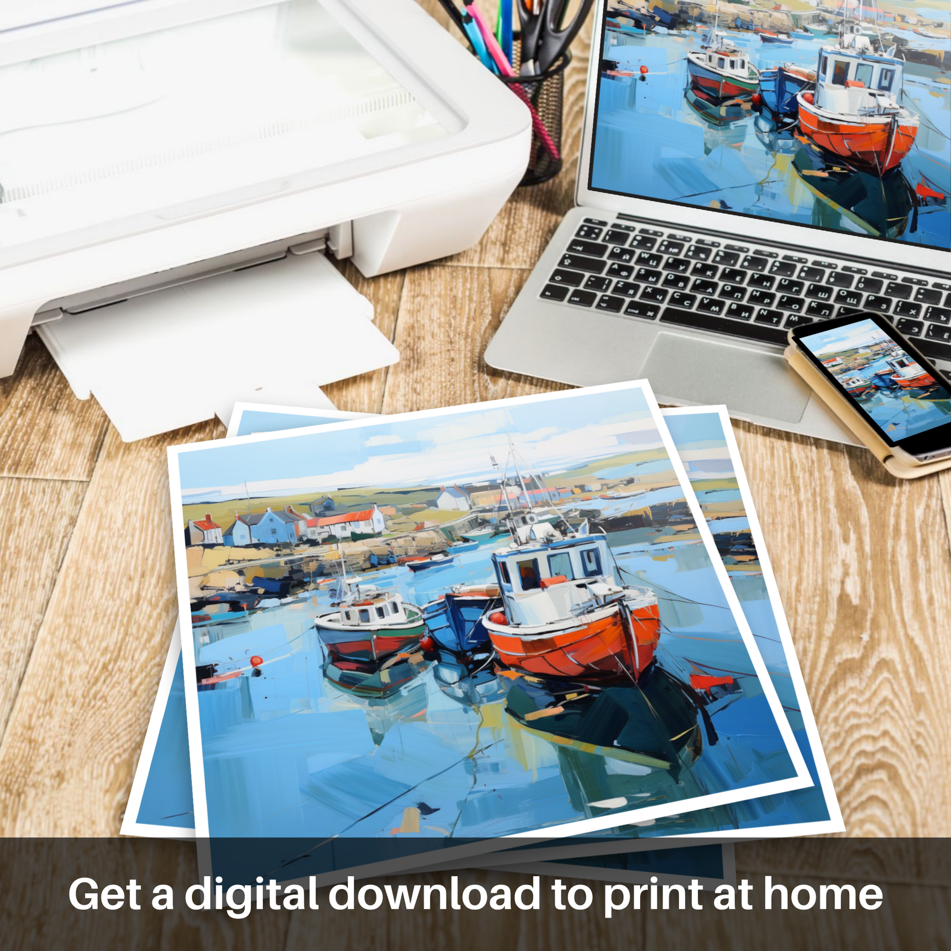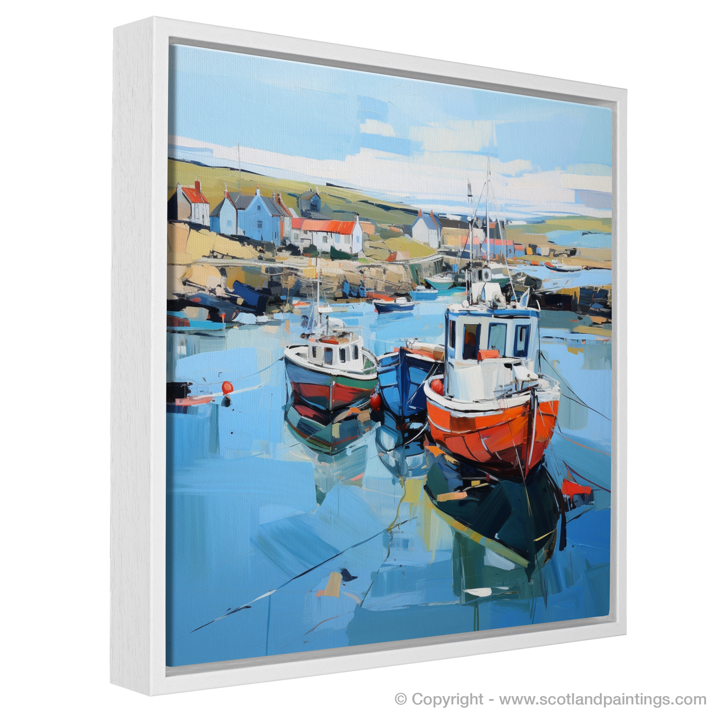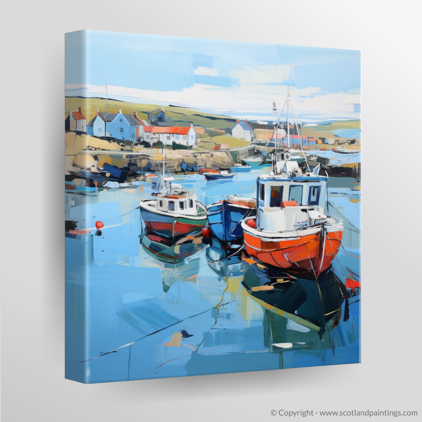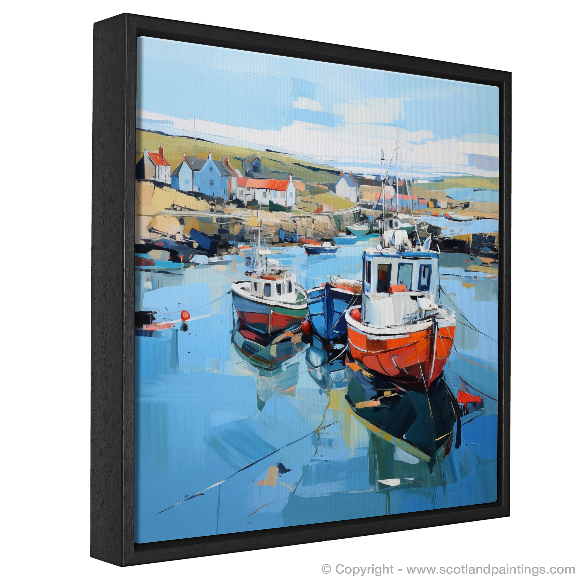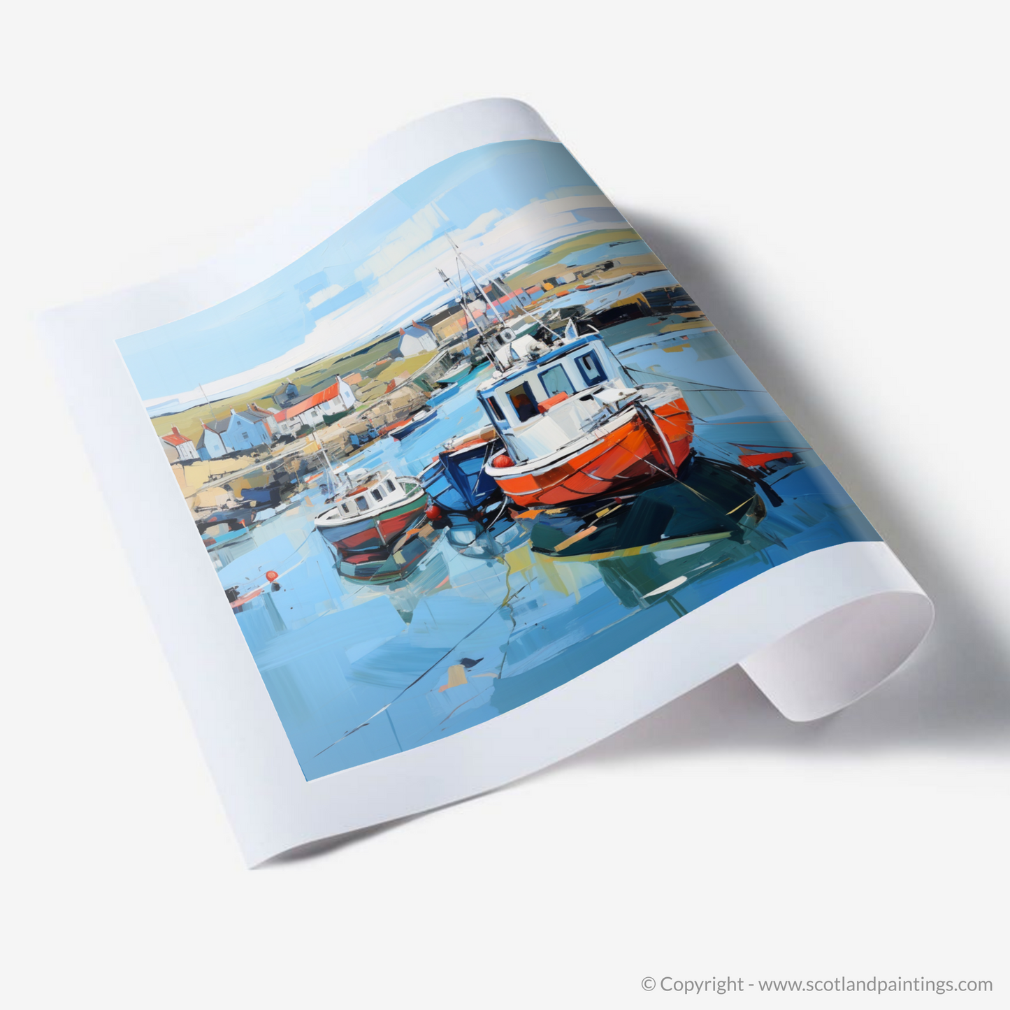 Glimpses of the serene countryside extend beyond, suggesting the natural beauty that envelops this coastal gem. Each articulated reflection and shadow in the water adds depth and a sense of realism to this inspired piece, inviting viewers to step into a world where the charm of Scotland's harbours is rendered in a symphony of colour and emotion. This print embodies the essence of the setting, inviting a contemplative appreciation of one of Scotland’s picturesque seafronts through the lens of expressionist art.