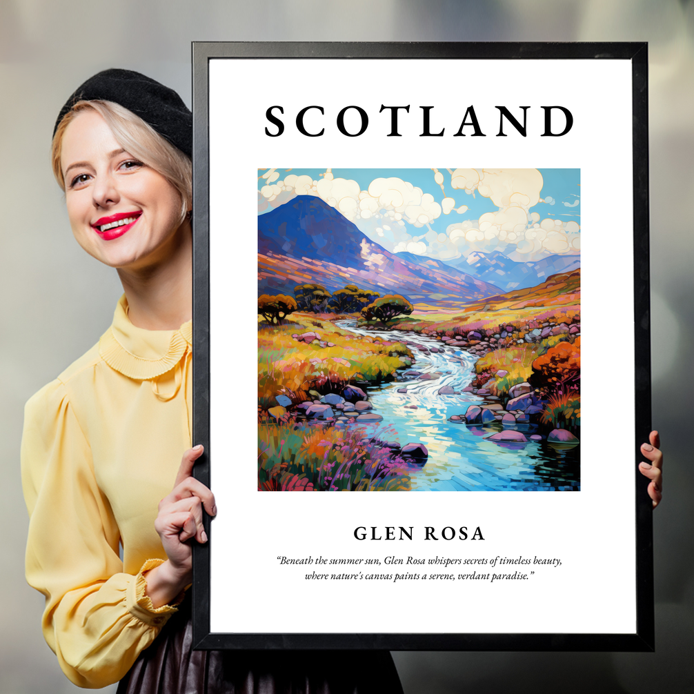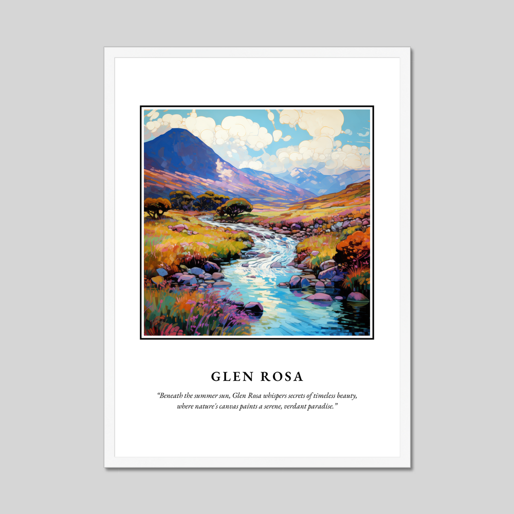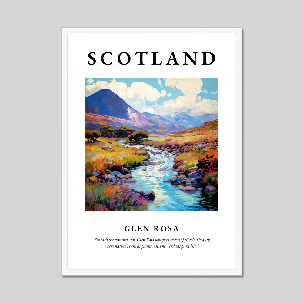 The poster begins with the word “SCOTLAND” in bold lettering at the top, setting the stage for an exquisite Impressionist painting of Glen Rosa. This vibrant artwork showcases a serene landscape, where gentle hills and a winding stream bask under a clear sky. Plush hues of greens, purples, and blues paint a vivid scene, evoking feelings of nostalgia and admiration for the timeless beauty of the Highlands. Beneath the painting, the quote, “Beneath the summer sun, Glen Rosa whispers secrets of timeless beauty, where nature's canvas paints a serene, verdant paradise,” captures the essence of this idyllic locale.