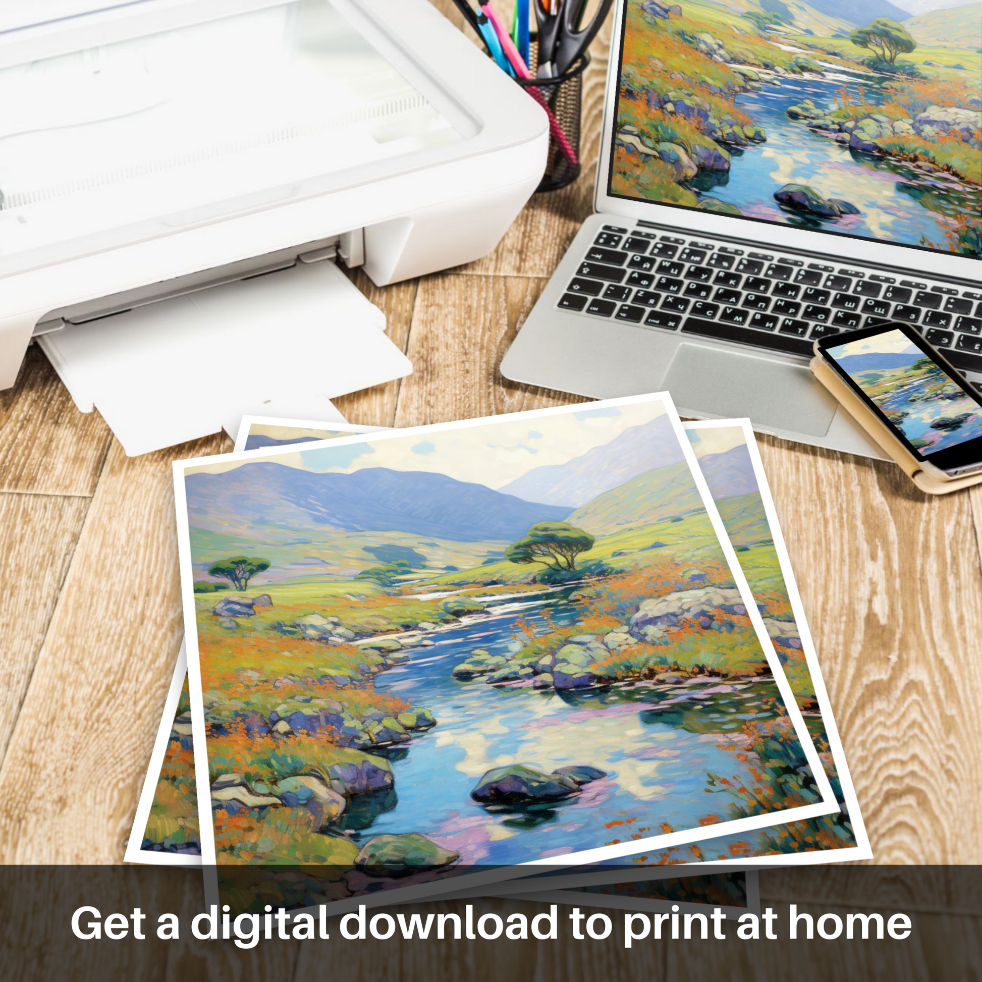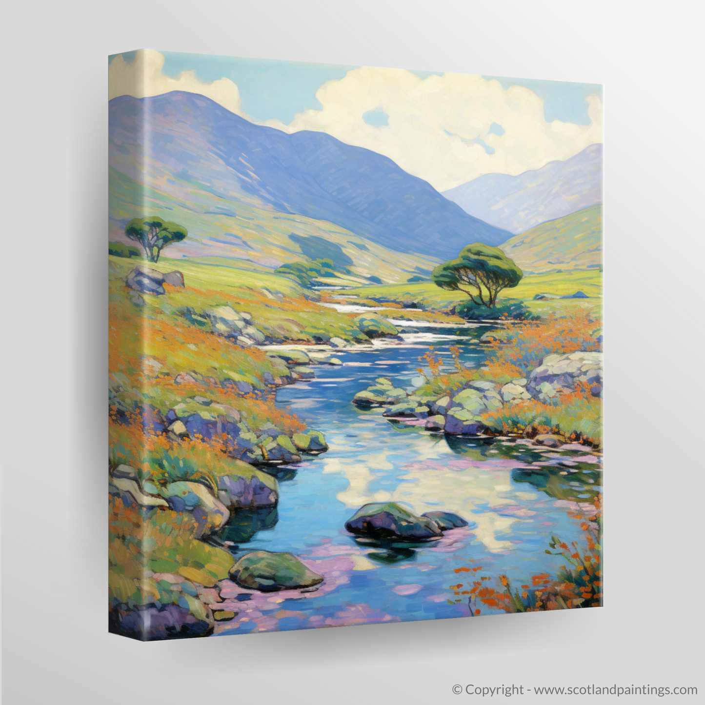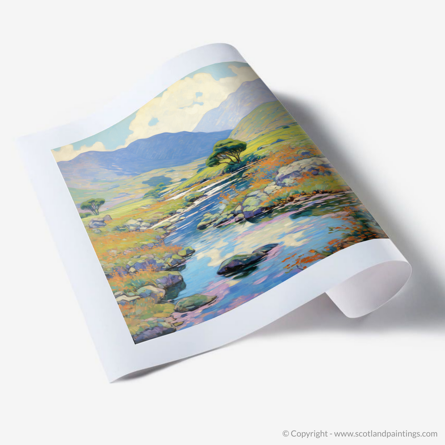 The composition, while rooted in the immediacy of the fleeting moment, also speaks to the timeless and enduring spirit of Scotland's natural beauty. This print is a celebration of summer's splendour, an invitation to sink into the spell of the Scottish outdoors, and a perfect addition to any space that cherishes the allure of nature and the brushstrokes of Impressionism.