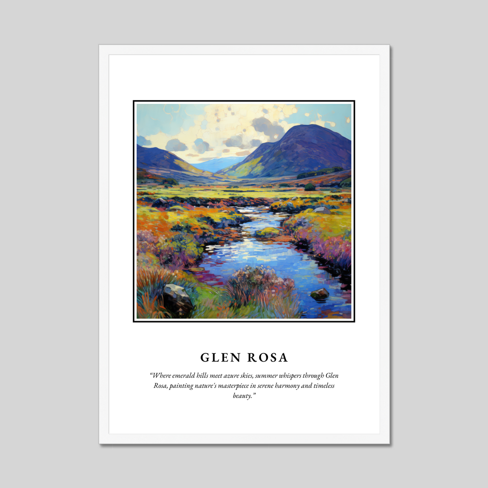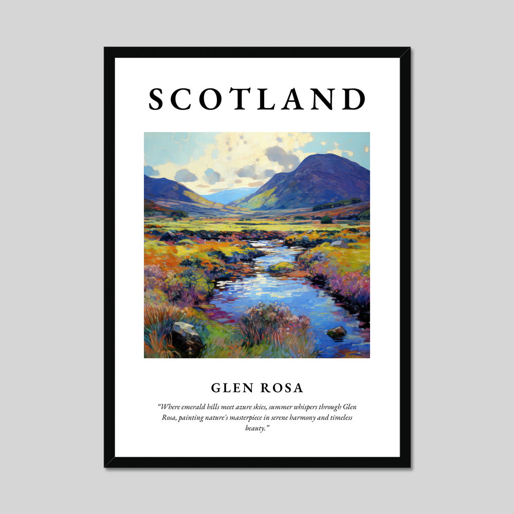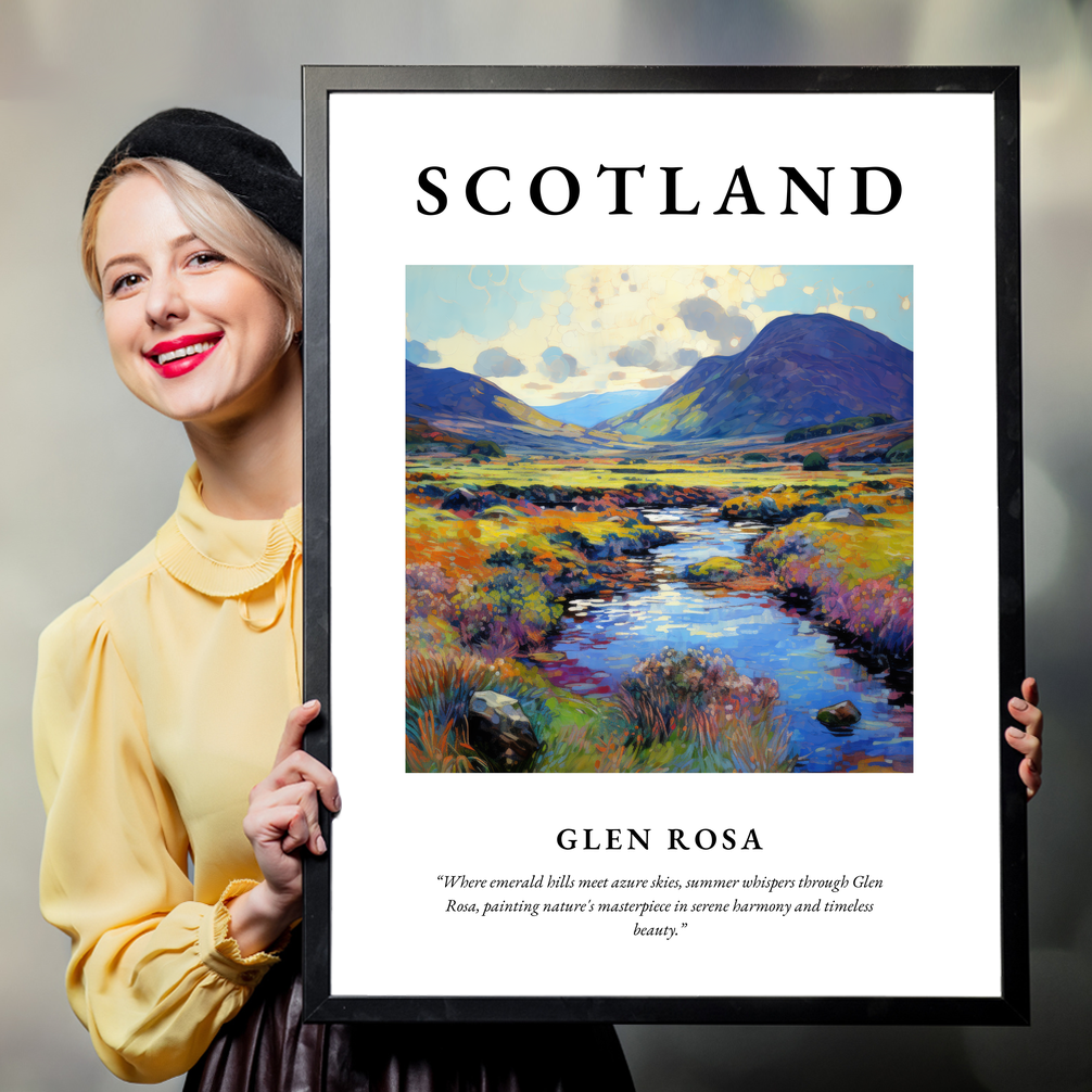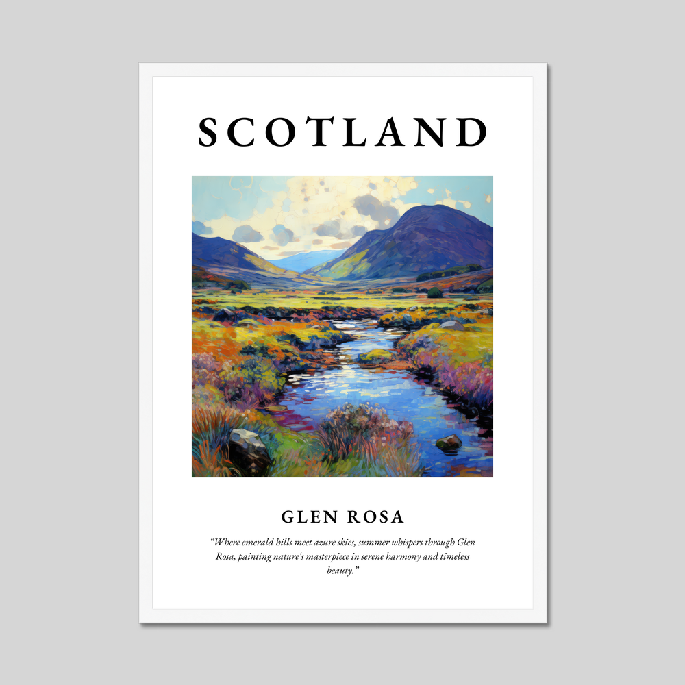 The poster's design features the iconic word “SCOTLAND” boldly emblazoned at the top, capturing immediate attention. Below it, an evocative painting of Glen Rosa comes alive, inviting viewers into a world where emerald hills blend seamlessly with azure skies. The gentle subtleties of summer paint a vibrant, harmoniously serene landscape, completing this masterpiece with a poetic quote beneath: “Where emerald hills meet azure skies, summer whispers through Glen Rosa, painting nature's masterpiece in serene harmony and timeless beauty.”