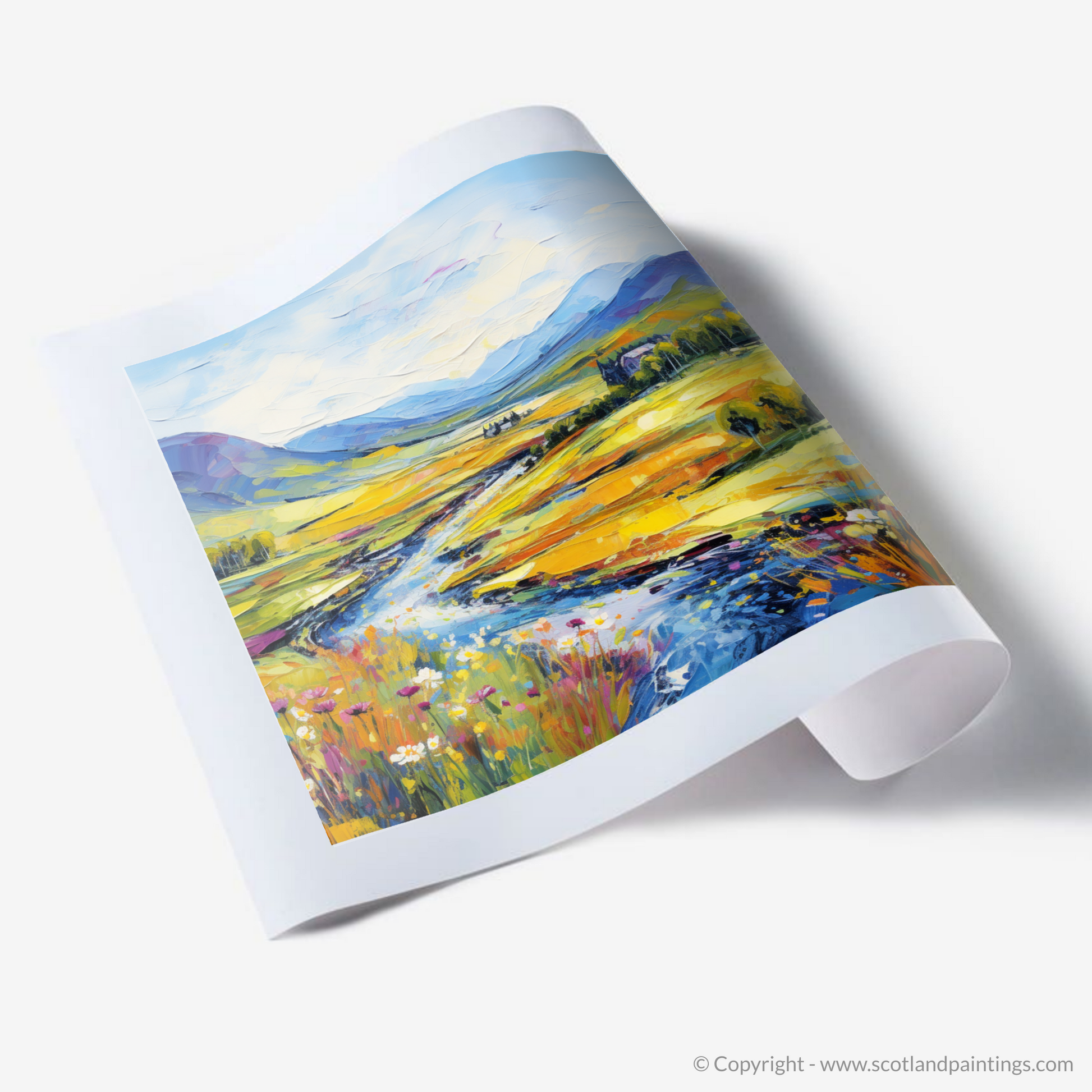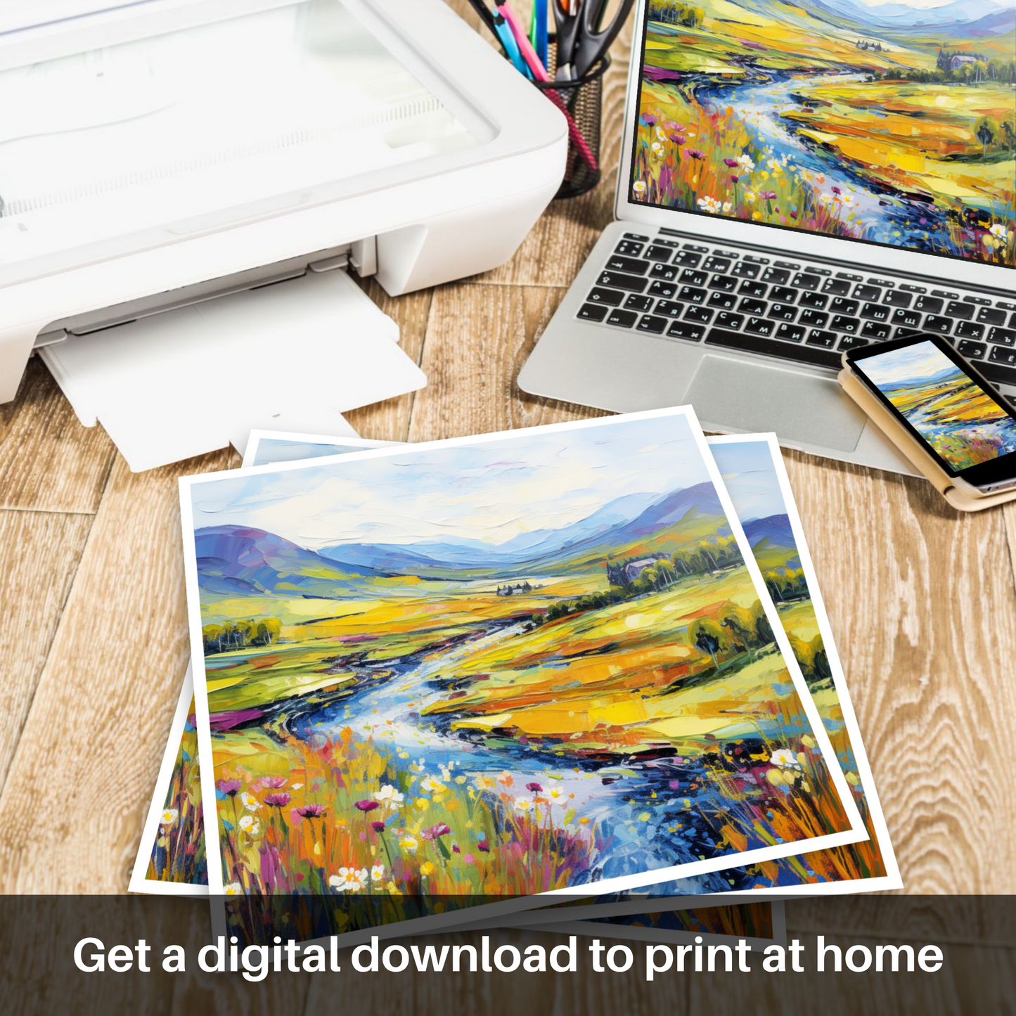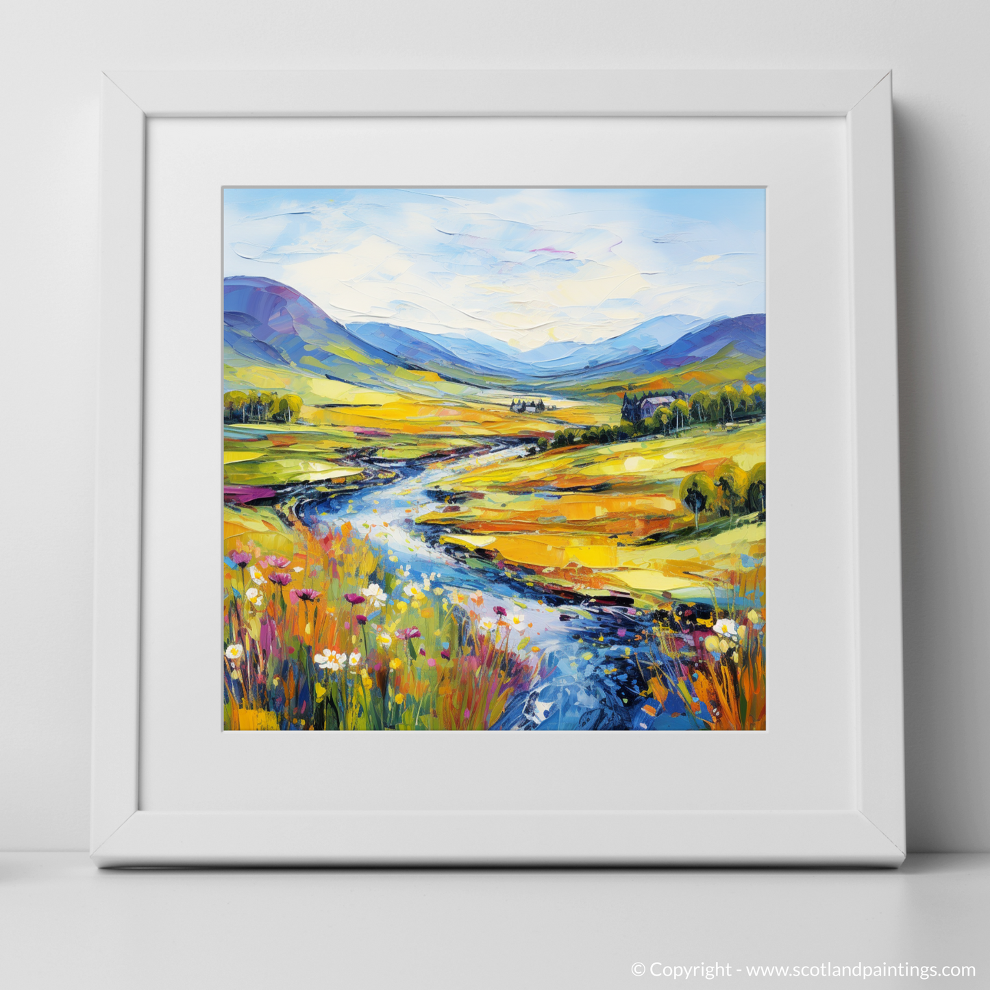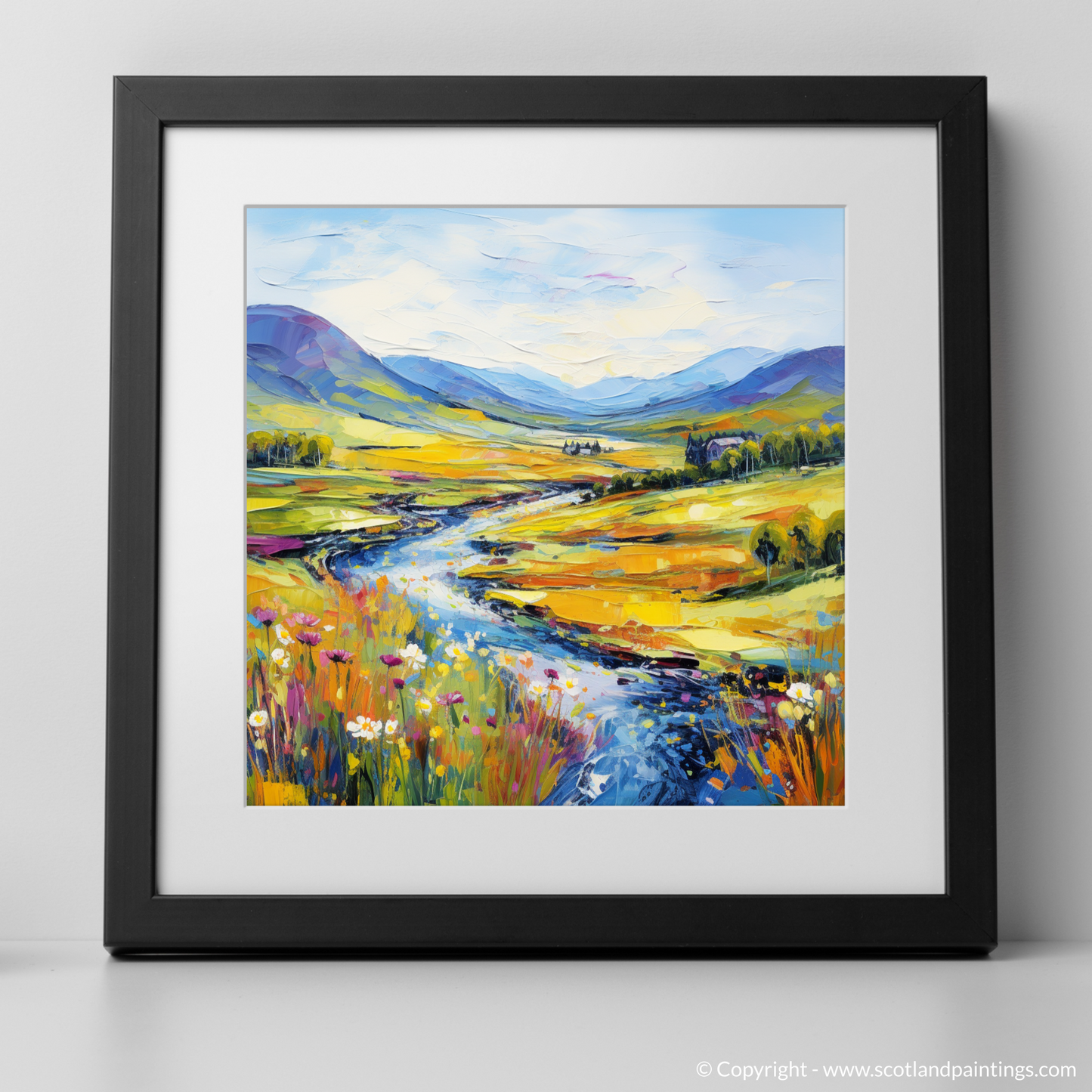 Capturing the essence of the Glen Feshie, this vibrant print brings the Scottish Highlands' summer beauty into your living space. Bold, sweeping brush strokes and a rich palette of yellow, green and blue hues evoke the wild, untamed scenery, while touches of pink and white among the fields suggest wildflowers in bloom. The meandering river, rendered in vivid shades of cerulean and aquamarine, draws the eye through the composition, reflecting the vast, open skies and dynamic cloud formations above. Rolling hills and scattered woodland create a tapestry of natural grandeur, inviting the viewer to step into a world where the splendour of Scotland's summer is eternal. The distant cottages nestled among the trees offer a hint of human presence, a tranquil homage to the harmony of nature and civilisation in this picturesque setting. This impressionistic print is a statement piece that will undoubtedly become a point of conversation, instilling a sense of serenity and the wild freedom of the Scottish landscape within your home.