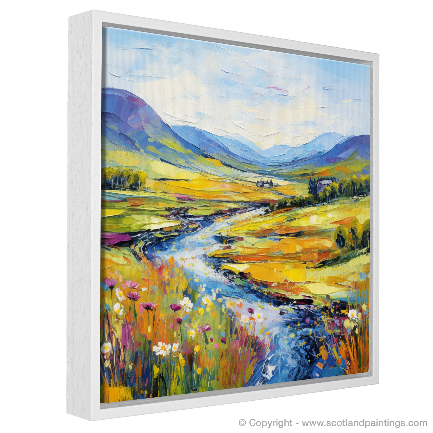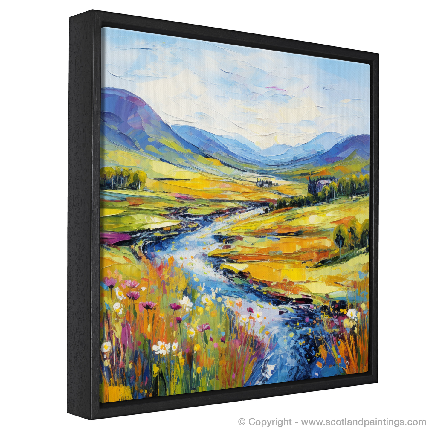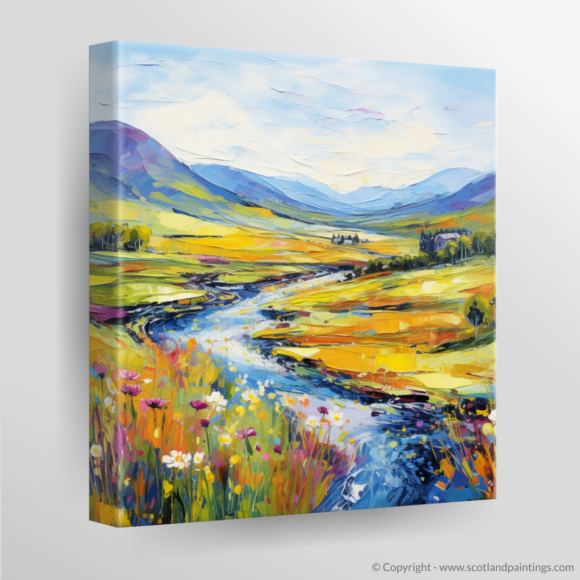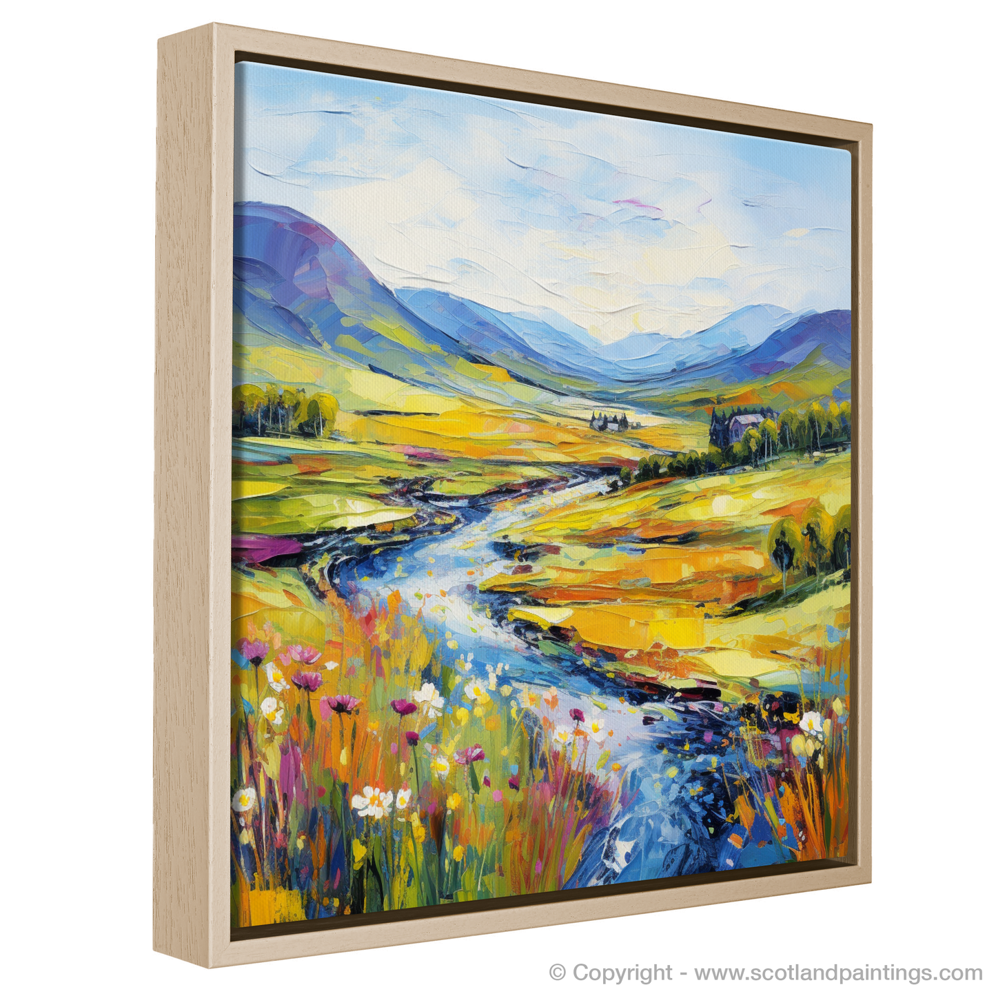 Capturing the essence of the Glen Feshie, this vibrant print brings the Scottish Highlands' summer beauty into your living space. Bold, sweeping brush strokes and a rich palette of yellow, green and blue hues evoke the wild, untamed scenery, while touches of pink and white among the fields suggest wildflowers in bloom. The meandering river, rendered in vivid shades of cerulean and aquamarine, draws the eye through the composition, reflecting the vast, open skies and dynamic cloud formations above. Rolling hills and scattered woodland create a tapestry of natural grandeur, inviting the viewer to step into a world where the splendour of Scotland's summer is eternal. The distant cottages nestled among the trees offer a hint of human presence, a tranquil homage to the harmony of nature and civilisation in this picturesque setting. This impressionistic print is a statement piece that will undoubtedly become a point of conversation, instilling a sense of serenity and the wild freedom of the Scottish landscape within your home.