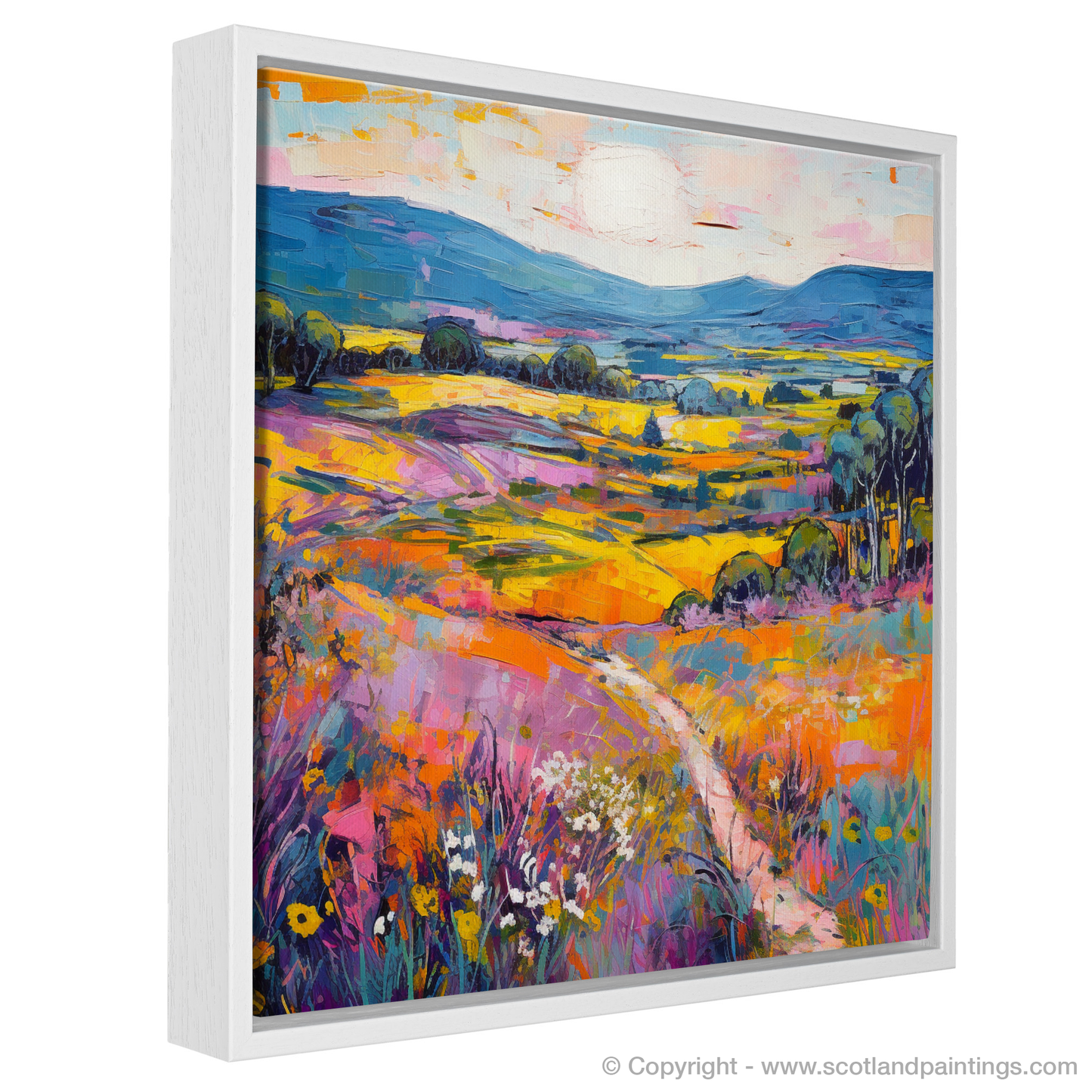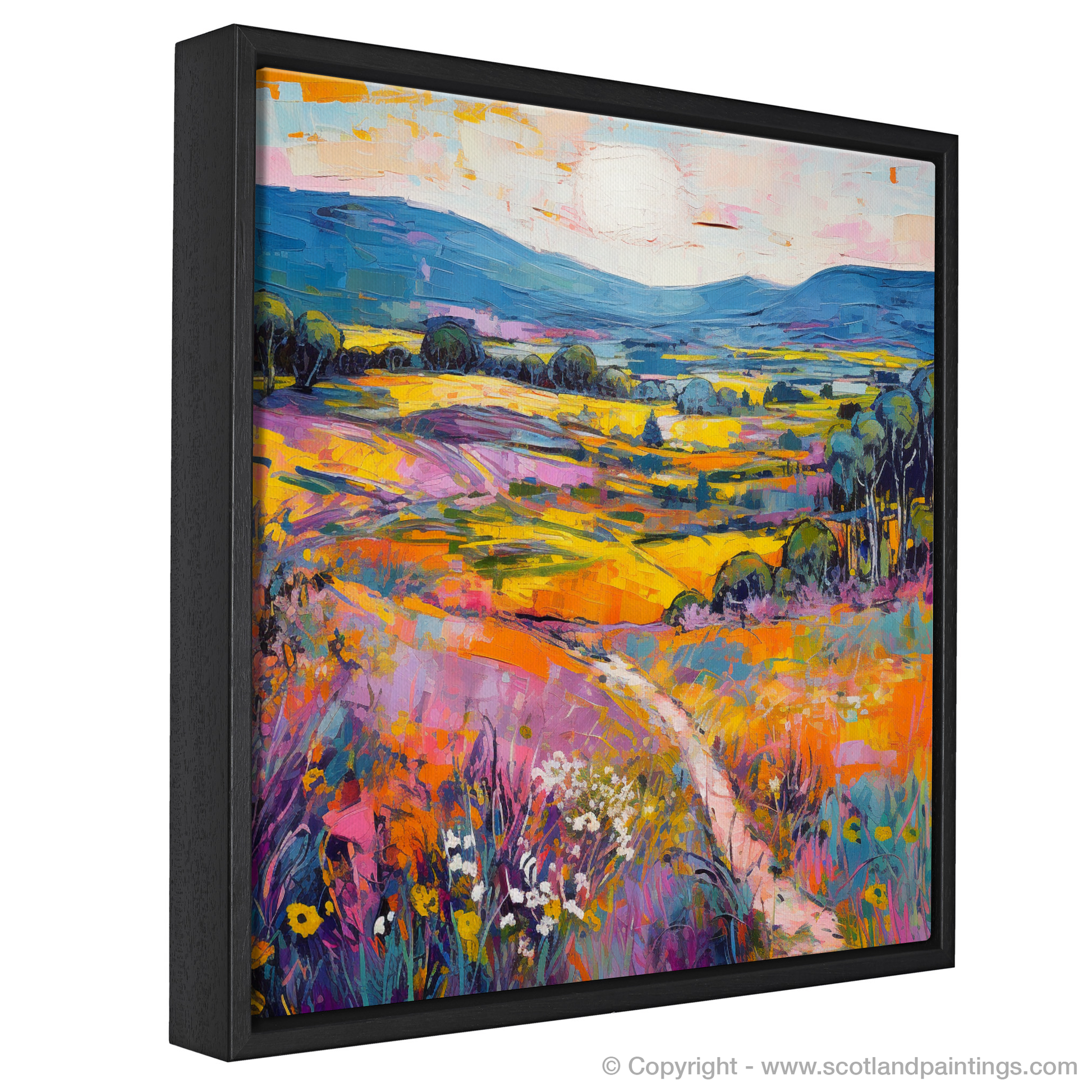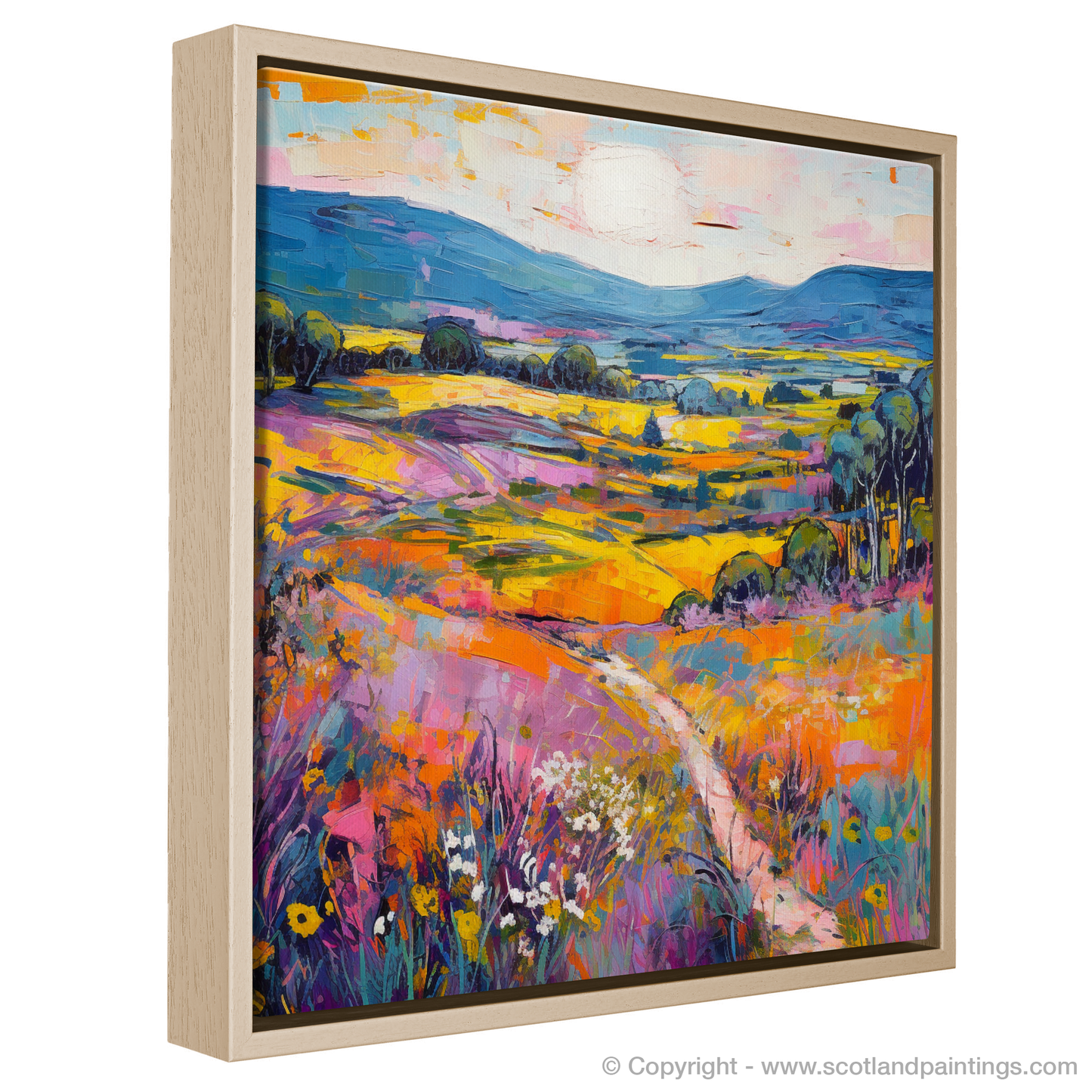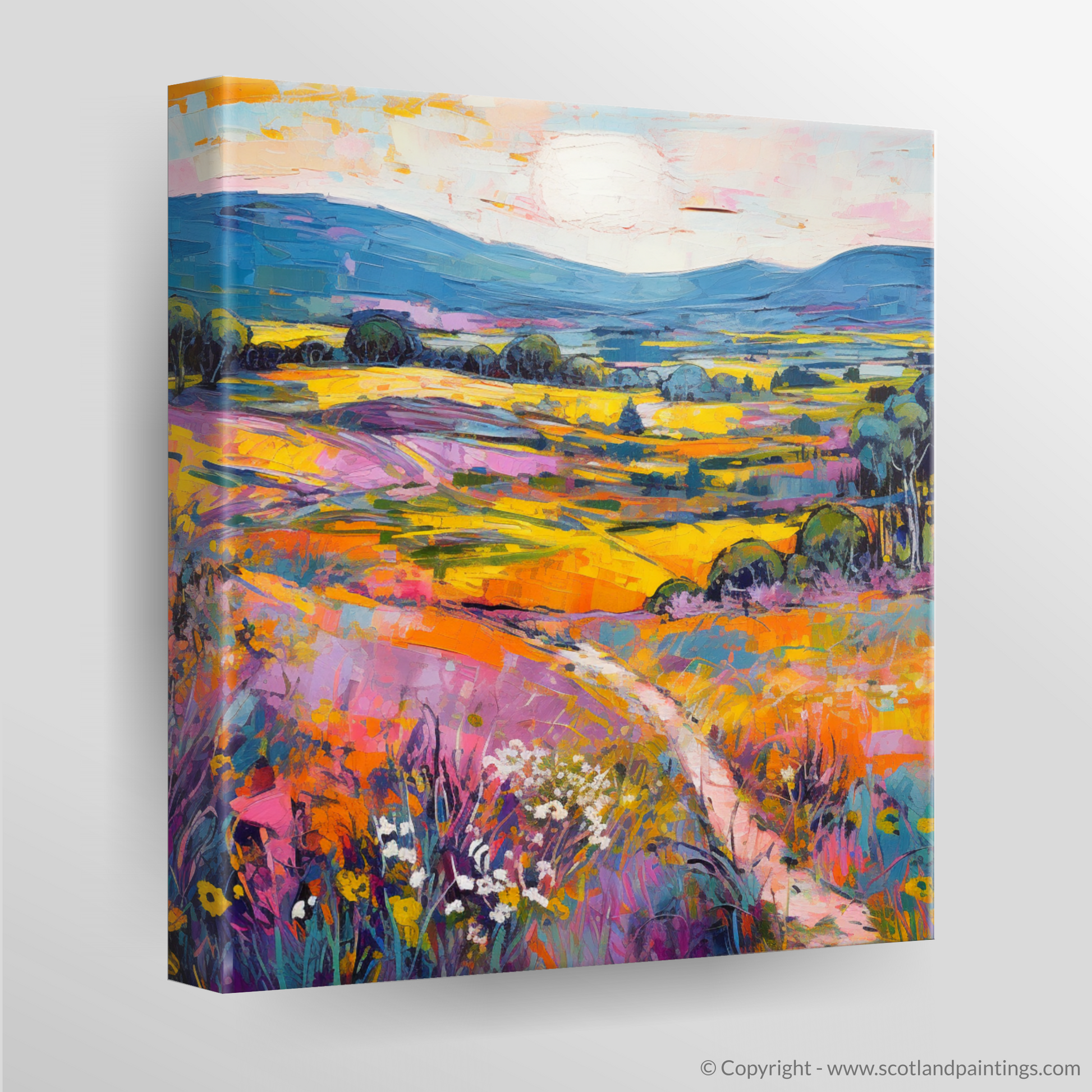 Capturing the effervescent glow of a summer's day in Aberdeenshire, this vibrant abstract print brings to life the essence of Glen Tanar with a bold and warm palette. Lavish strokes of orange, pink, and yellow stretch across the canvas, suggesting wildflower meadows in full bloom, dancing under the soft light of a sun veiled by wispy clouds.