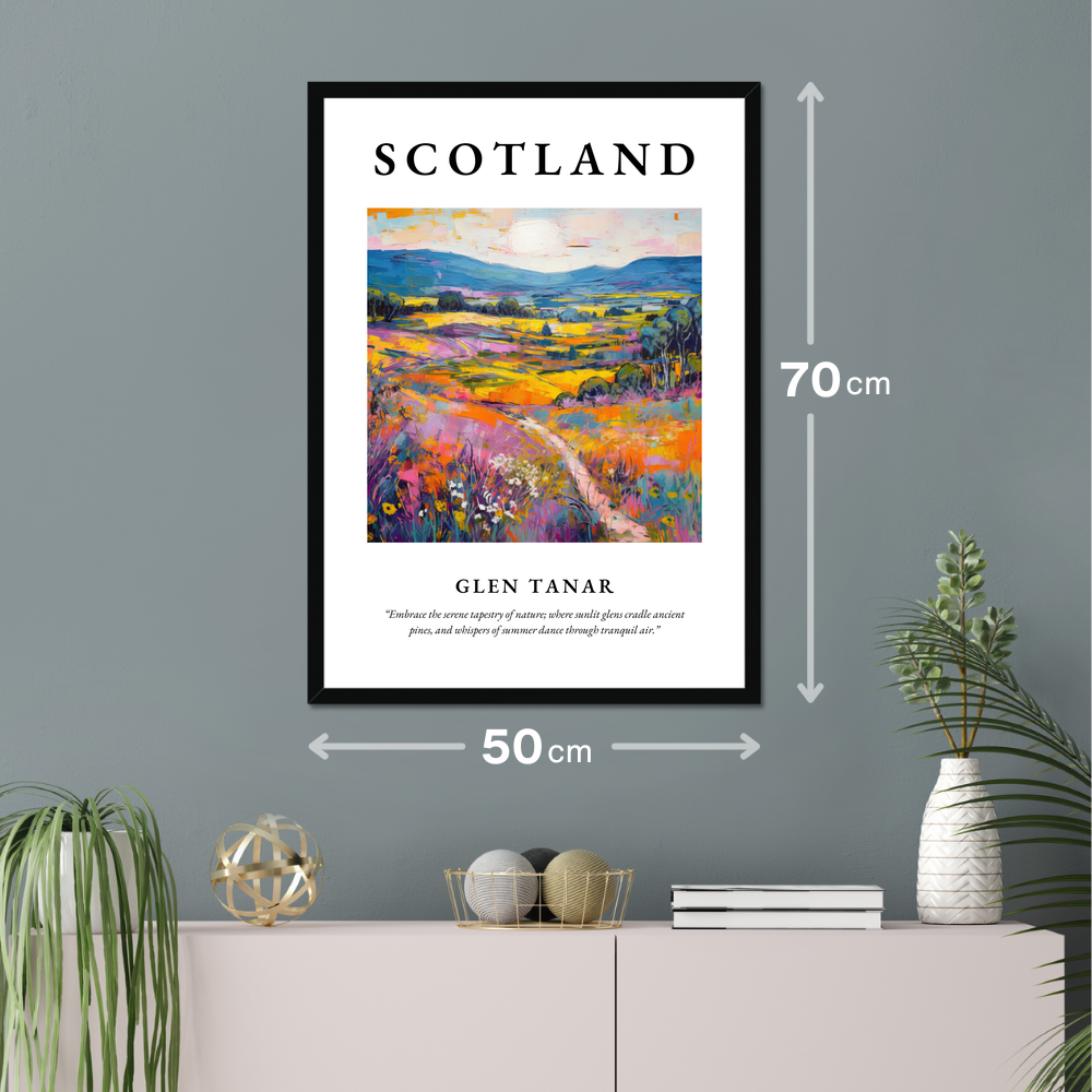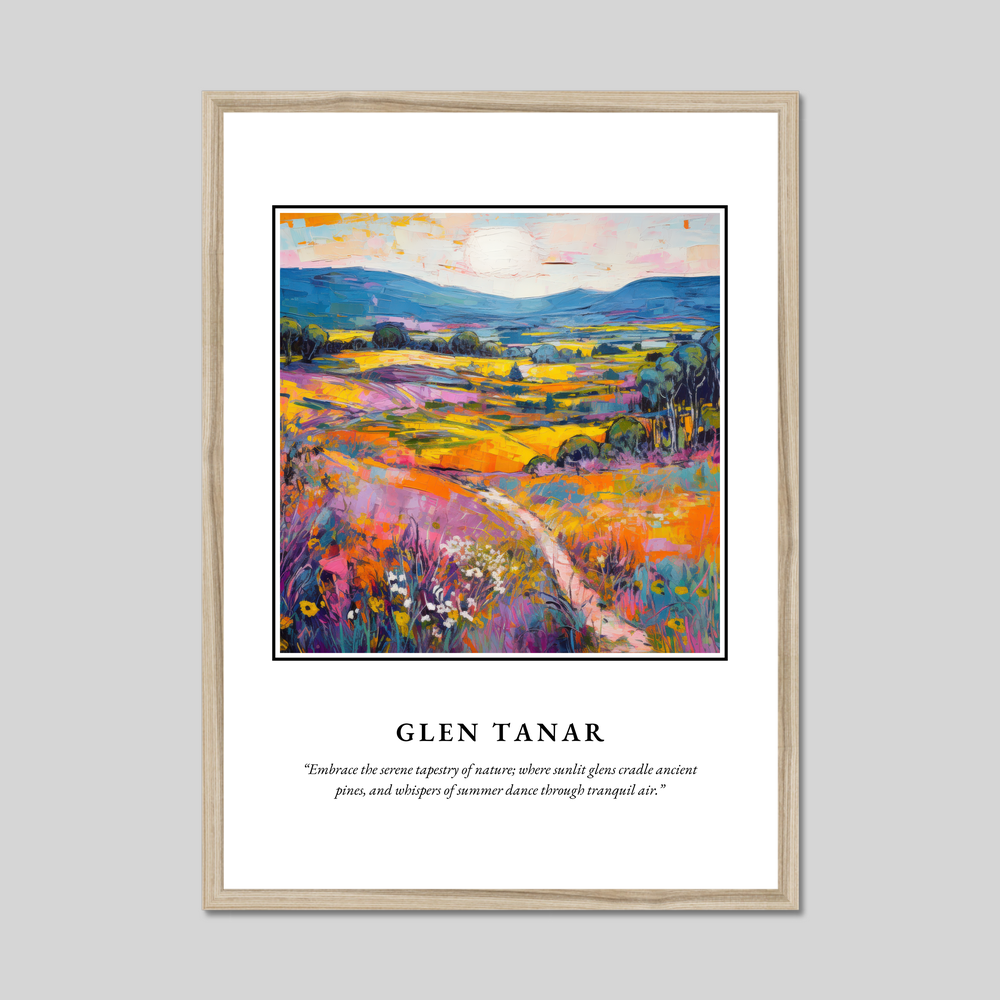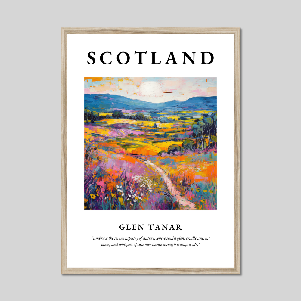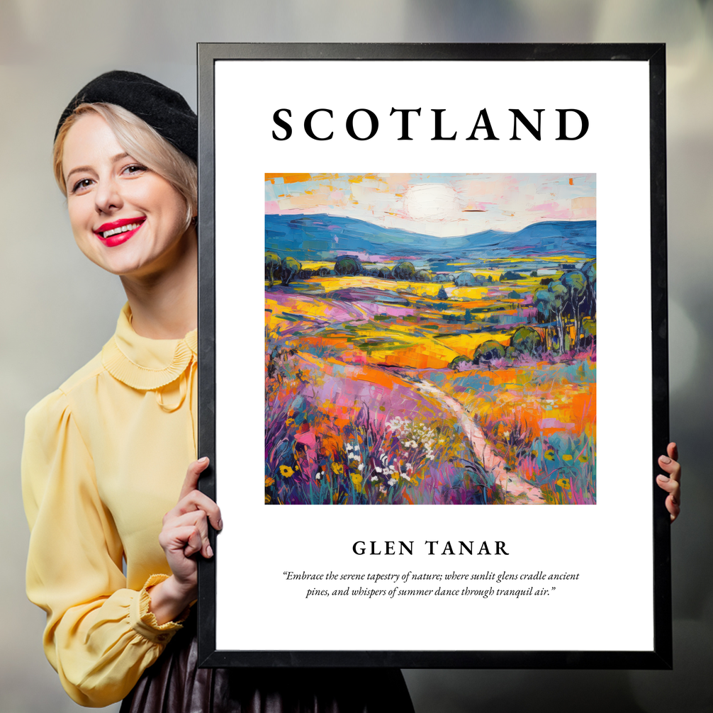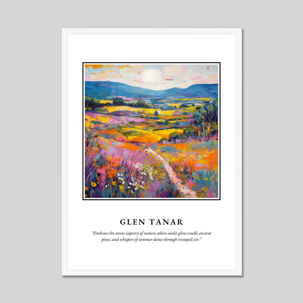 The bold heading “SCOTLAND” commands attention, leading you into the heart of the poster where a vivid abstract painting of Glen Tanar unfolds. The vibrant, swirling brushstrokes dance across the canvas, evoking the warm embrace of summer as colourful swaths of wildflowers and sunlit glens come to life. Beneath this captivating image, the quote “Embrace the serene tapestry of nature; where sunlit glens cradle ancient pines, and whispers of summer dance through tranquil air” invites the viewer to step into a world where nature's symphony plays eternally.