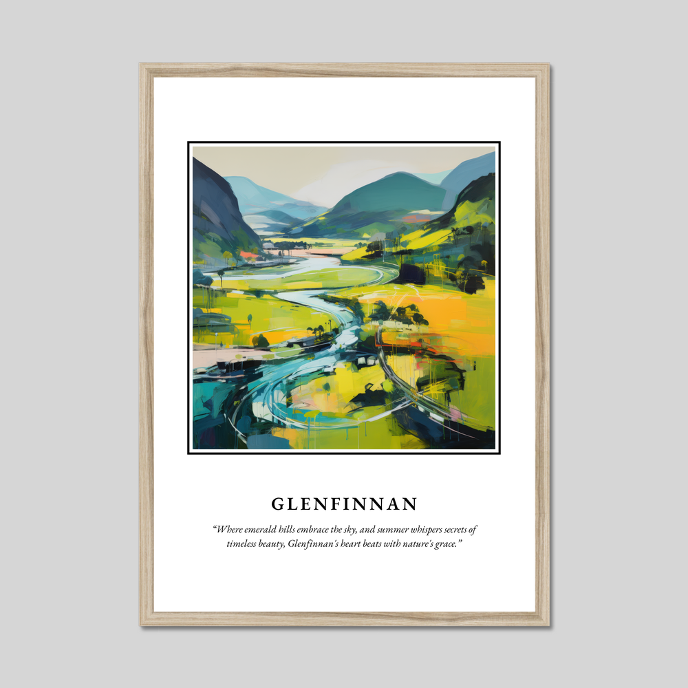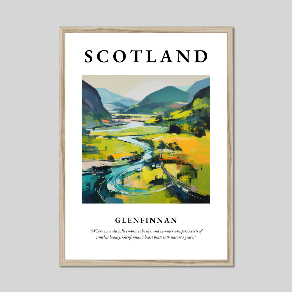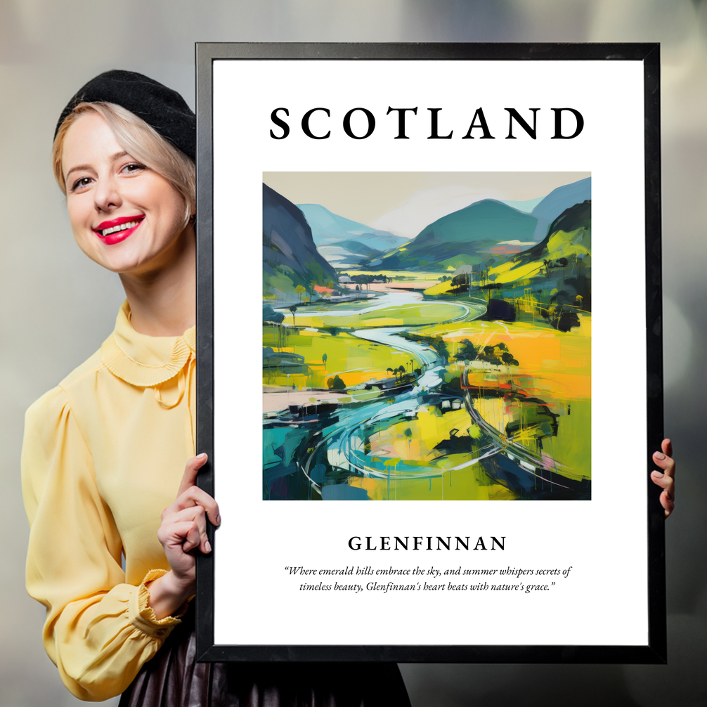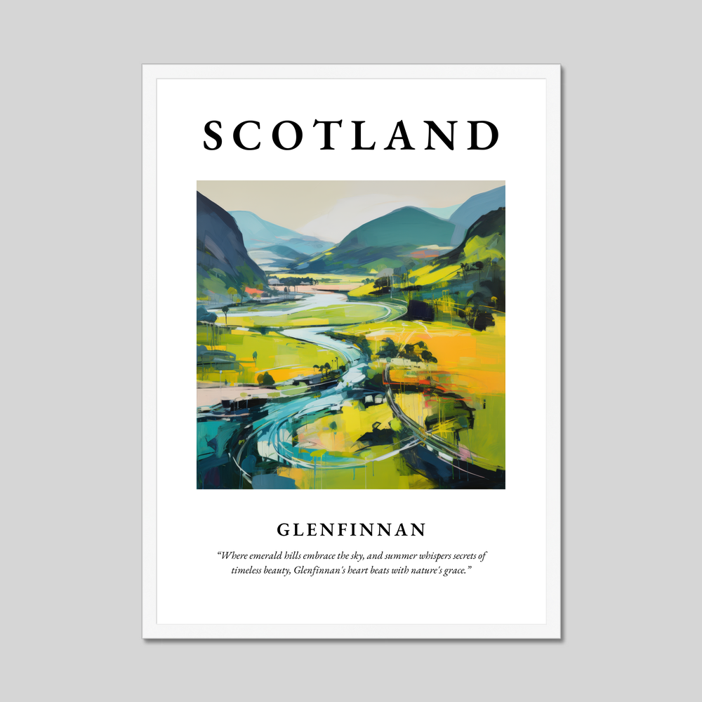 At the top, the bold lettering of "SCOTLAND" sets the tone, celebrating the essence of this enchanting land. Below, the painting of Glenfinnan captures the splendor of summer in the Scottish Highlands, with vibrant brushstrokes and a contemporary flair. The emerald greens and soft blues in the artwork mirror the lush landscapes, inviting you to linger in the scene. The quote beneath—“Where emerald hills embrace the sky, and summer whispers secrets of timeless beauty, Glenfinnan's heart beats with nature's grace”—completes this visual and verbal tribute to one of Scotland's most picturesque locations.