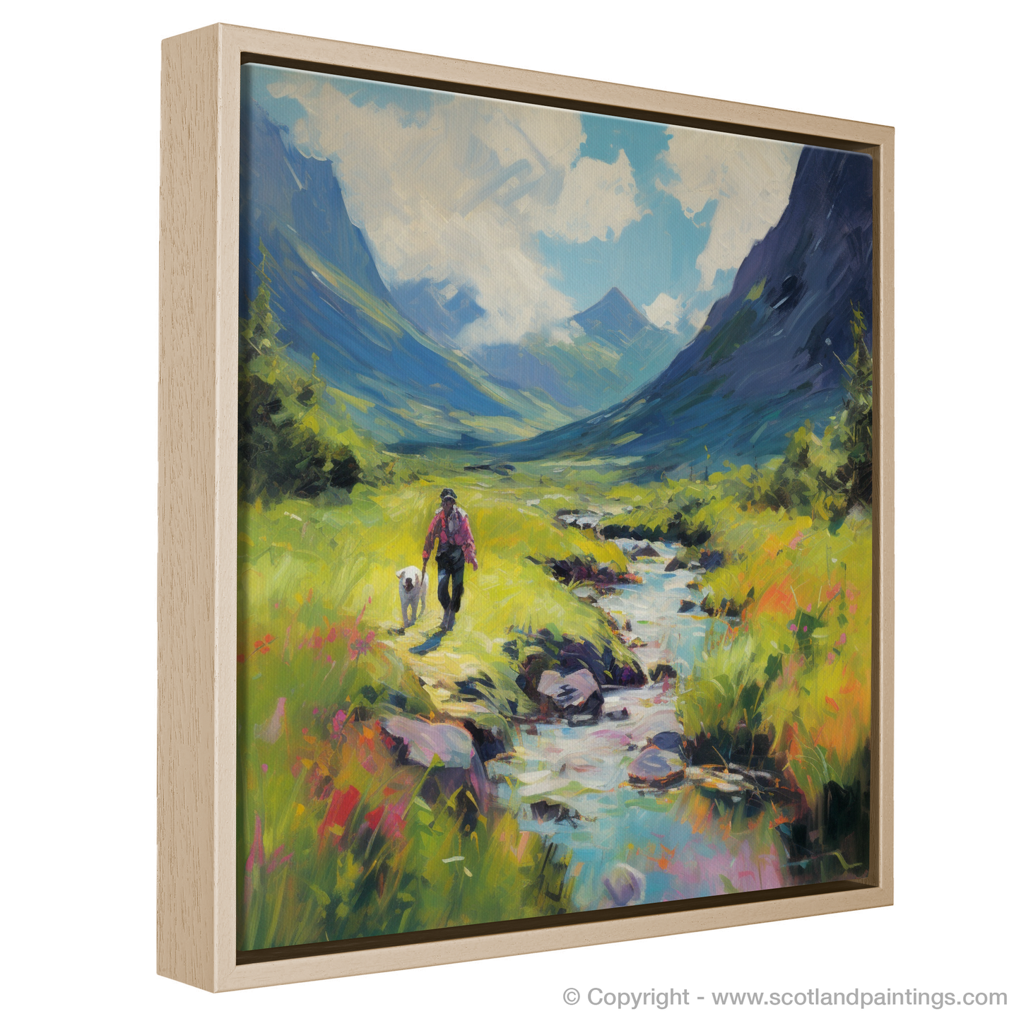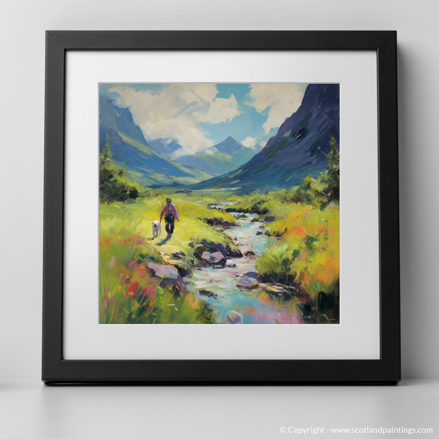 Painting and Art Print of Dog walker in Glencoe during summer. Summer Stroll in Glencoe with Fauvist Flair.