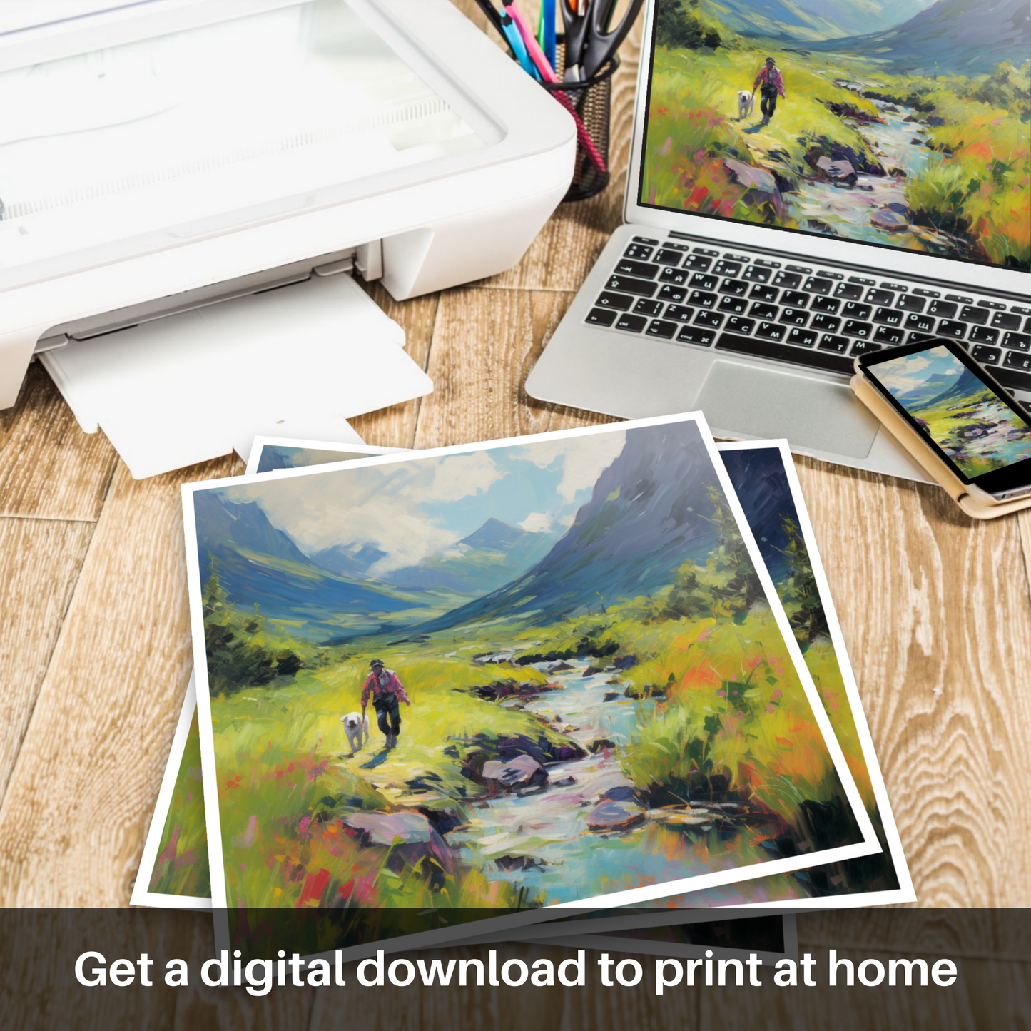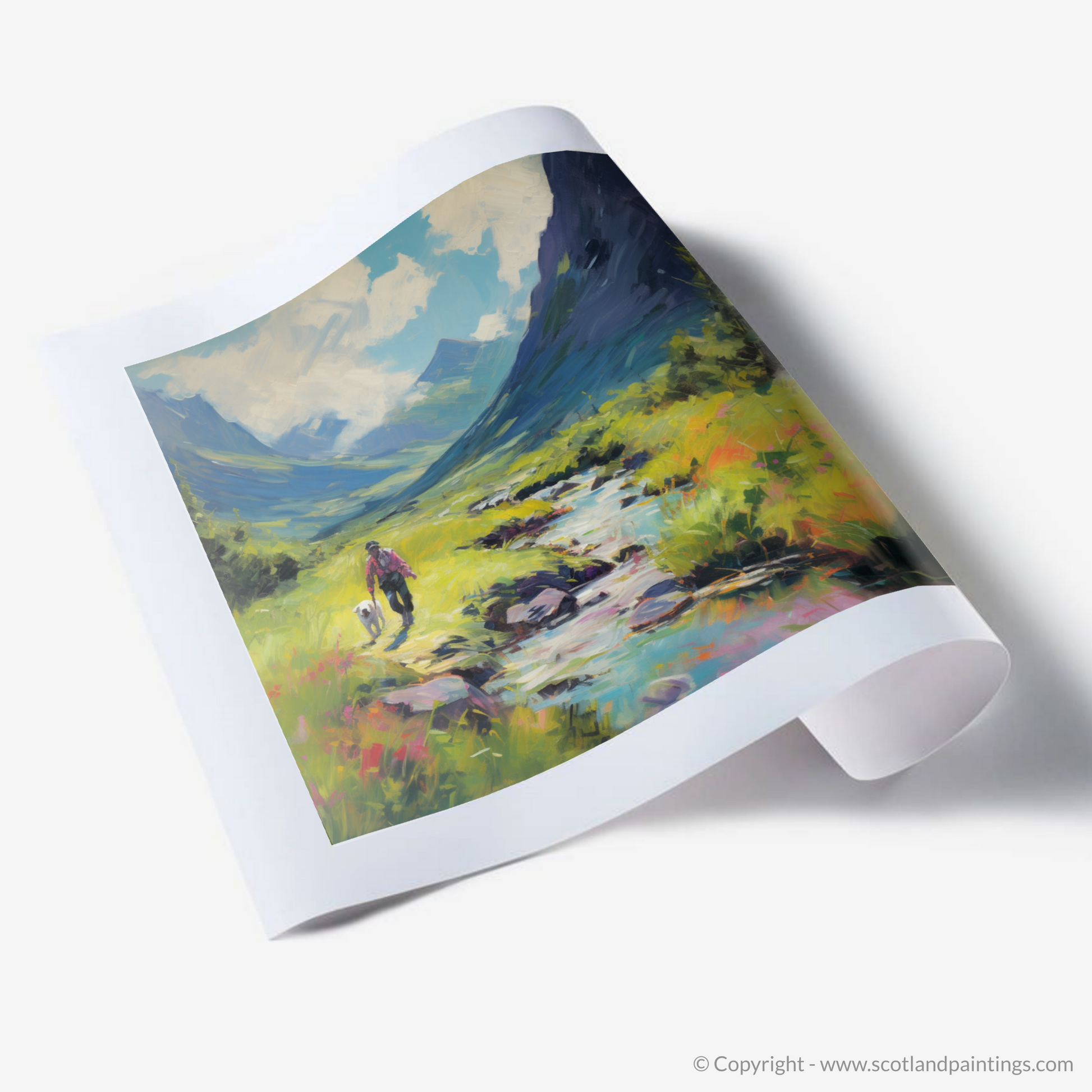 This print is a celebration not just of the visual splendor of Scotland in summer but also of the freedom and joy found in a simple walk through its landscapes. It is a slice of Scottish serenity, offering an escape to a corner of the world where nature’s magnificence is on full display, ready to be admired in any space that it graces.