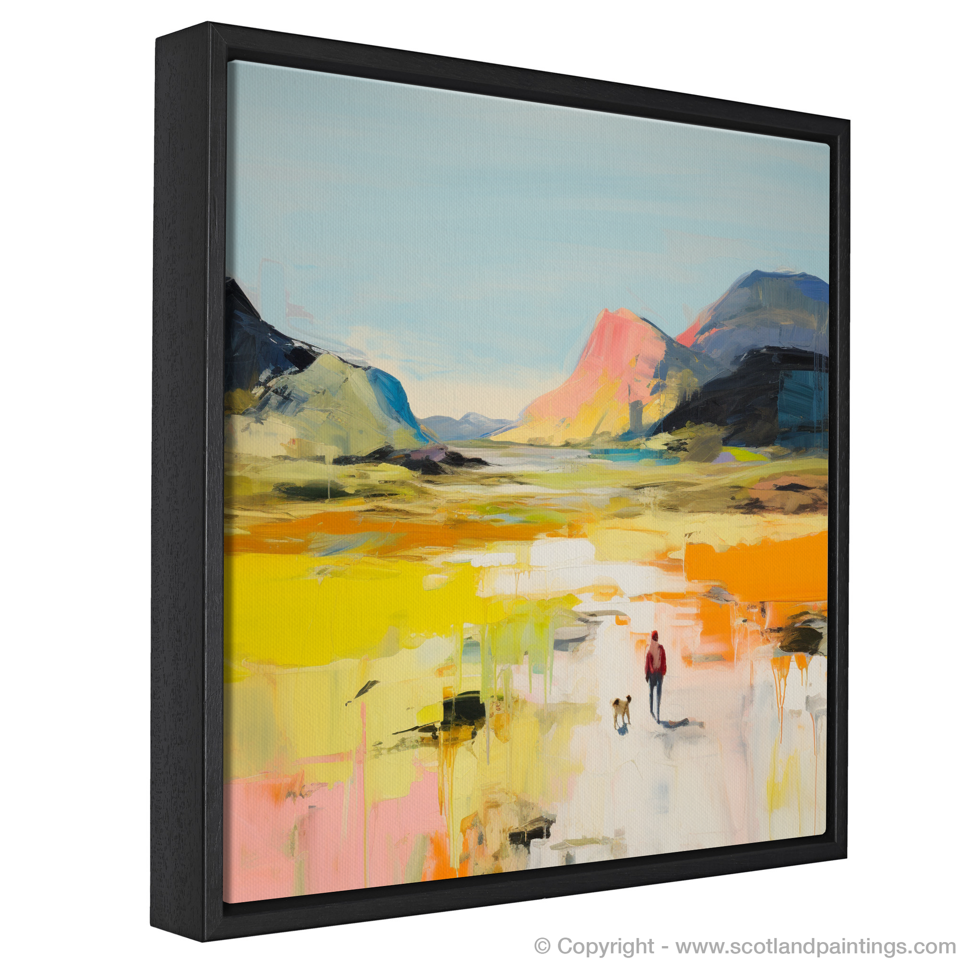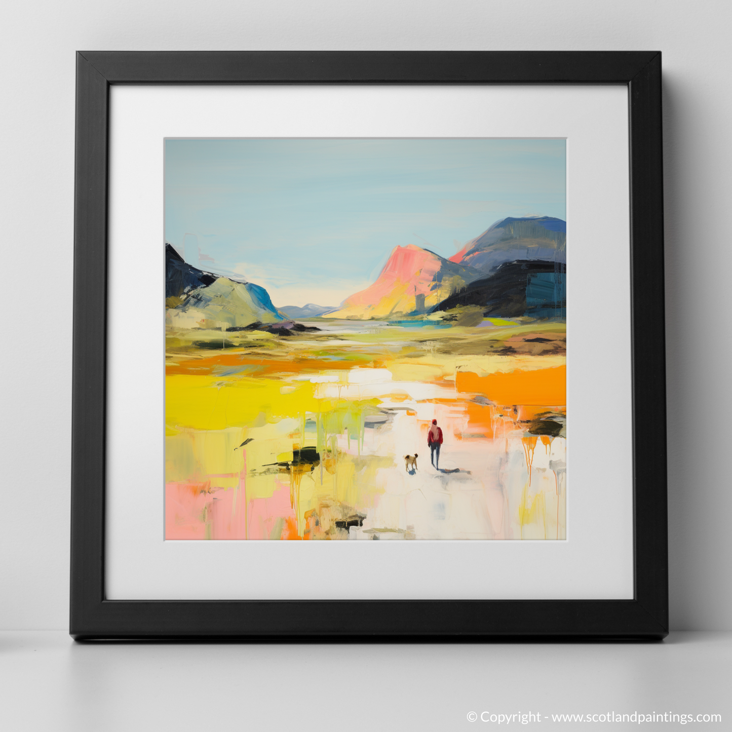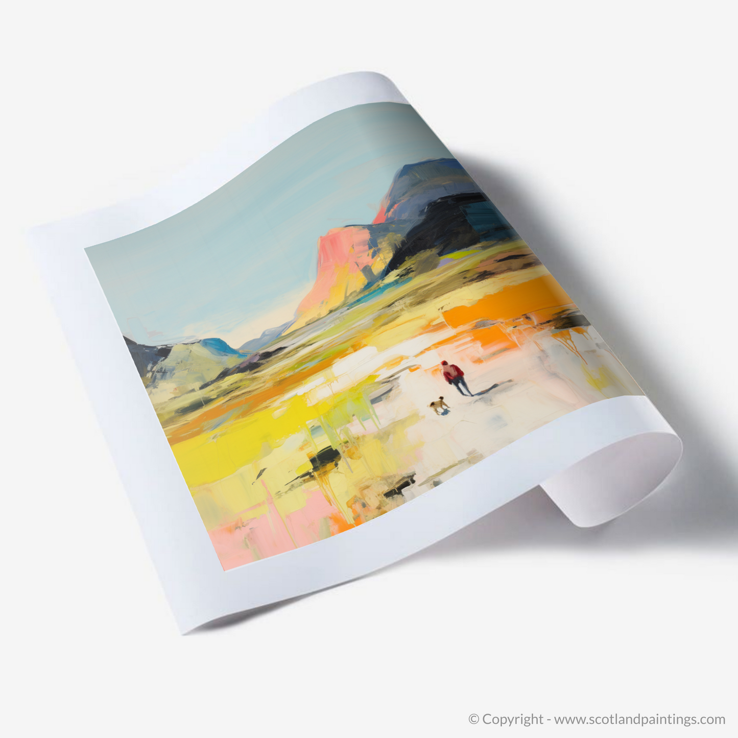 This captivating abstract print invites you to explore the serene beauty of Scotland's Glencoe during the balmier months, captured through a vibrant tapestry of colour and motion. The dynamic strokes and bright, contrasting hues instantly draw you into a landscape that, while grounded in reality, is transformed into a vivid dreamscape.