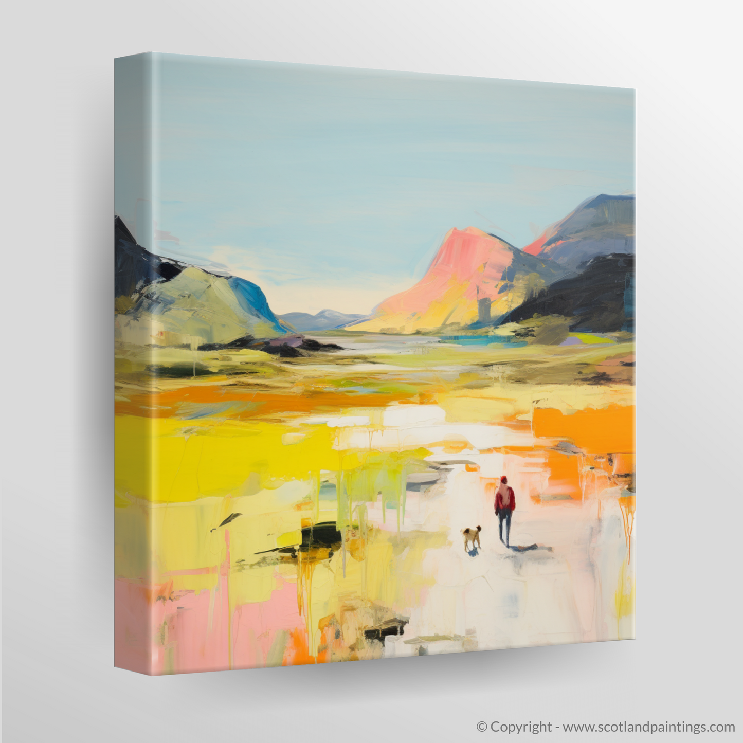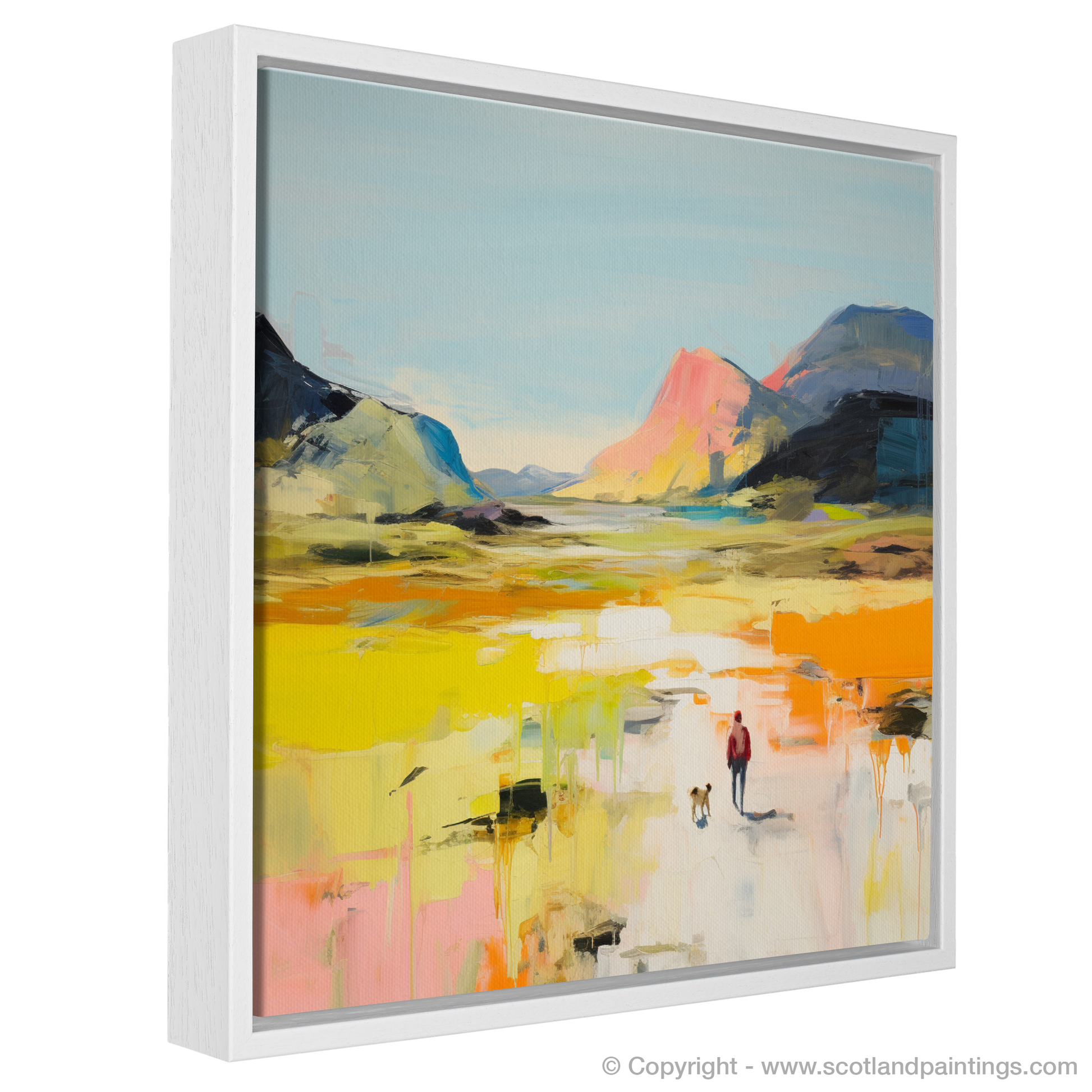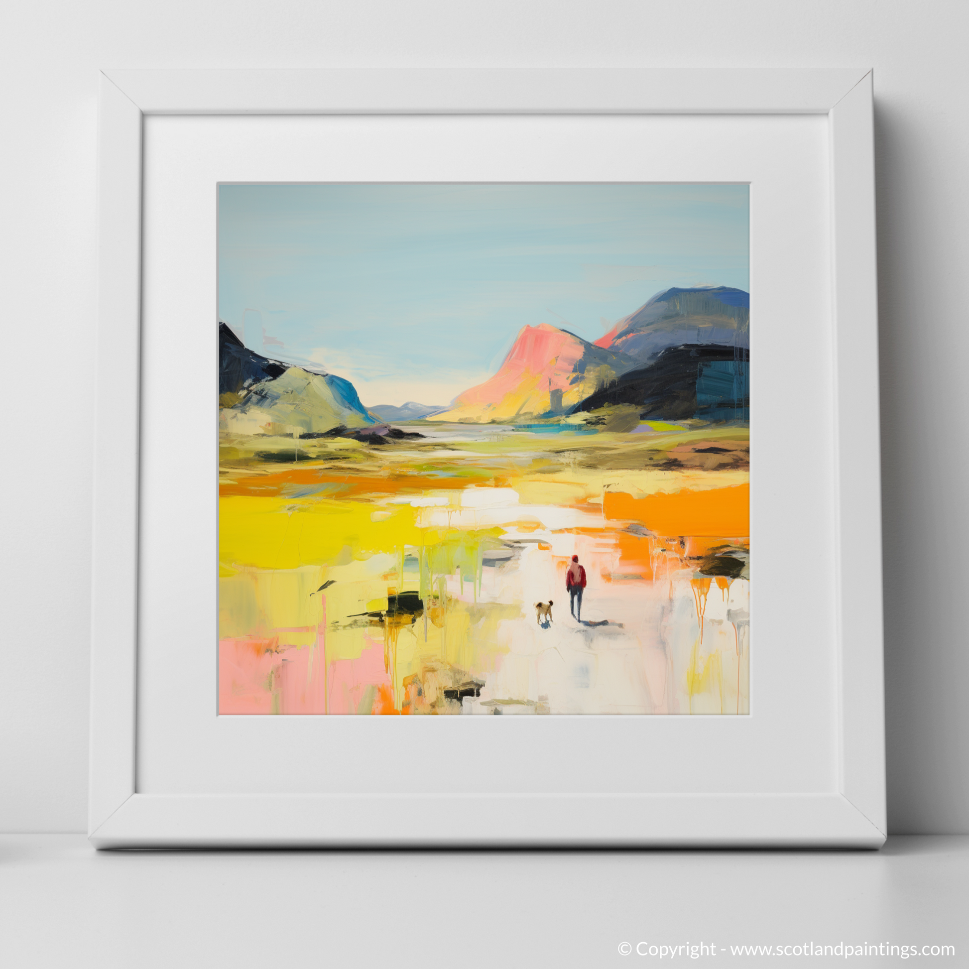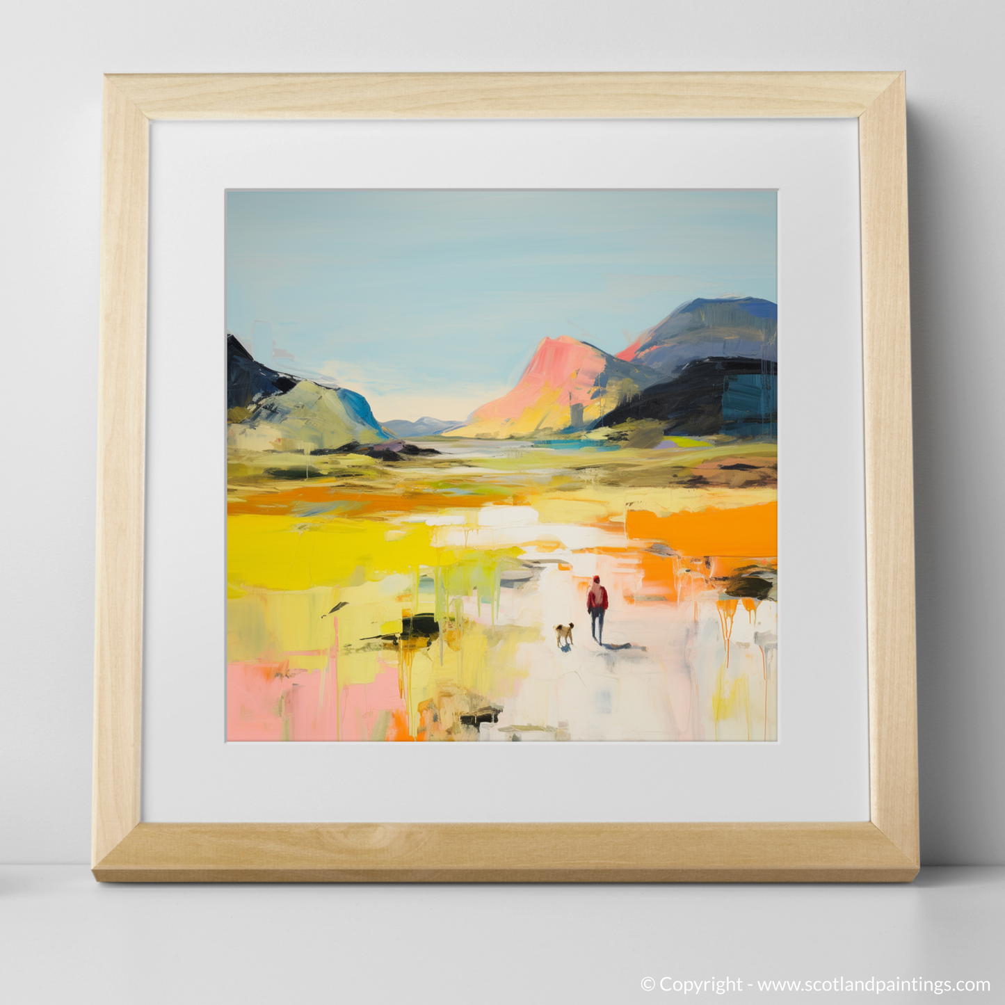 This captivating abstract print invites you to explore the serene beauty of Scotland's Glencoe during the balmier months, captured through a vibrant tapestry of colour and motion. The dynamic strokes and bright, contrasting hues instantly draw you into a landscape that, while grounded in reality, is transformed into a vivid dreamscape.