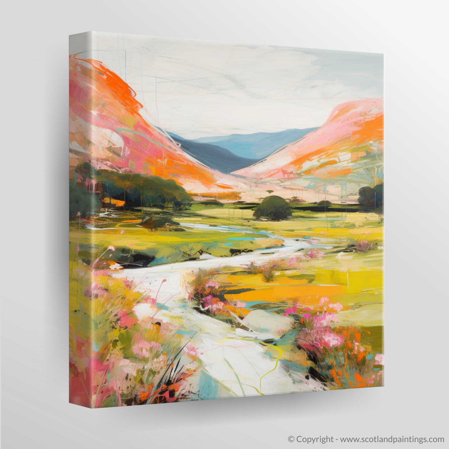 Captured in a palette that sings of the vibrant essence of summer, this dynamic depiction of Glen Roy in the Scottish Highlands is a feast for the senses. Vivacious hues of citrus orange, lemon-yellow, and zesty lime interweave with cool blues and emerald greens, forming an almost tangible atmosphere that one can almost breathe in. Bold, expressive brushstrokes dance across the canvas, invigorating the valley with a sense of movement and life.