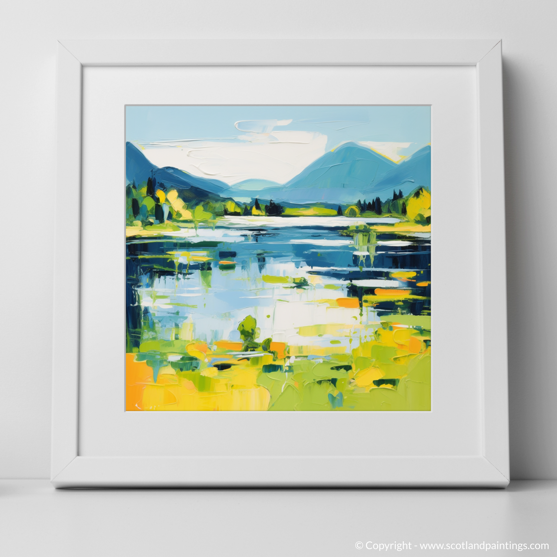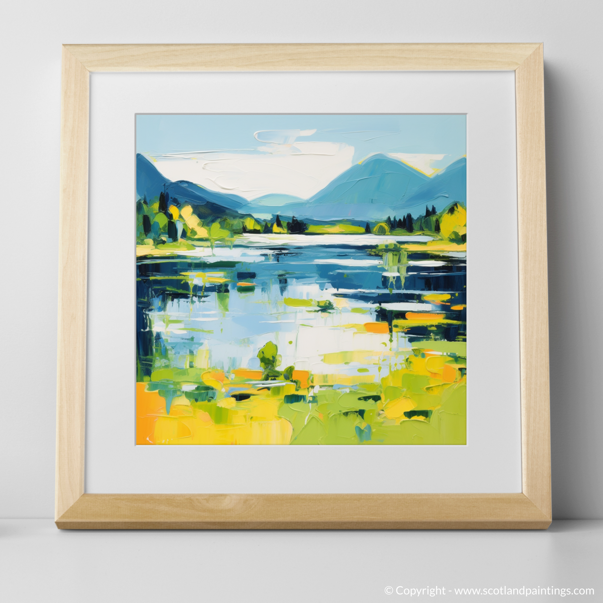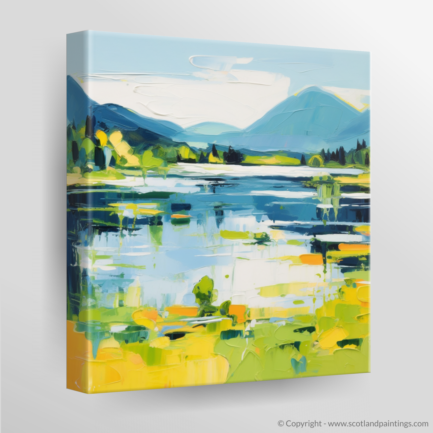Captivate your senses with this vibrant abstract interpretation of Loch Achray, a visual symphony of colour and form that encapsulates the spirit of Scotland's summertime splendour. Vivacious strokes of yellow and green dance across the canvas, evoking the lively essence of foliage under the caress of a warm sun. Patches of calming blue and white mirror the sky above, reflecting upon gentle waters with a harmonious blend of cool tones.