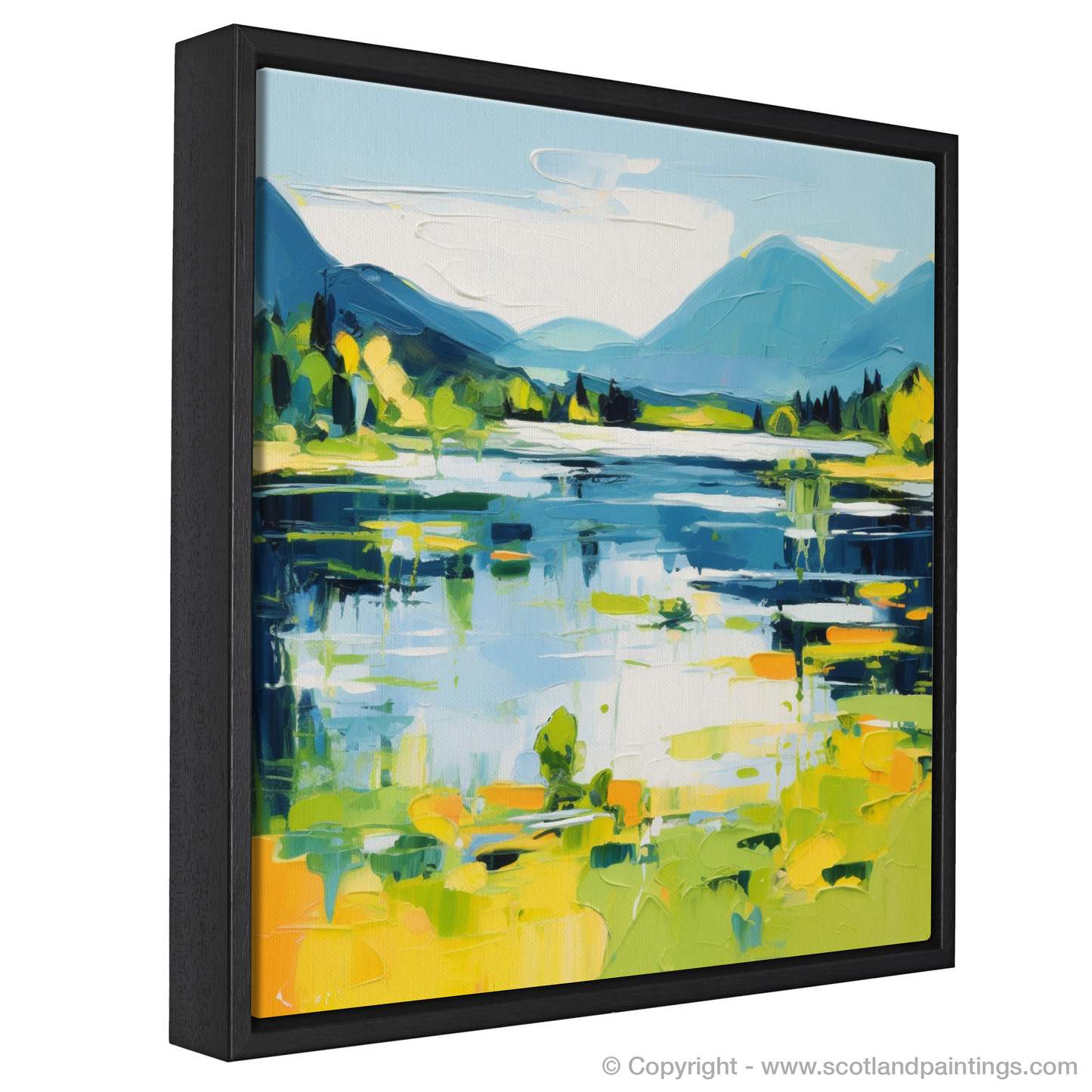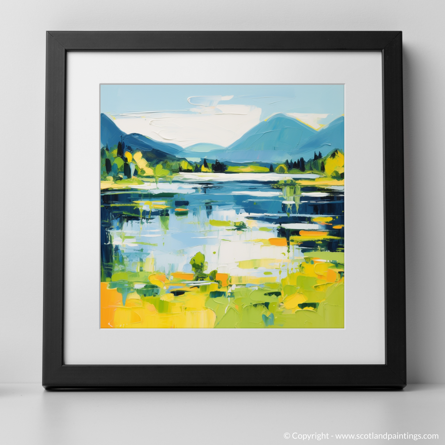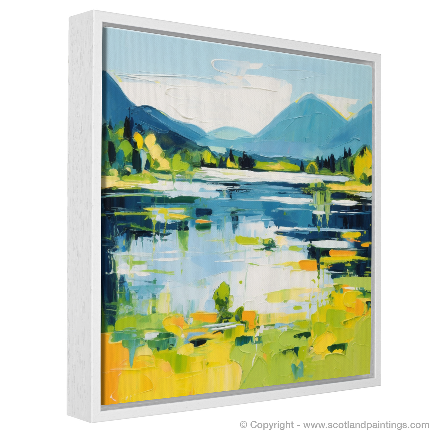 Captivate your senses with this vibrant abstract interpretation of Loch Achray, a visual symphony of colour and form that encapsulates the spirit of Scotland's summertime splendour. Vivacious strokes of yellow and green dance across the canvas, evoking the lively essence of foliage under the caress of a warm sun. Patches of calming blue and white mirror the sky above, reflecting upon gentle waters with a harmonious blend of cool tones.
