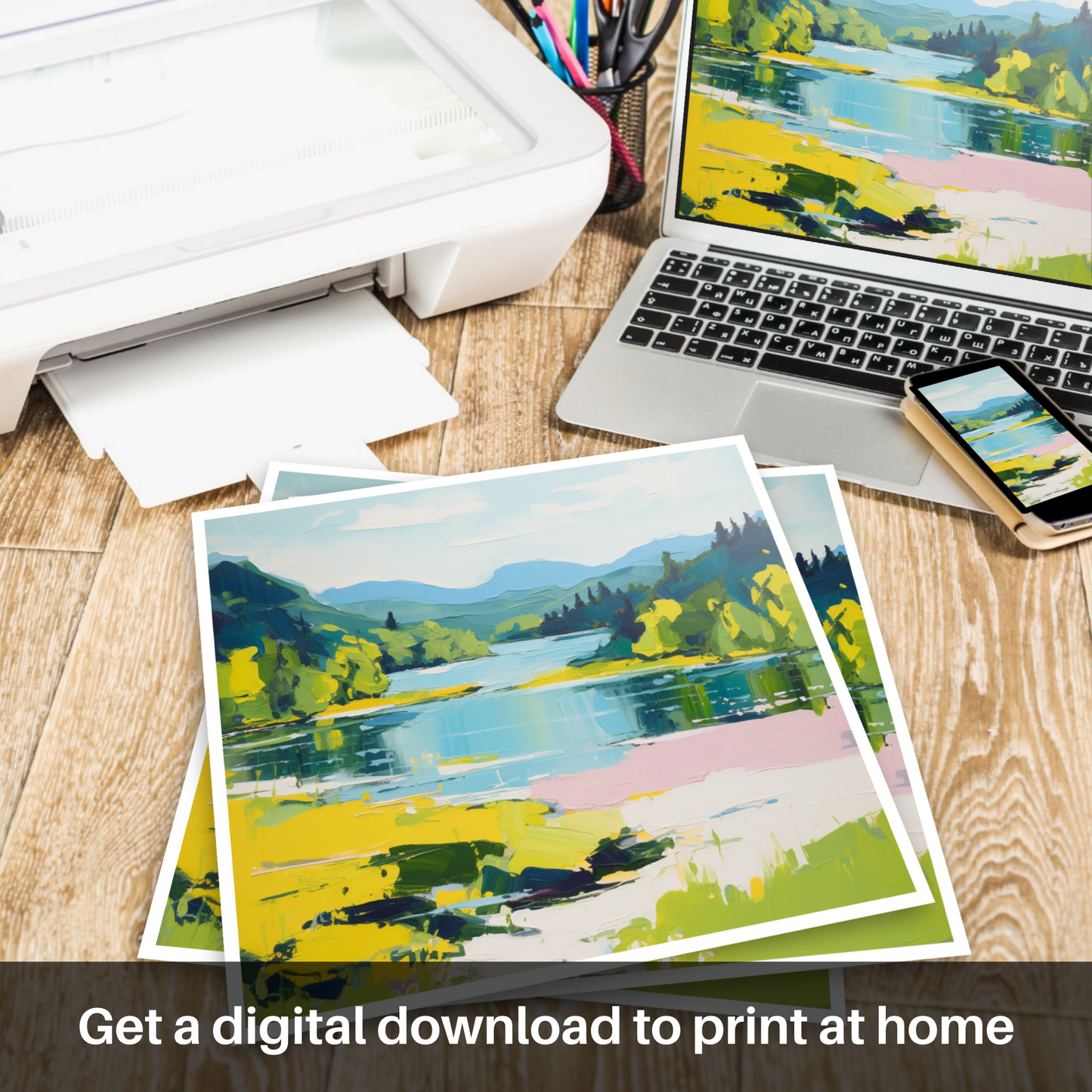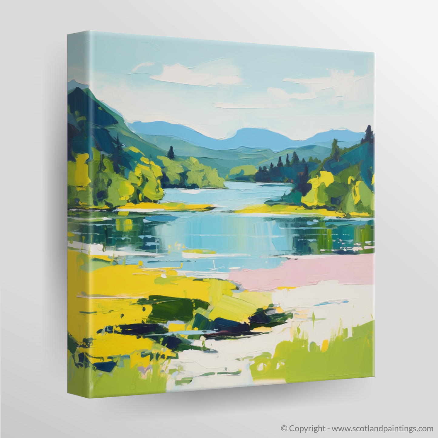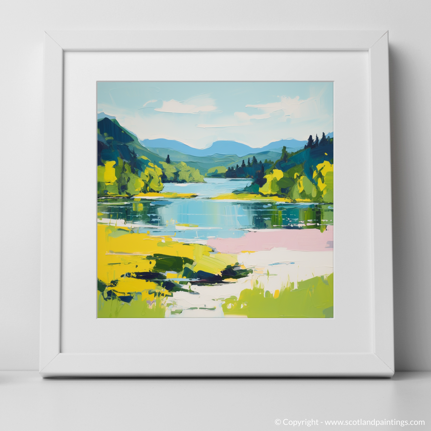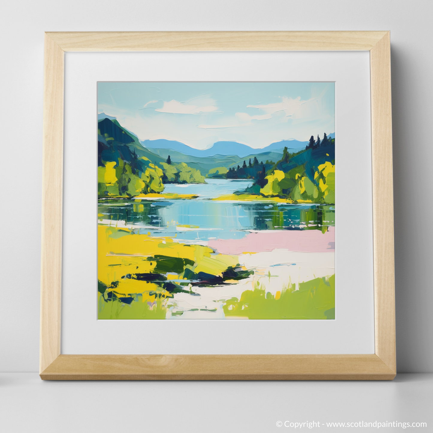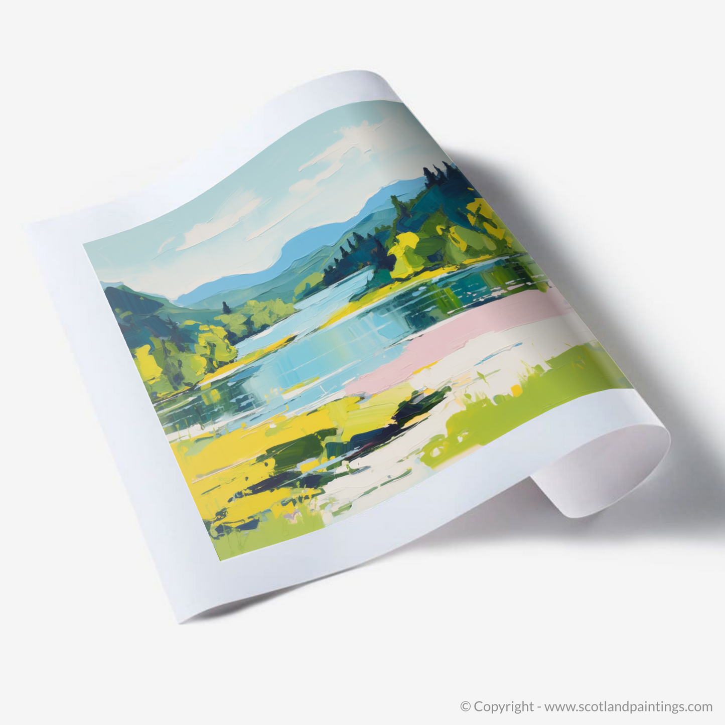 Capturing the essence of a Scottish summer, this evocative abstract print takes the viewer on a visual escapade to the serene shores of Loch Achray. Vibrant streaks of lemon yellow and lime disrupt the traditional landscape with energetic grace, encapsulating the vivid intensity of summer foliage under a radiant sun. Hues of sky blue and delicate pinks dance across the surface of the loch, reflecting a sky brushed with soft white streaks suggesting the gentle movement of clouds.