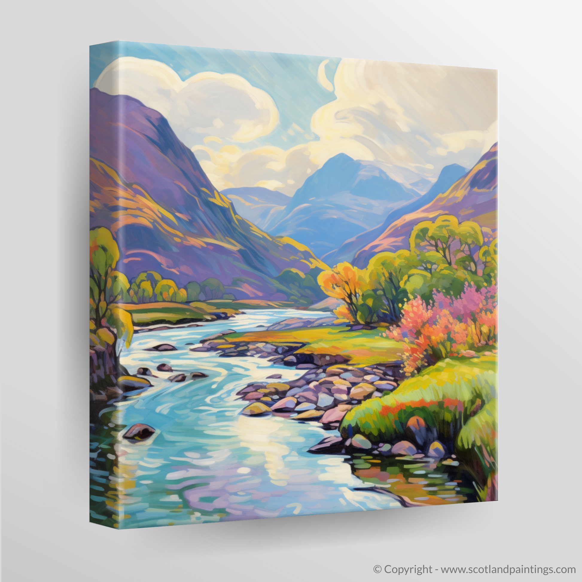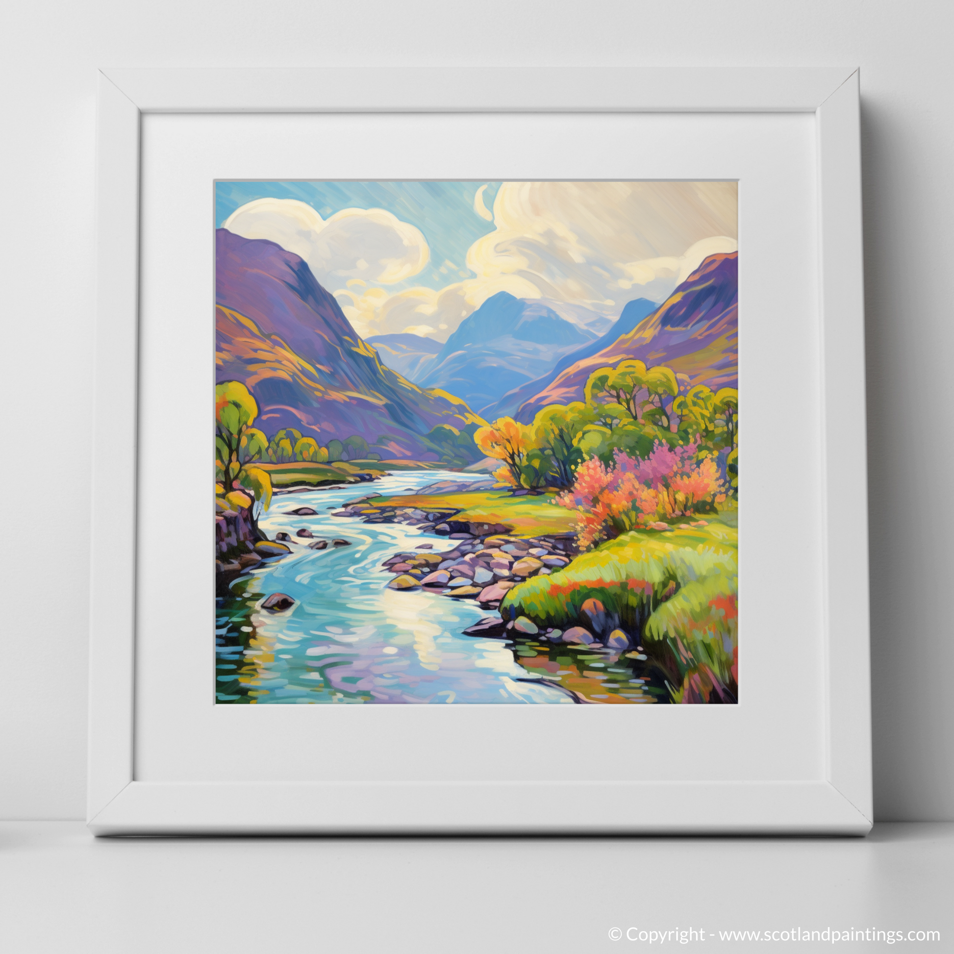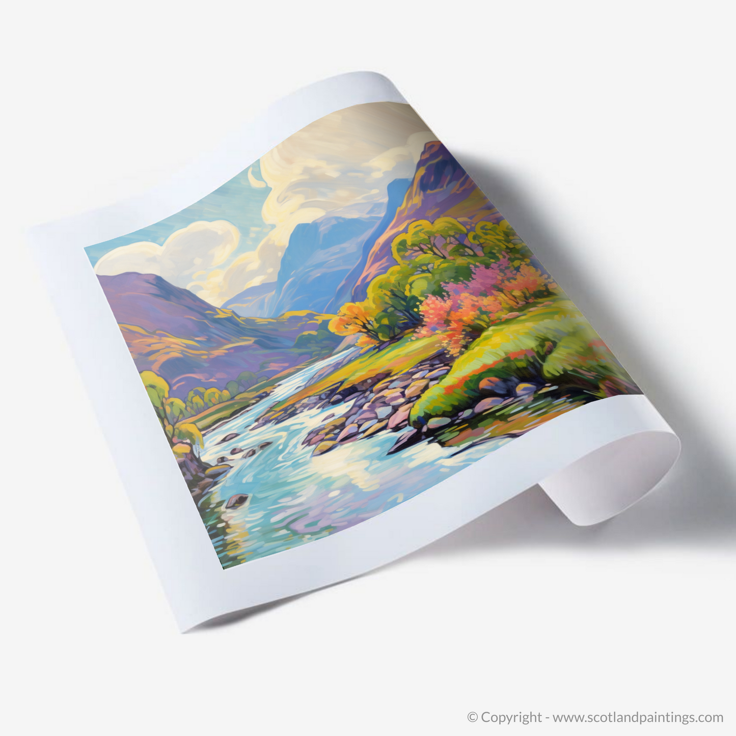 Exquisitely rendered in an Impressionist style, the print boasts a vivid array of colours, from the bright greens of the grassy banks to the warm yellows and oranges of the trees in full summer bloom. Patches of heather and wildflowers add vibrant pops of pink and purple, evoking the wild, untamed beauty of the Scottish highlands.