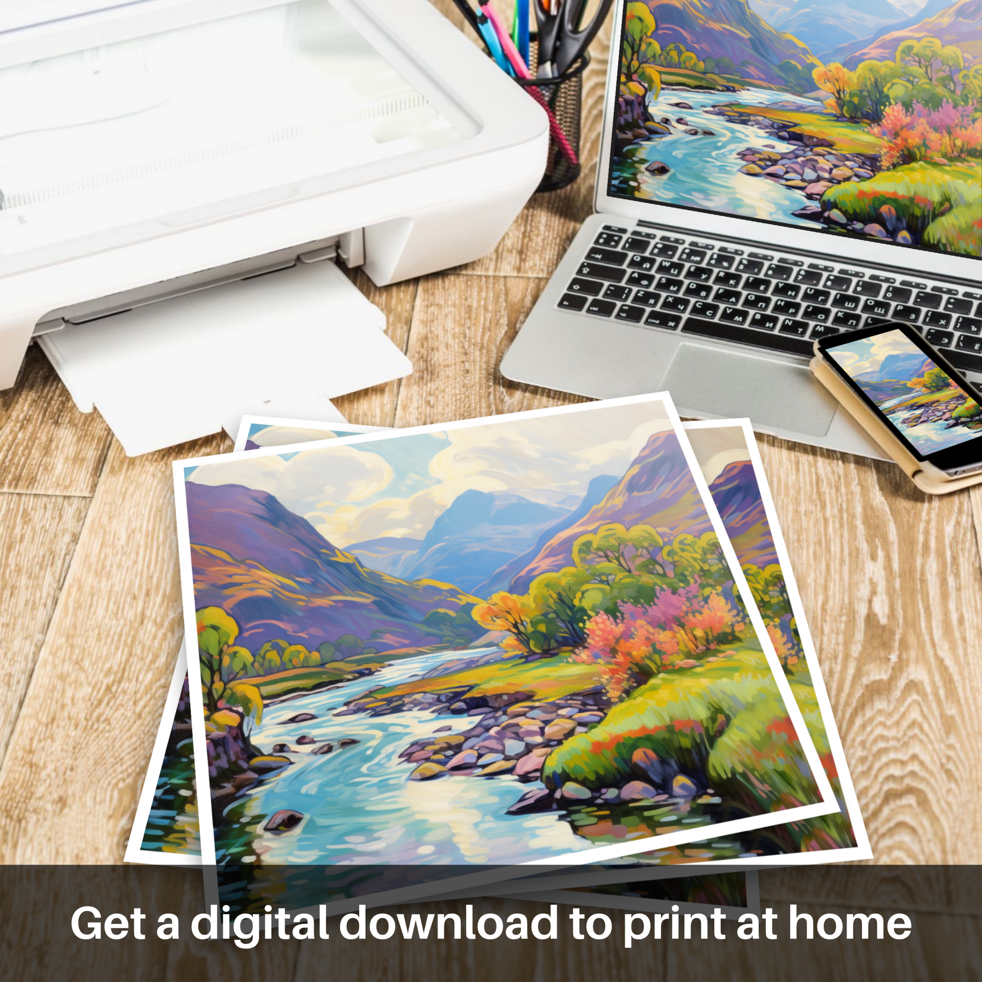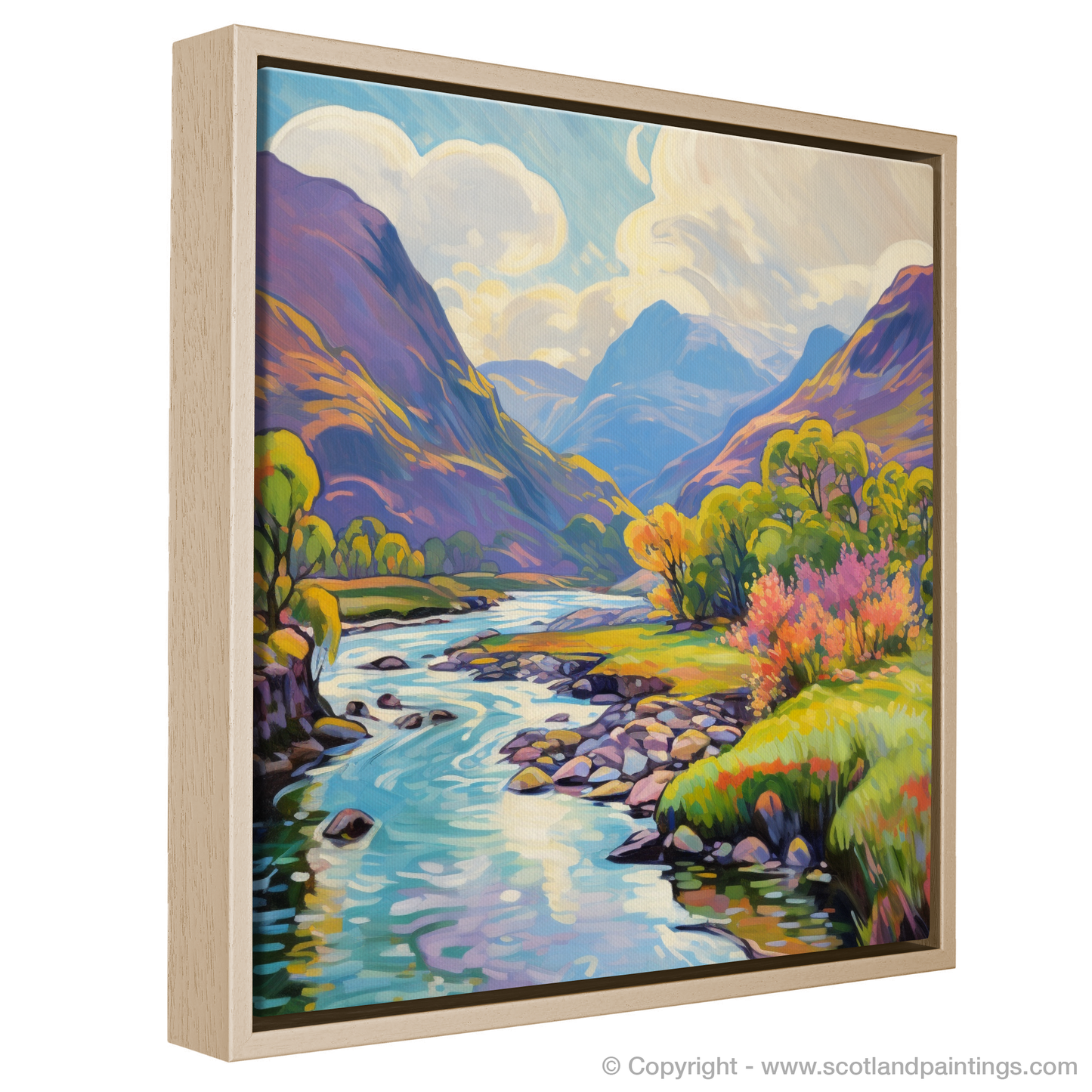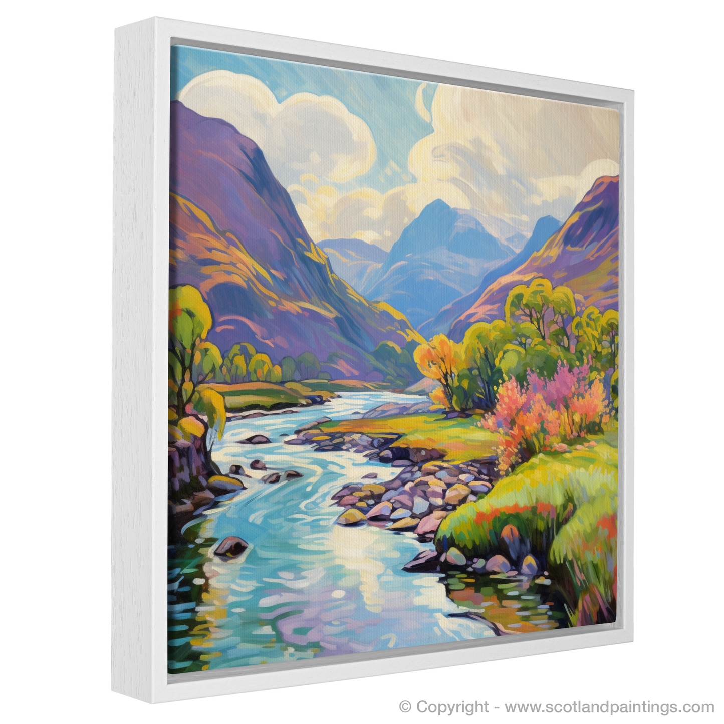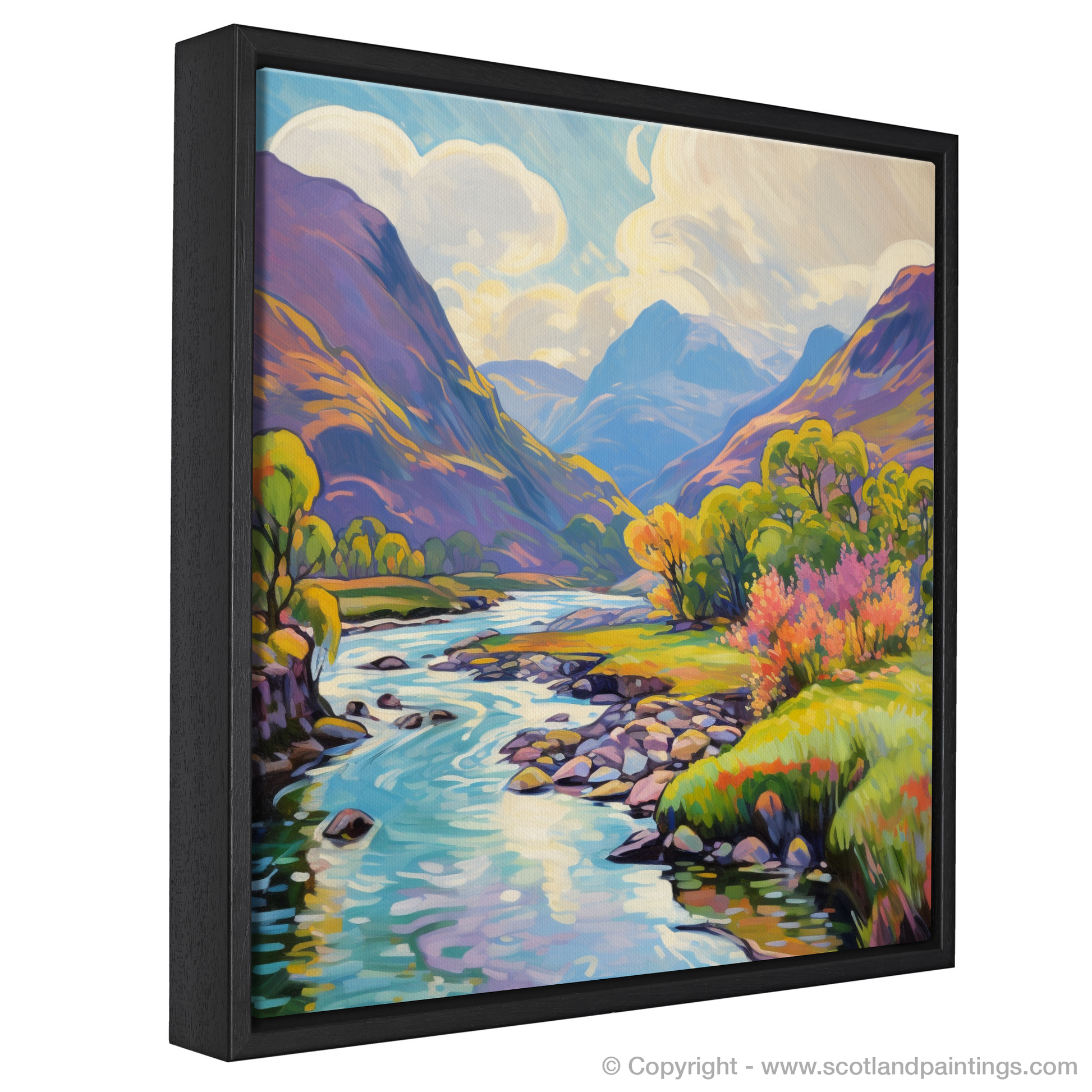 Exquisitely rendered in an Impressionist style, the print boasts a vivid array of colours, from the bright greens of the grassy banks to the warm yellows and oranges of the trees in full summer bloom. Patches of heather and wildflowers add vibrant pops of pink and purple, evoking the wild, untamed beauty of the Scottish highlands.