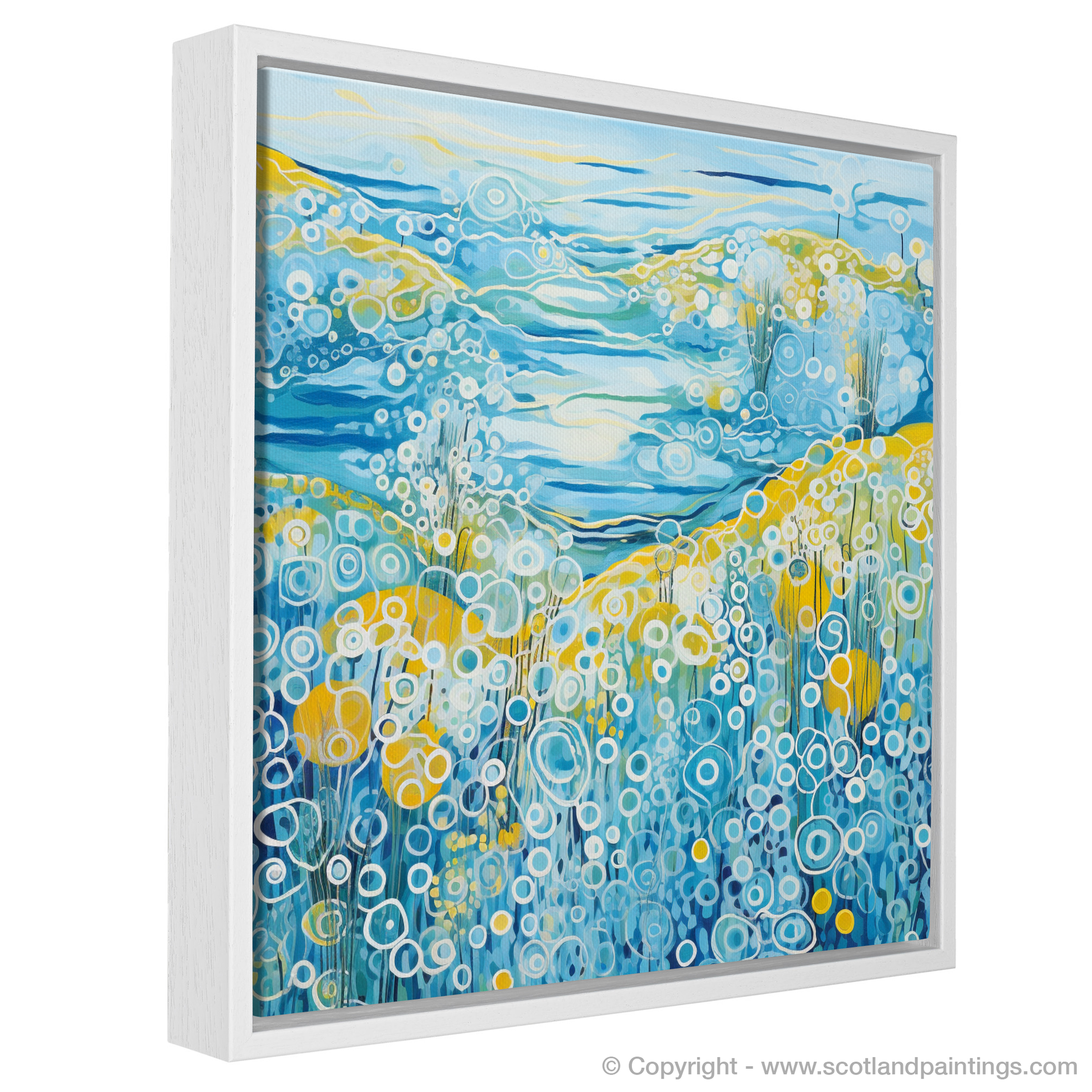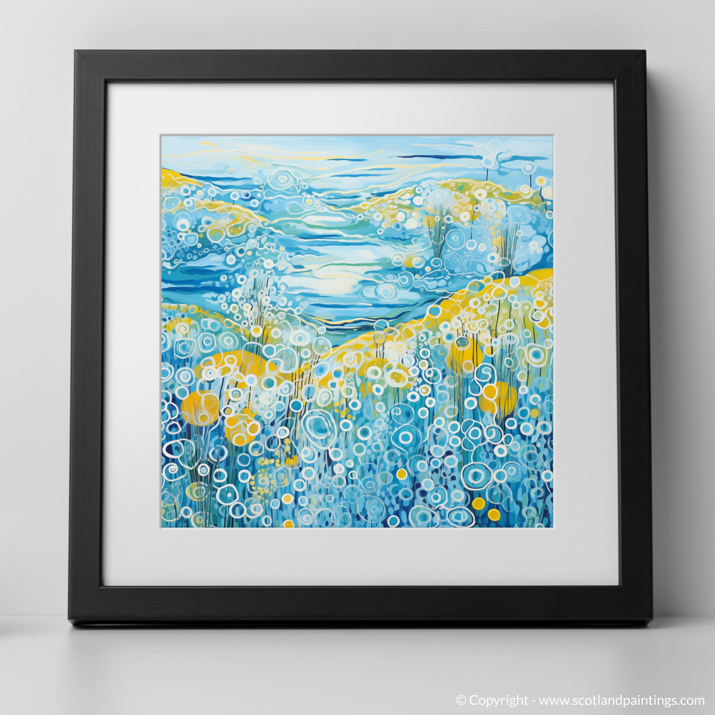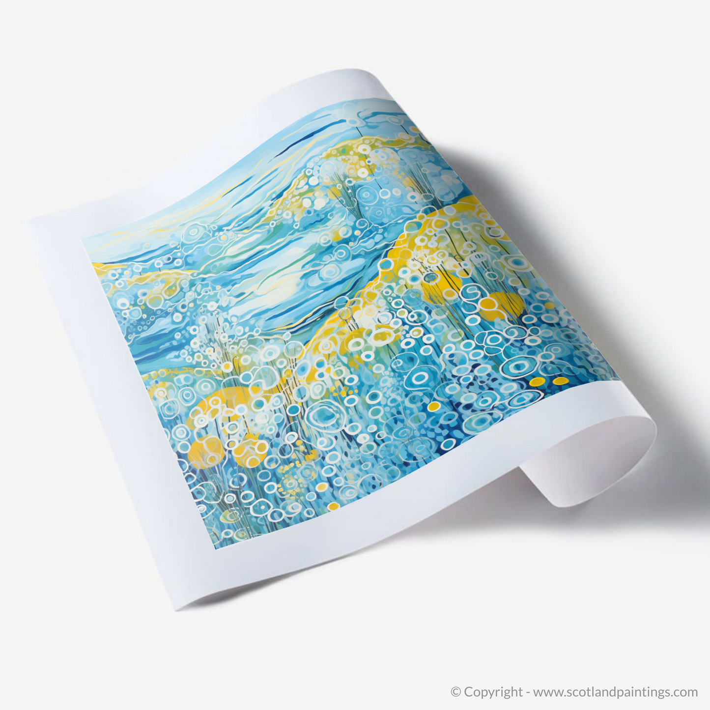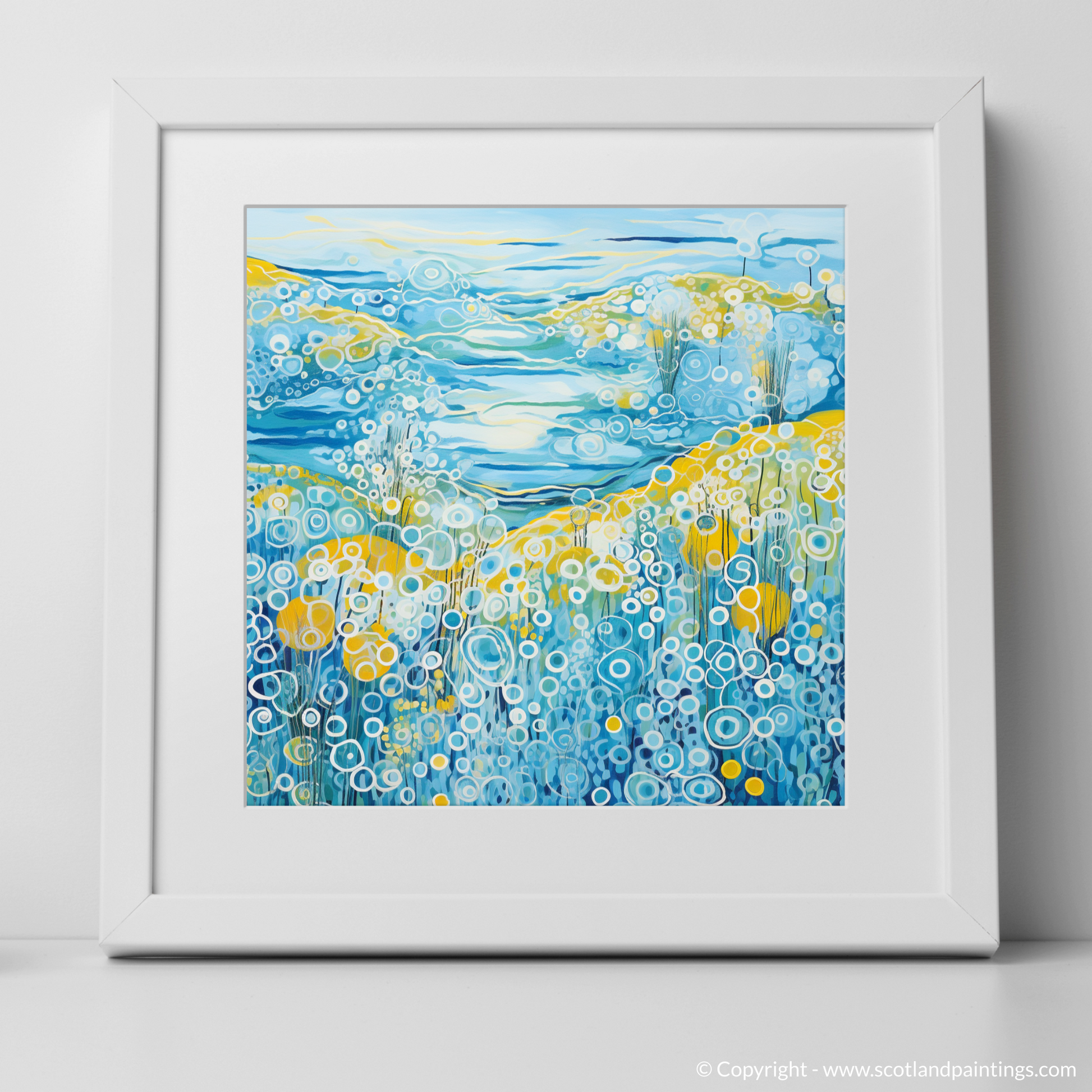 This captivating print is a celebration of the vibrant essence of summer on the Isle of Barra, set within the serene landscapes of the Outer Hebrides. Dominated by a medley of blues, from the deepest navy to the softest sky hues, the piece orchestrates the dynamic interplay between land, sea, and sky. The abstract representation of water features rolling waves and bubbling textures that evoke the movement of the sea, an effect achieved through a sequence of circular patterns and undulating lines that impart a sense of rhythm and fluidity.