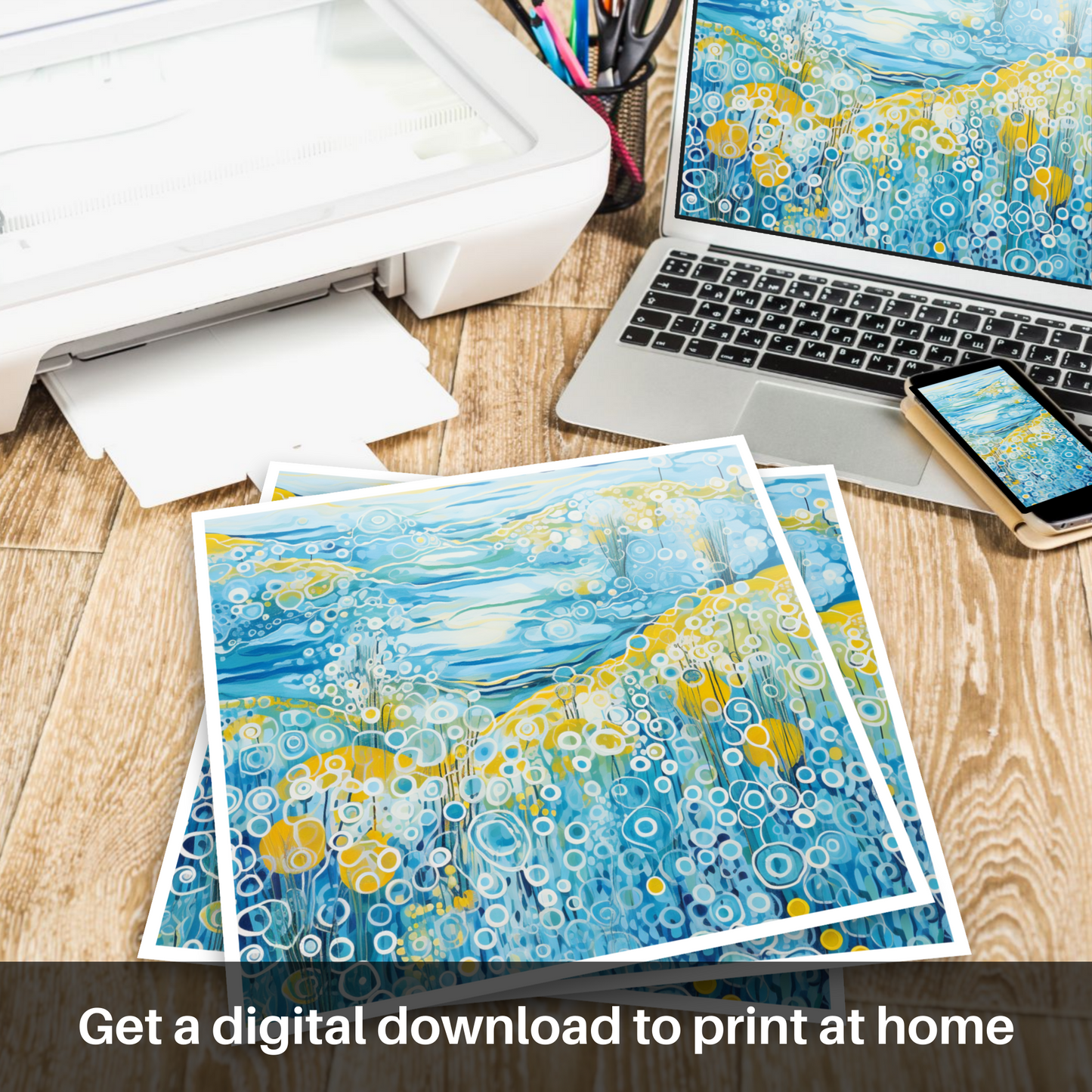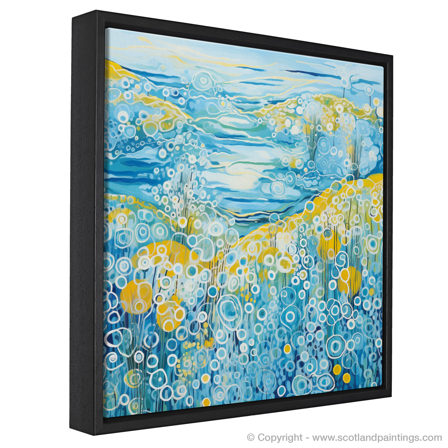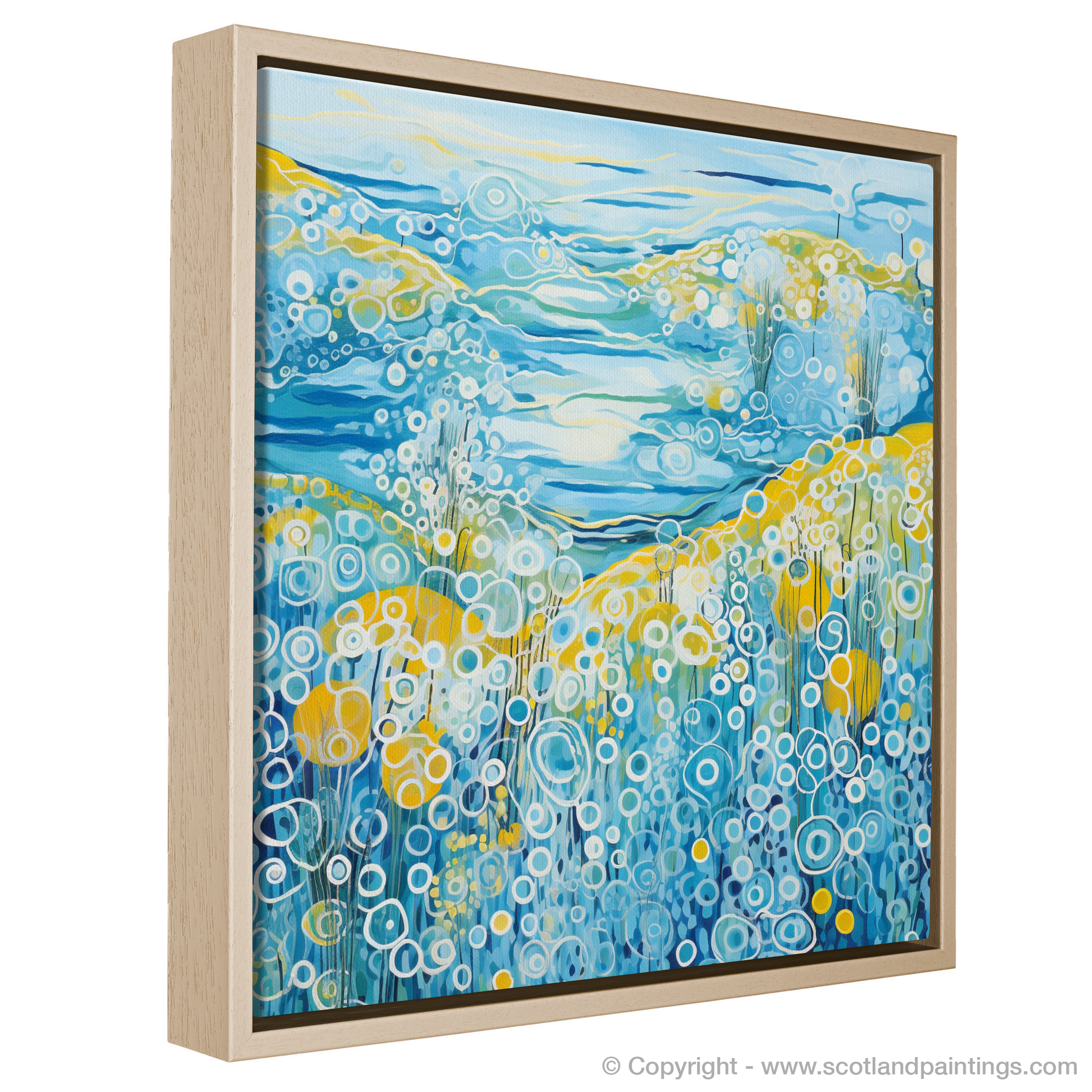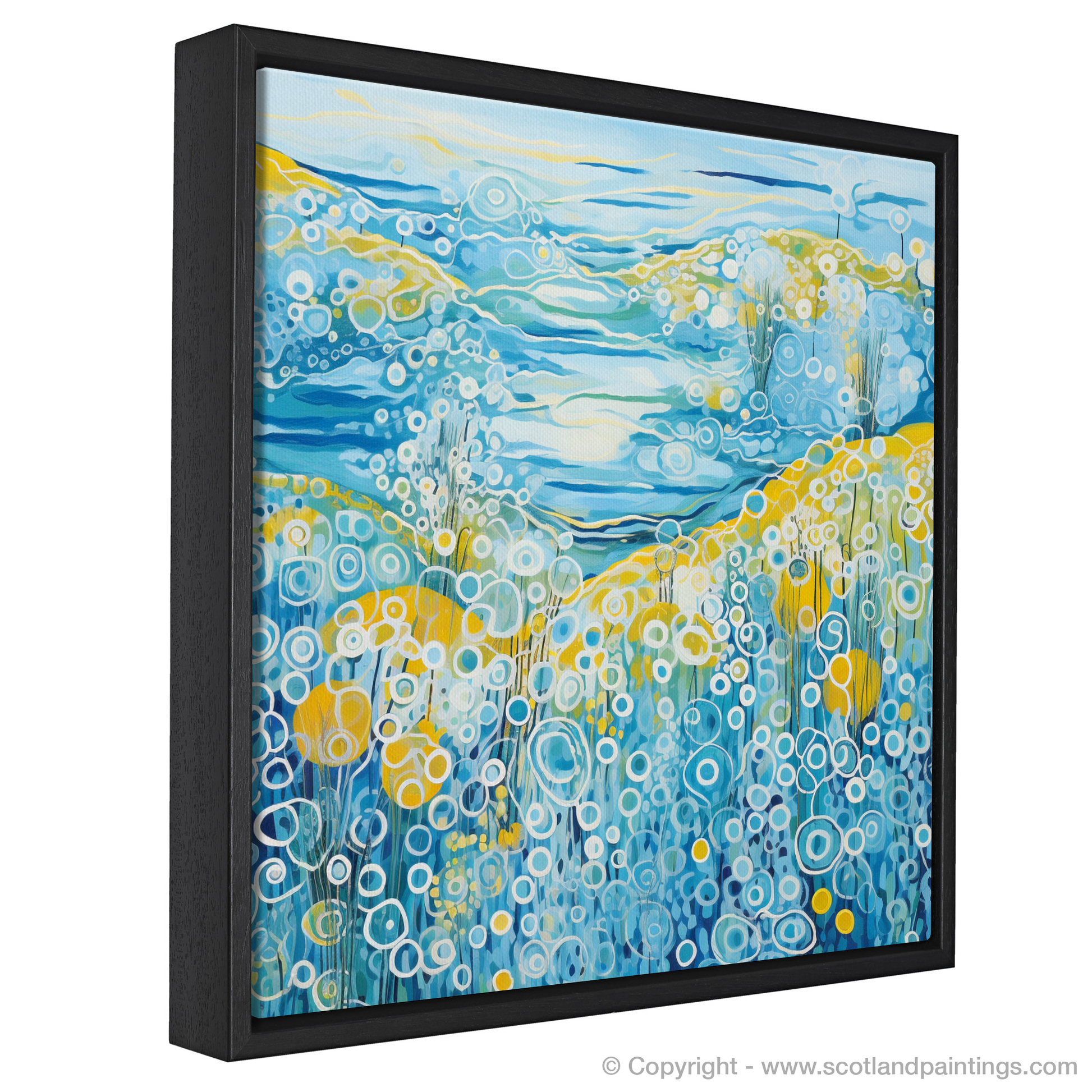 This captivating print is a celebration of the vibrant essence of summer on the Isle of Barra, set within the serene landscapes of the Outer Hebrides. Dominated by a medley of blues, from the deepest navy to the softest sky hues, the piece orchestrates the dynamic interplay between land, sea, and sky. The abstract representation of water features rolling waves and bubbling textures that evoke the movement of the sea, an effect achieved through a sequence of circular patterns and undulating lines that impart a sense of rhythm and fluidity.