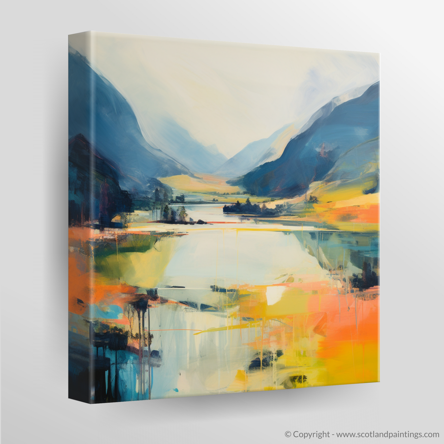 Captivating and vivid, this abstract interpretation of the picturesque Glenfinnan captures the breathtaking essence of the Scottish Highlands during the balmy months of summer. Swathes of bold orange, stark white, and luminous yellow blend with the serene blues and greens, illustrating the luscious landscapes and mirror-like waters that characterize this iconic locale.