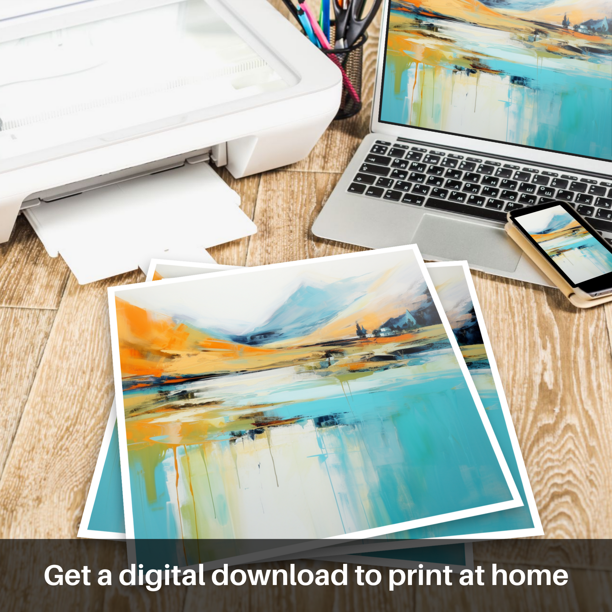 Perfect for anyone seeking to infuse their environment with the spirit of Scottish summers, this print will serve as a window to the soul-stirring highlands where land, water, and sky converge in a spectacular tapestry of abstract beauty.
