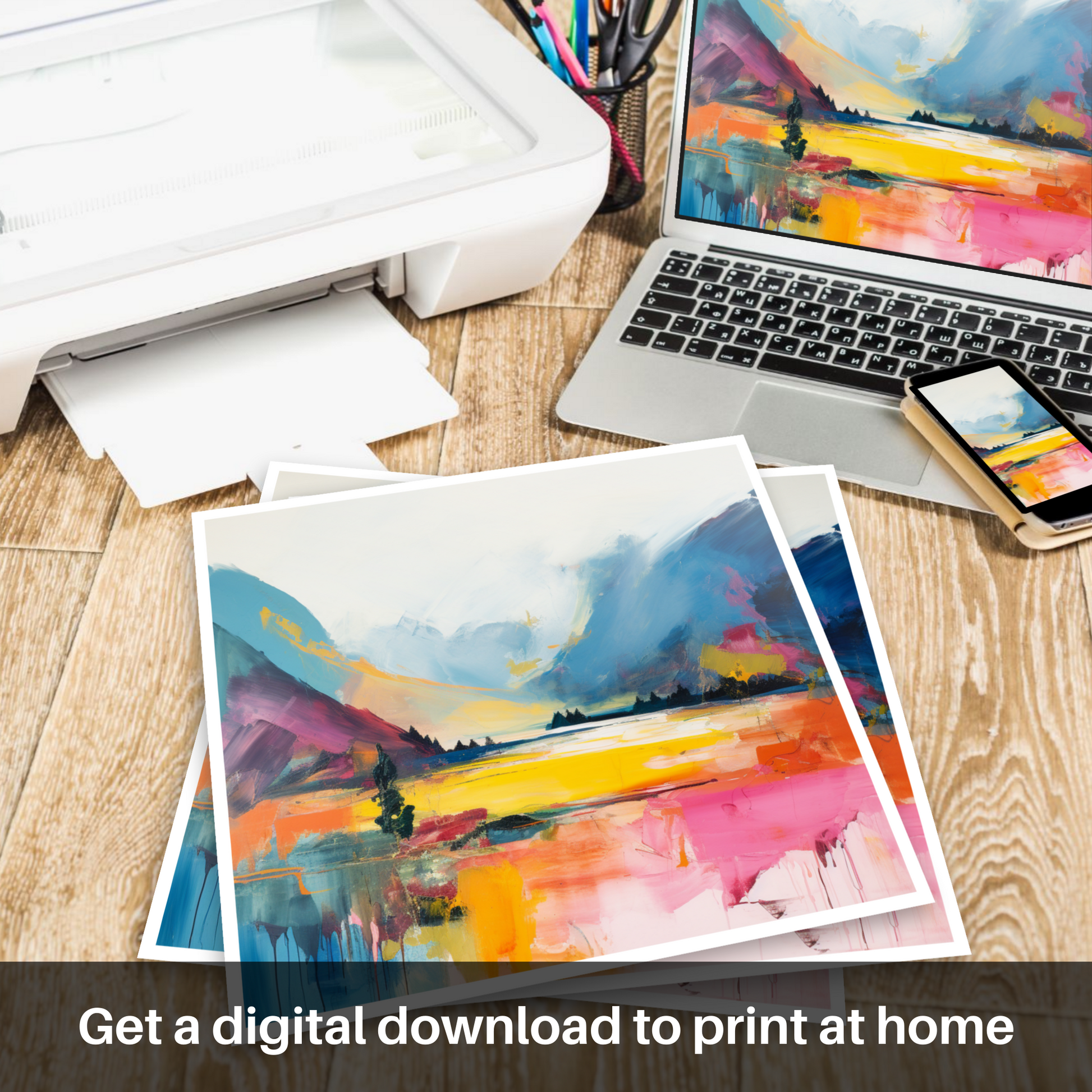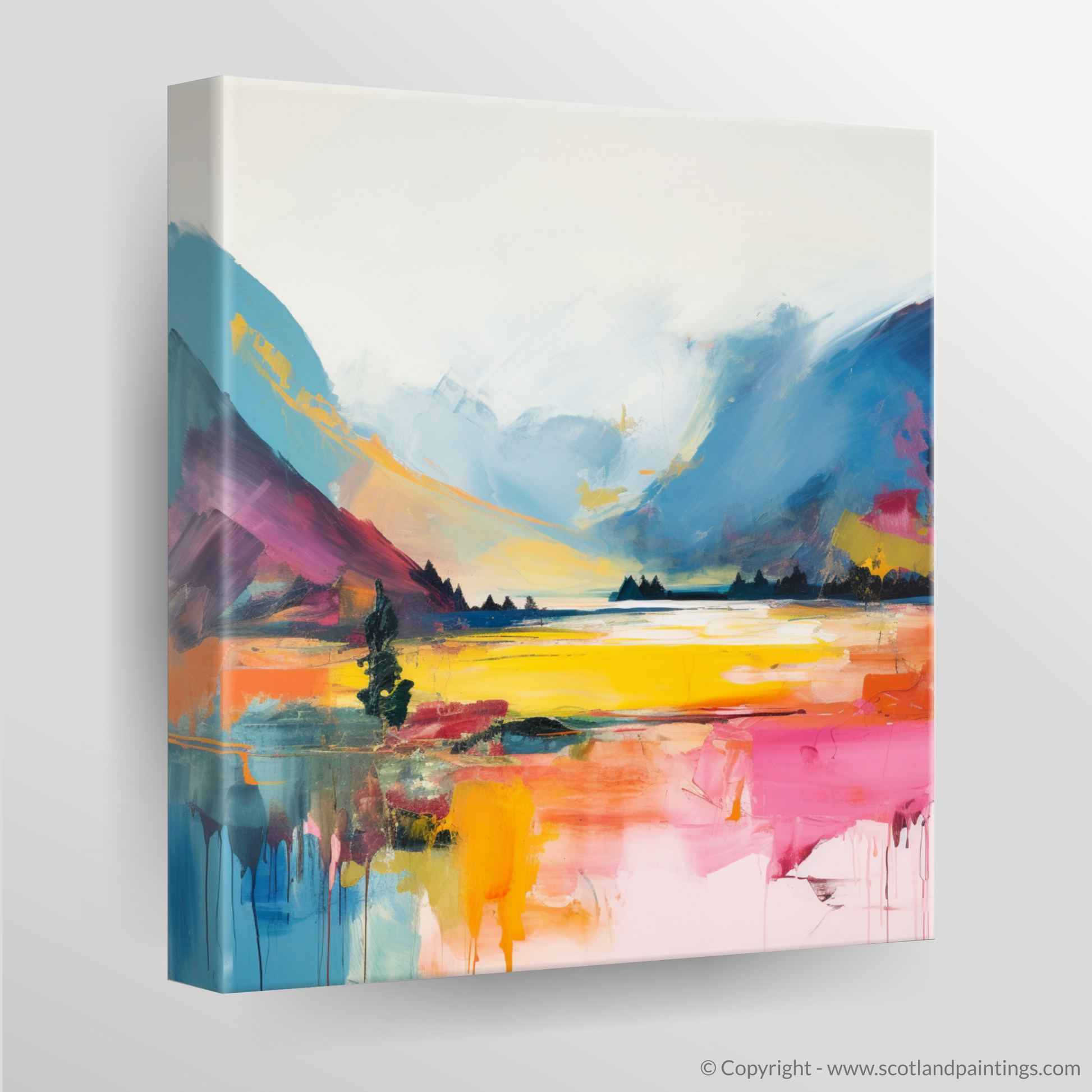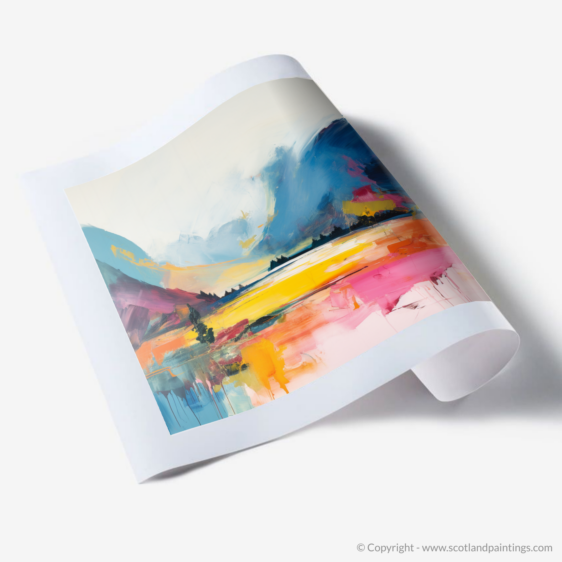 Capturing the essence of the Scottish Highlands with a vibrant blend of colour and motion, this abstract piece brings the summer's warmth and vitality of Glenfinnan to any space. Beautifully interpreting the landscape in a riot of hues, the work features bold strokes of magenta and blue that represent the rolling hills and imposing mountains, while the golden tones and yellows at the centre suggest the shimmering light reflecting off lochs under a high sun.