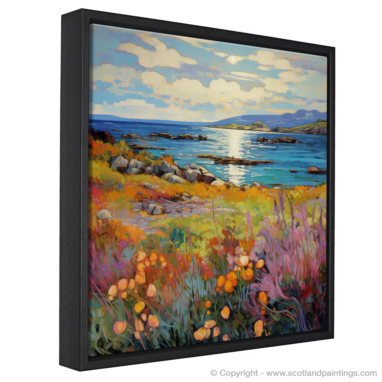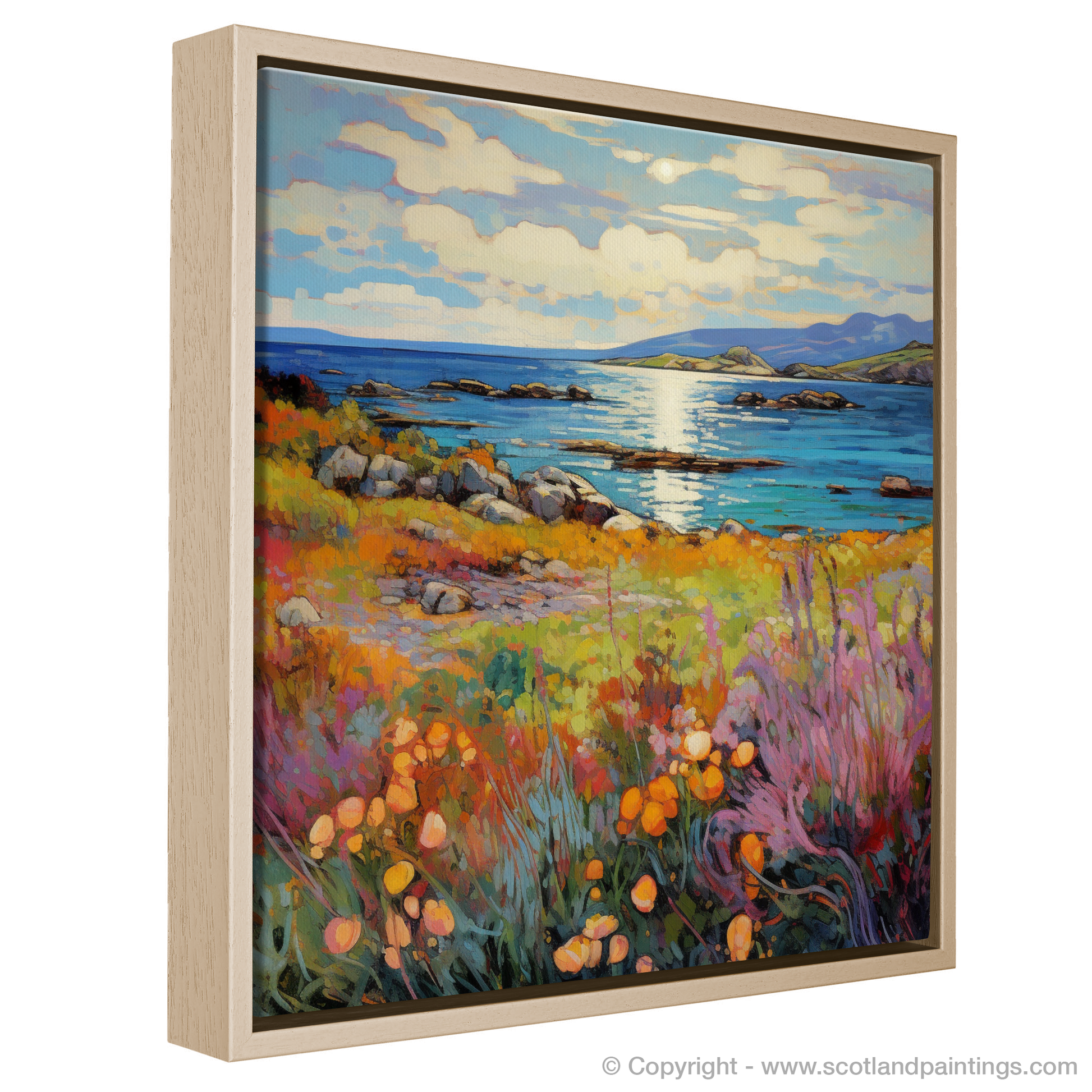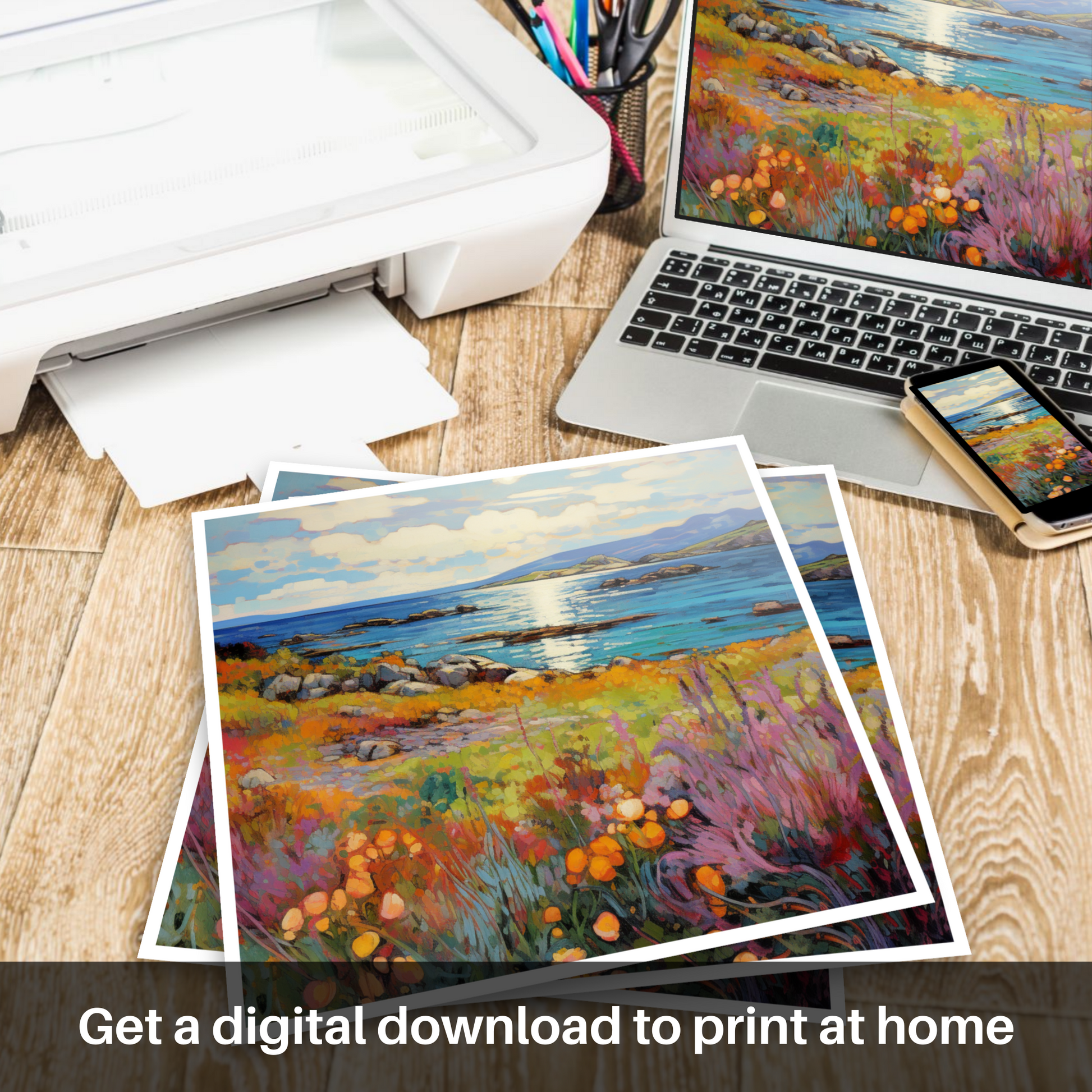 Capturing the essence of a sun-kissed Isle of Gigha, this evocative print from the 'Scotland in Summer' collection transports viewers to the poetic tranquillity of the Inner Hebrides. The painting comes alive with a vibrant palette of warm oranges, lush greens, and soothing purples, reminiscent of the heather-covered landscapes that define Scottish summers. Gentle impressions of wildflowers in the foreground dance with the light, leading the eye on a mesmerising journey towards the shimmering azure sea. The horizon is graced by the outline of distant hills, bathed in the soft haze of summer warmth, while overhead, a sky punctuated by wispy clouds echoes the serene stillness of the island's surroundings.