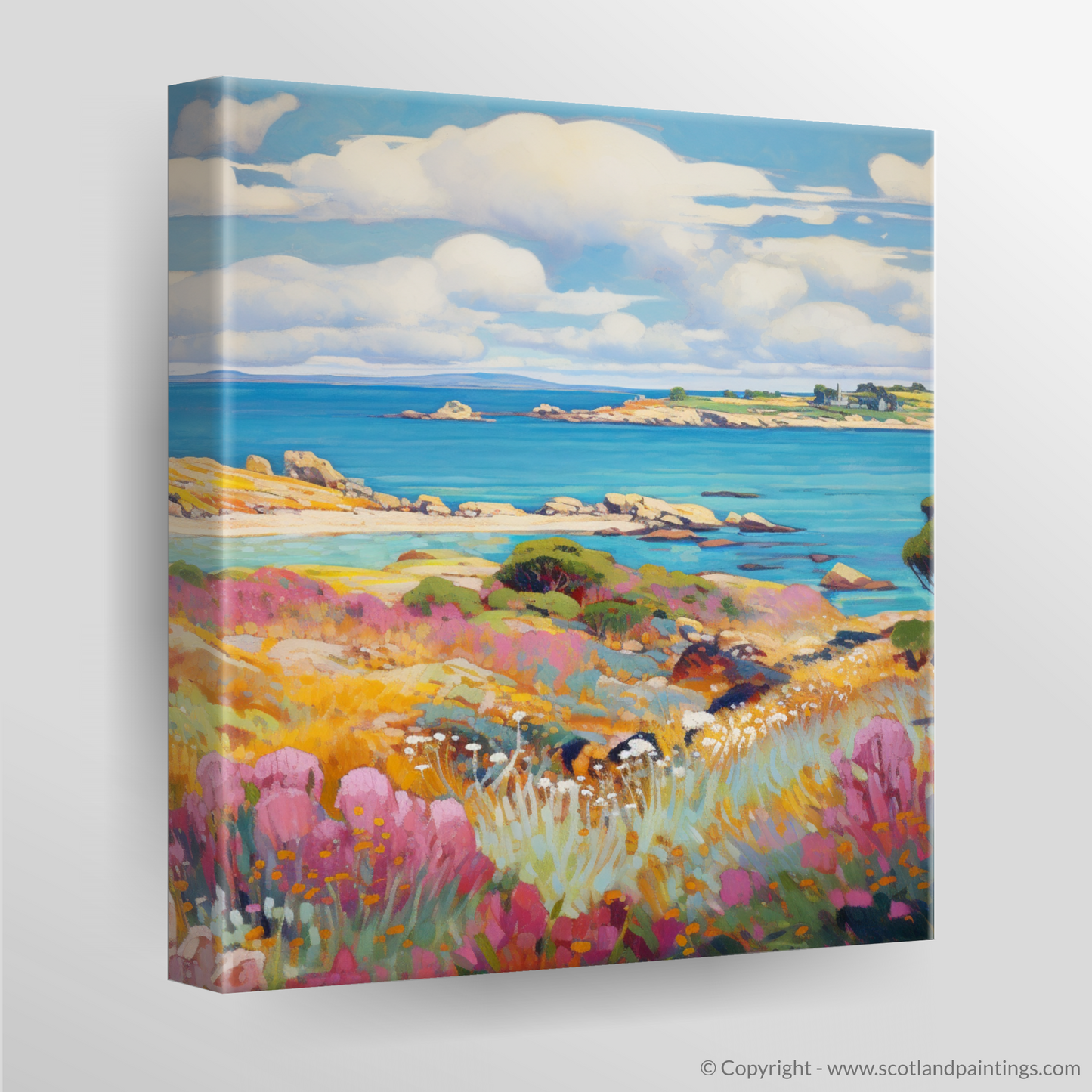 Capturing the serene beauty of the Isle of Gigha, this exquisite piece pays homage to the vibrant essence of the Inner Hebrides during the warmth of summer. With a rich tapestry of colours, the artwork invites the viewer into a landscape brimming with the lush hues of nature. Vivid pinks, purples, and yellows of the wildflowers and grasses dominate the foreground, evoking a sense of the island’s abundant flora. These are subtly complemented by the earthy tones of the rugged shoreline, creating a harmonious contrast.