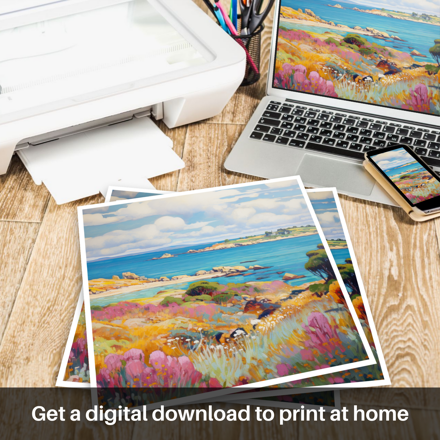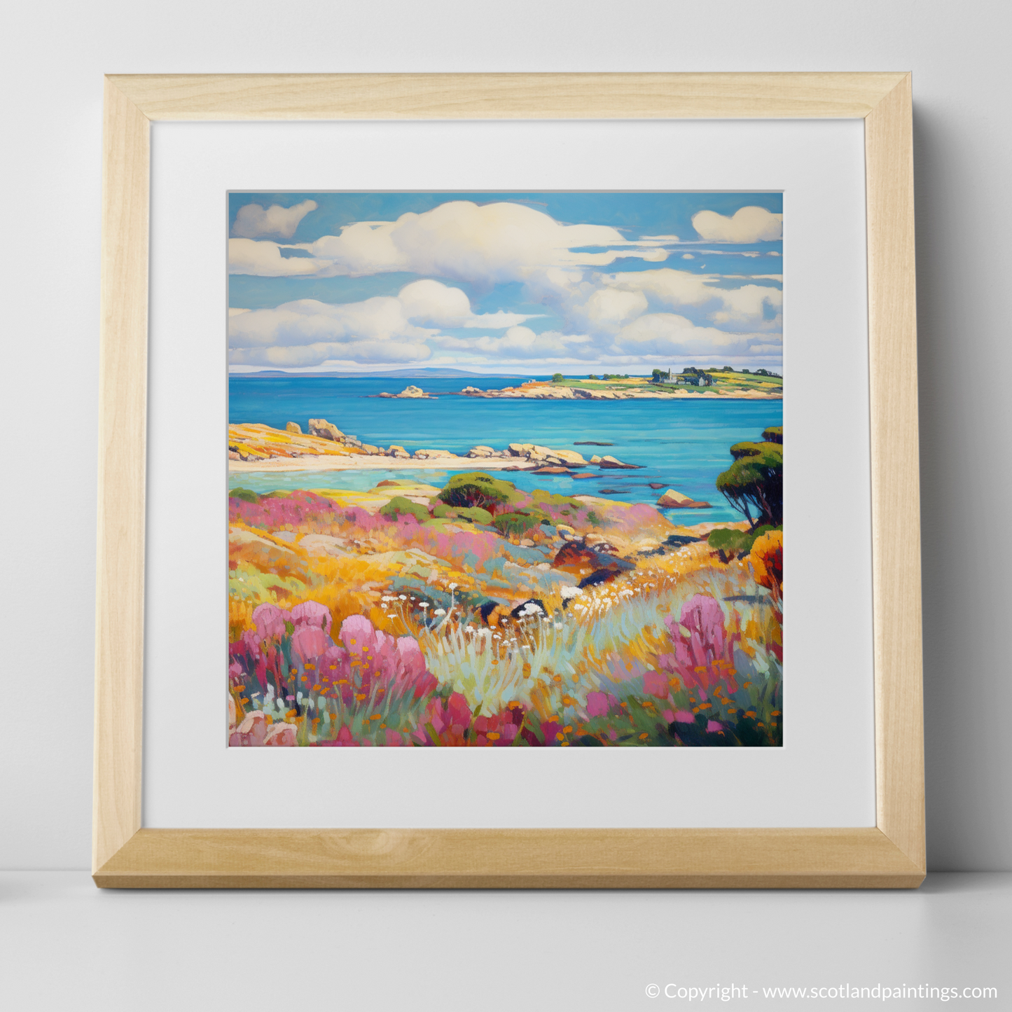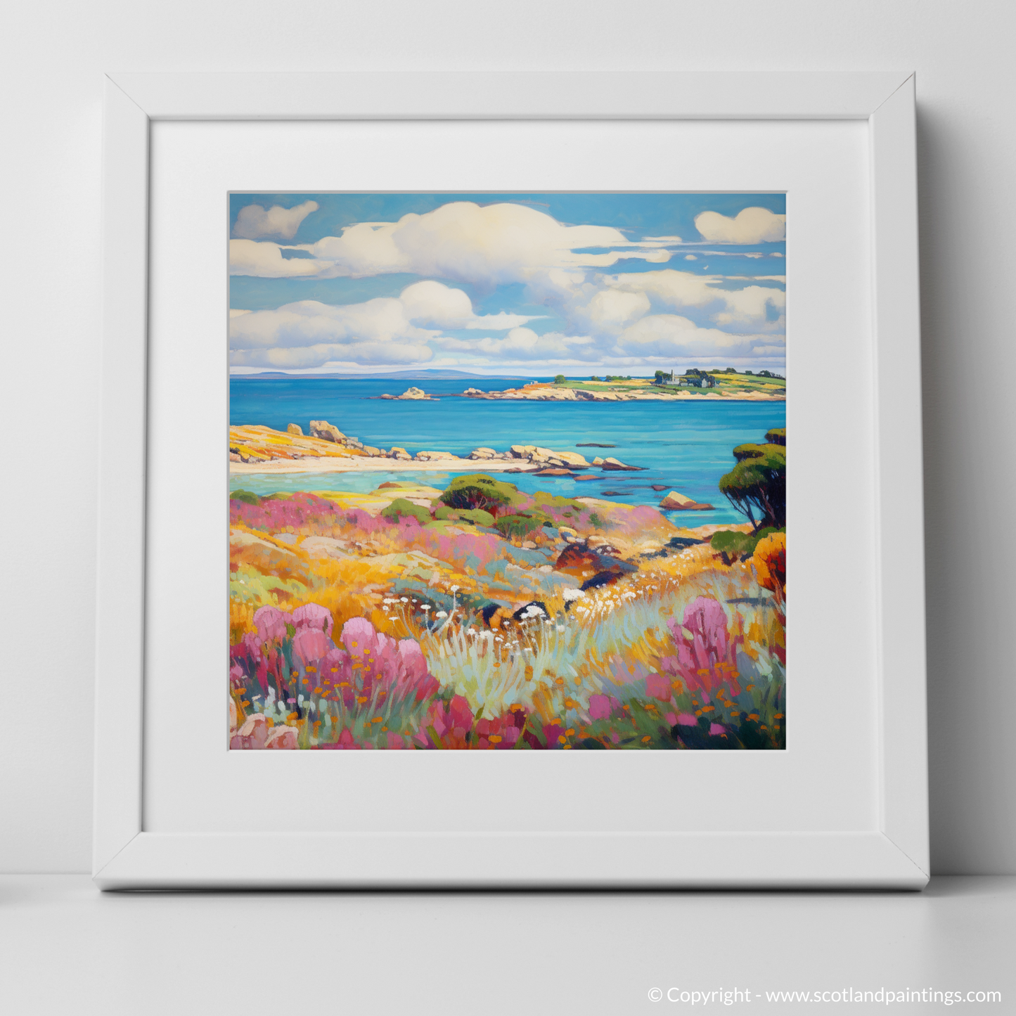 Further afar, white-washed buildings perch idyllically, suggesting the quiet human presence amidst this natural splendour. This print is a celebration of Scotland's summertime palette, offering a sense of peace and a respite from the bustle of modern life. It is an enchanting addition to any space that seeks to capture the timeless charm of the Scottish landscape.