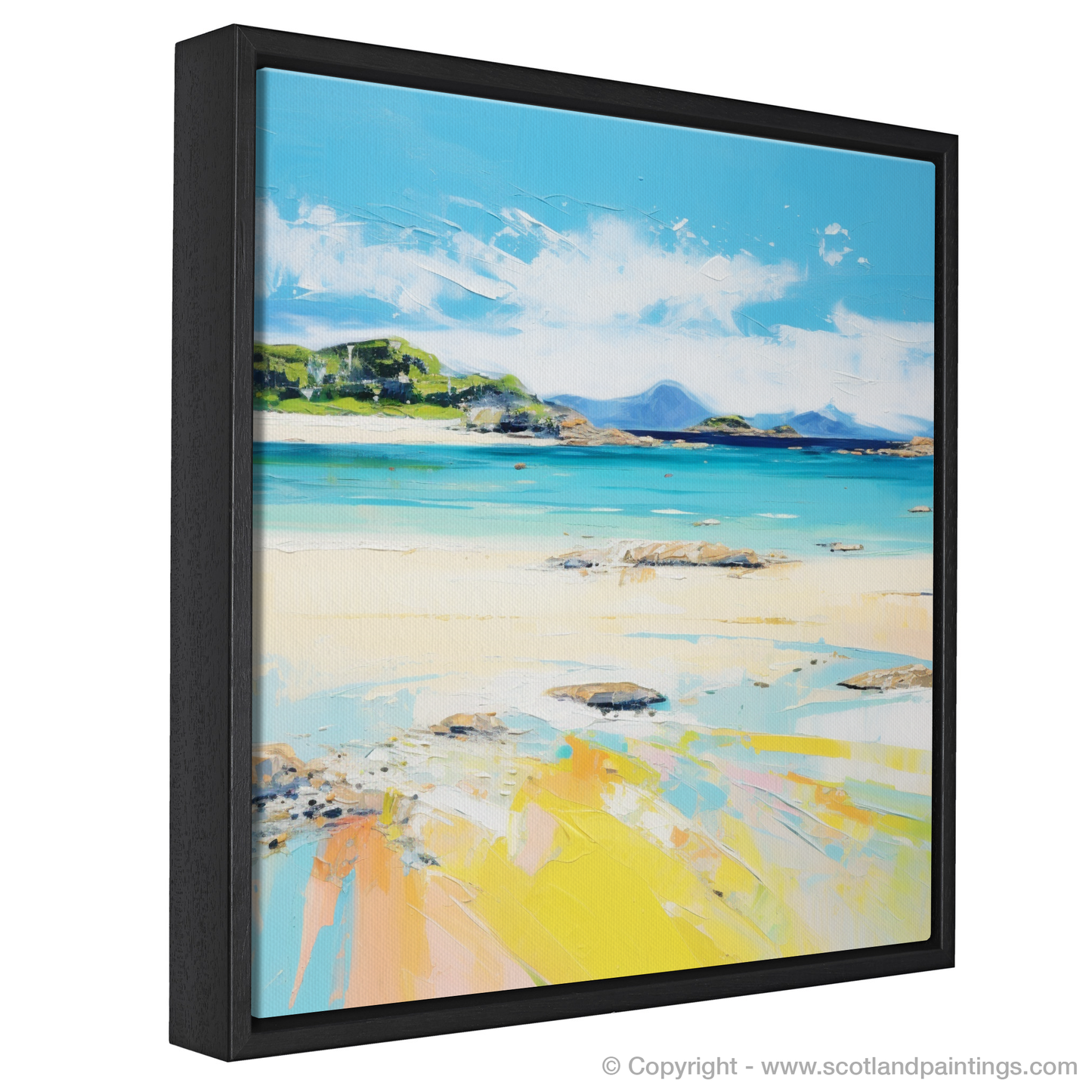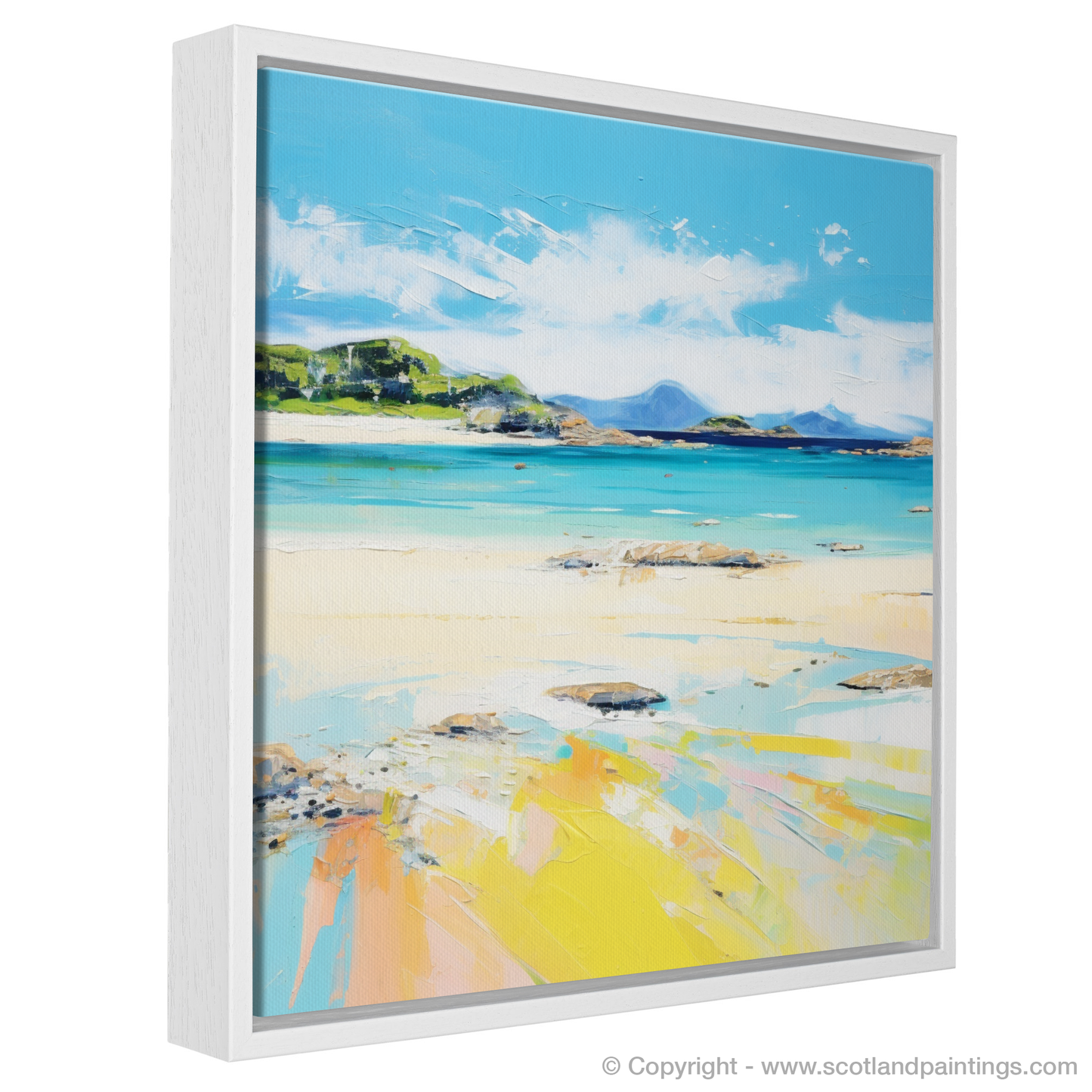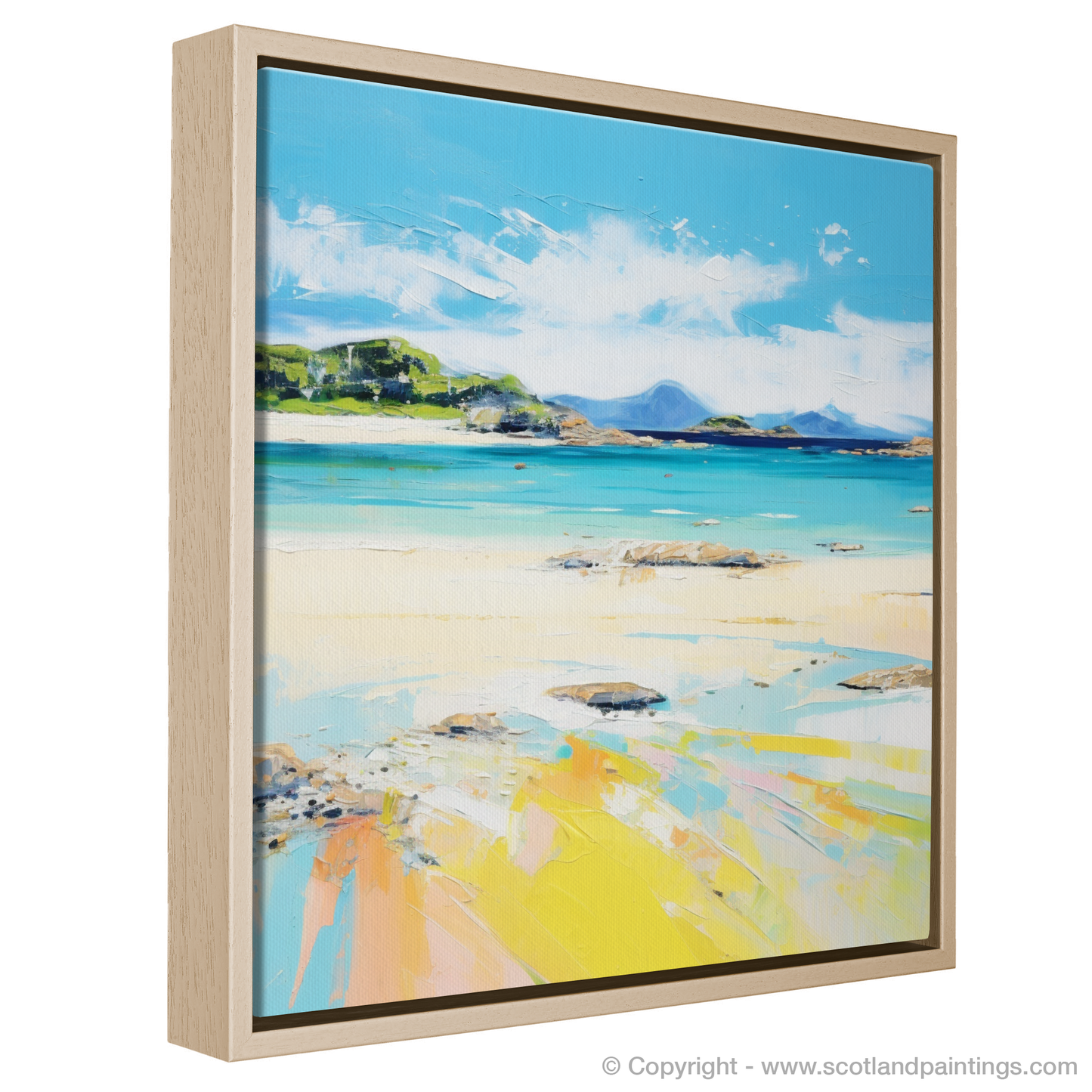 At the forefront, the artwork boasts a beach rendered in a riot of sun-kissed yellows, creamy whites, and subtle peach undertones, depicting the shimmering sands that give the Morar its name. This harmonic play of colours reflects the warmth of summer, with flecks of earth tones and greys suggesting rocks and natural debris scattered along the shoreline.
