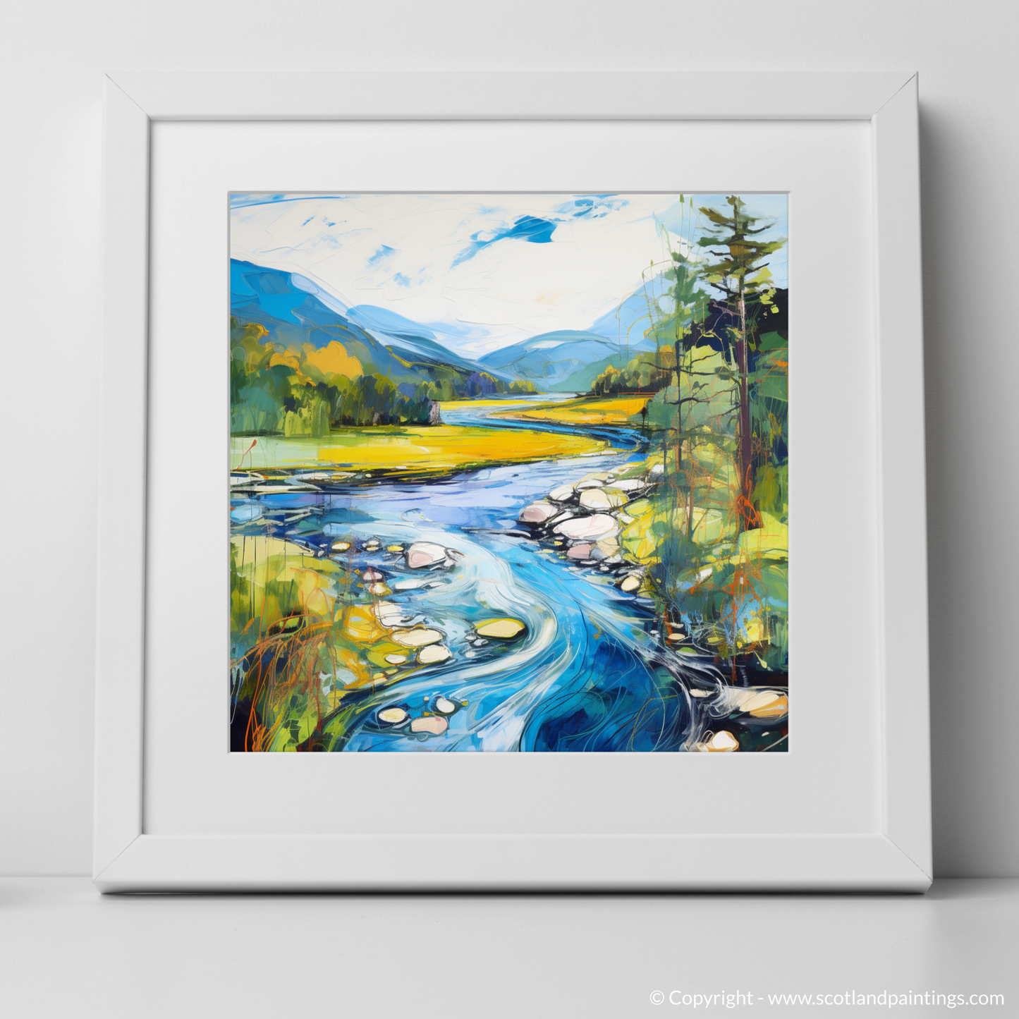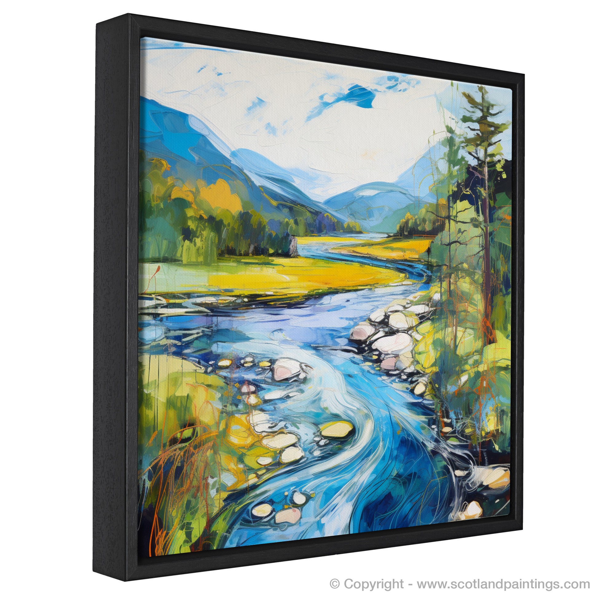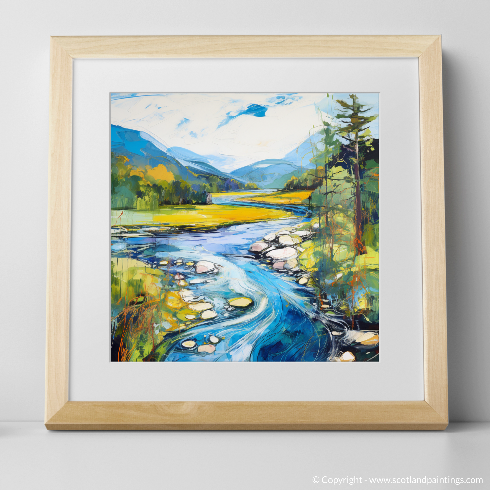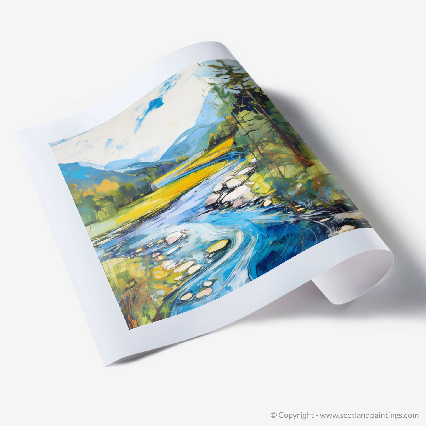 Captured within this vibrant print is a dynamic rendition of River Orchy, basking in the full splendour of a Scottish summer. The viewer is presented with a lush, verdant landscape, where the interplay of light and shadow casts a charming spell over the rolling hills and dense foliage. The river itself becomes a focal point, winding through the scene with a vivacious energy that is almost palpable. Swirls of azure and cerulean mimic the water's rhythm, contrasted with the golden hues of the sun-kissed grasslands that stretch into the distance.