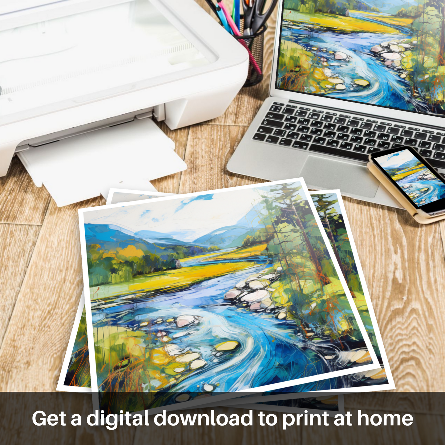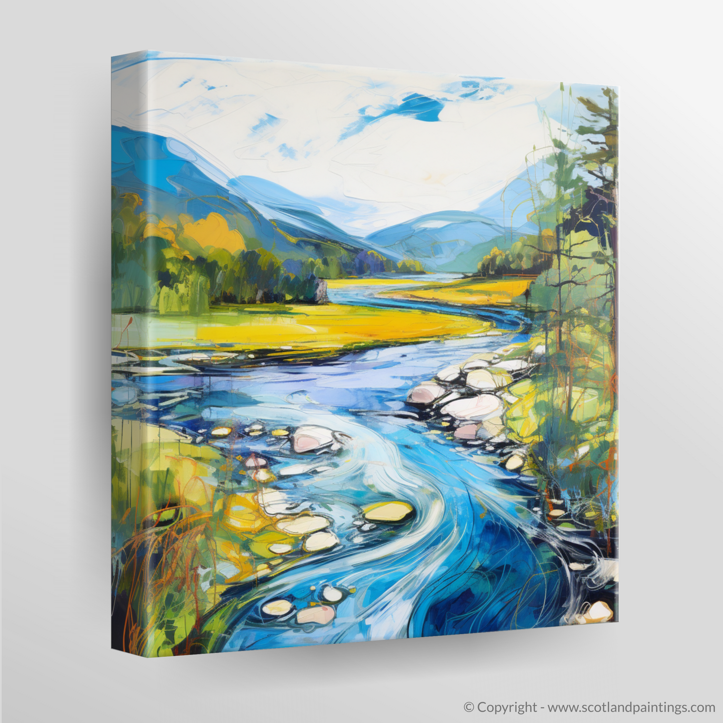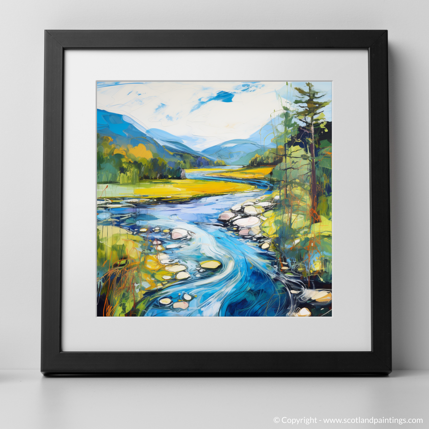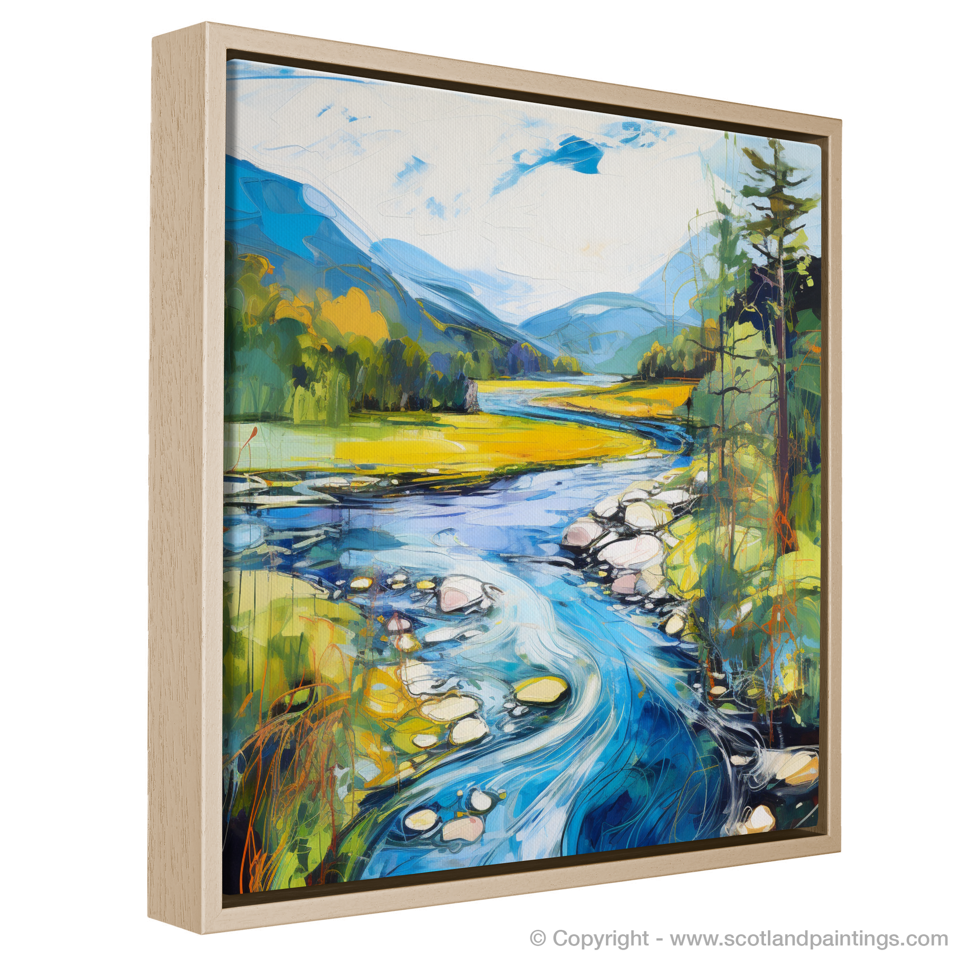 Captured within this vibrant print is a dynamic rendition of River Orchy, basking in the full splendour of a Scottish summer. The viewer is presented with a lush, verdant landscape, where the interplay of light and shadow casts a charming spell over the rolling hills and dense foliage. The river itself becomes a focal point, winding through the scene with a vivacious energy that is almost palpable. Swirls of azure and cerulean mimic the water's rhythm, contrasted with the golden hues of the sun-kissed grasslands that stretch into the distance.