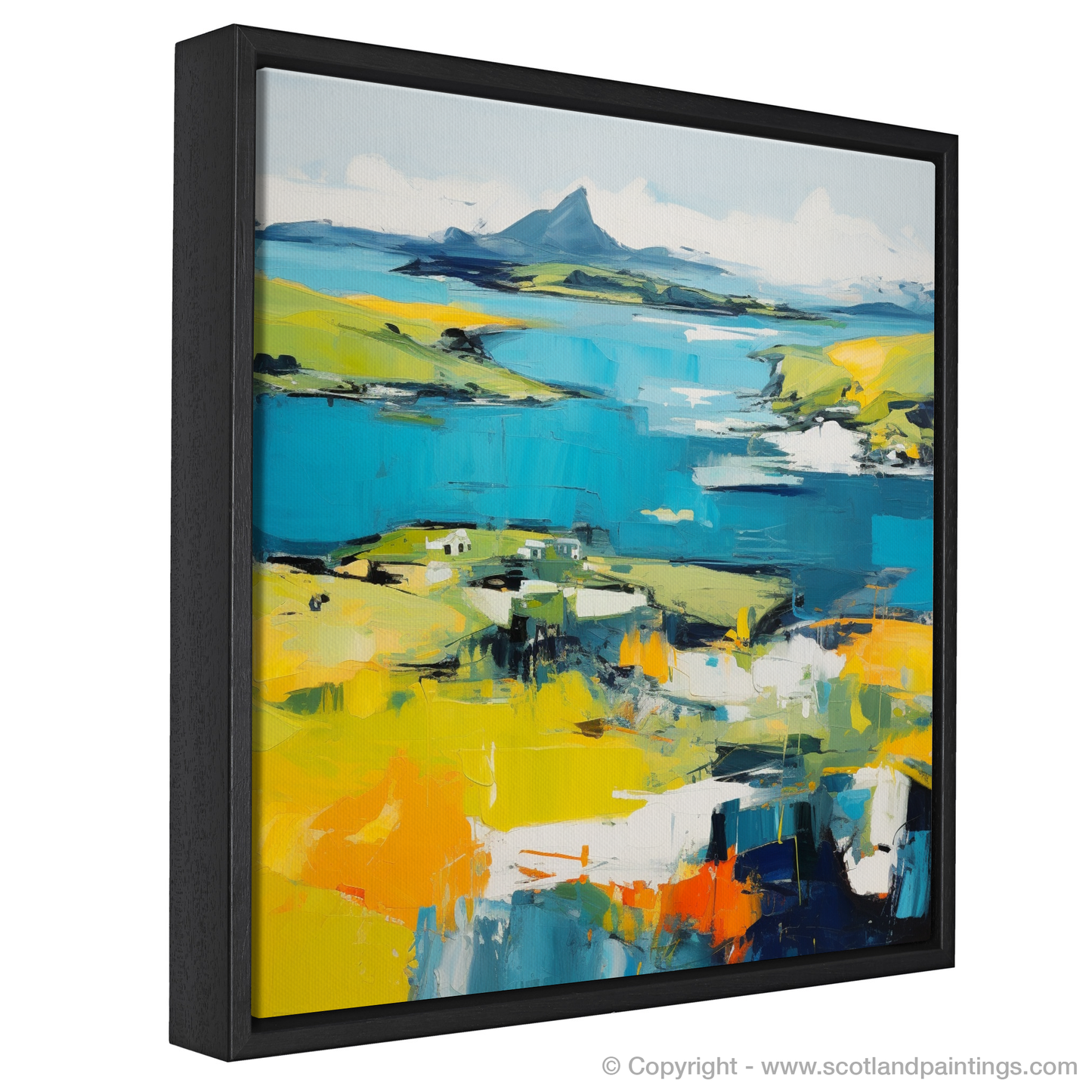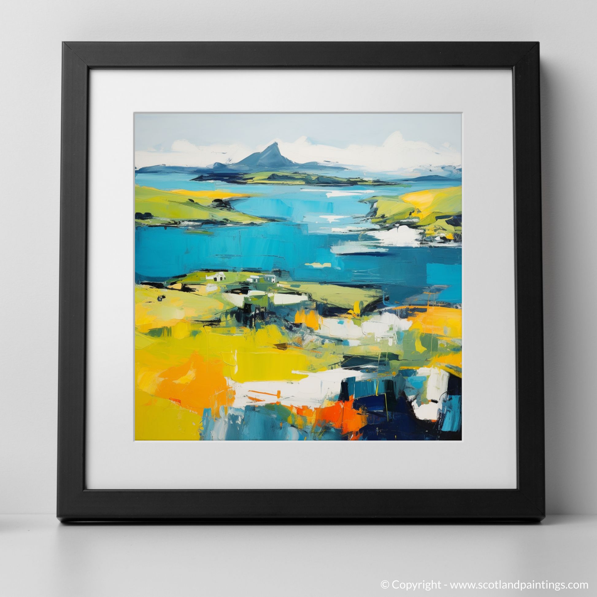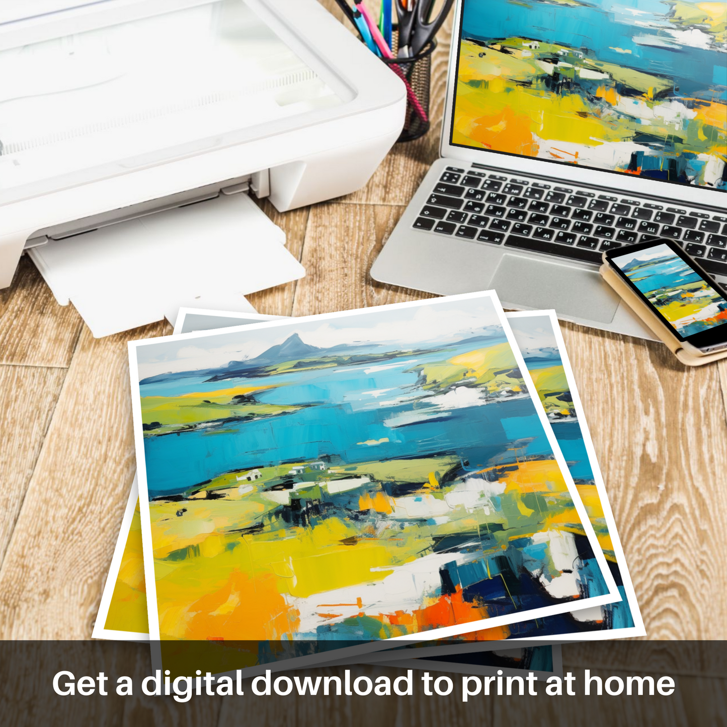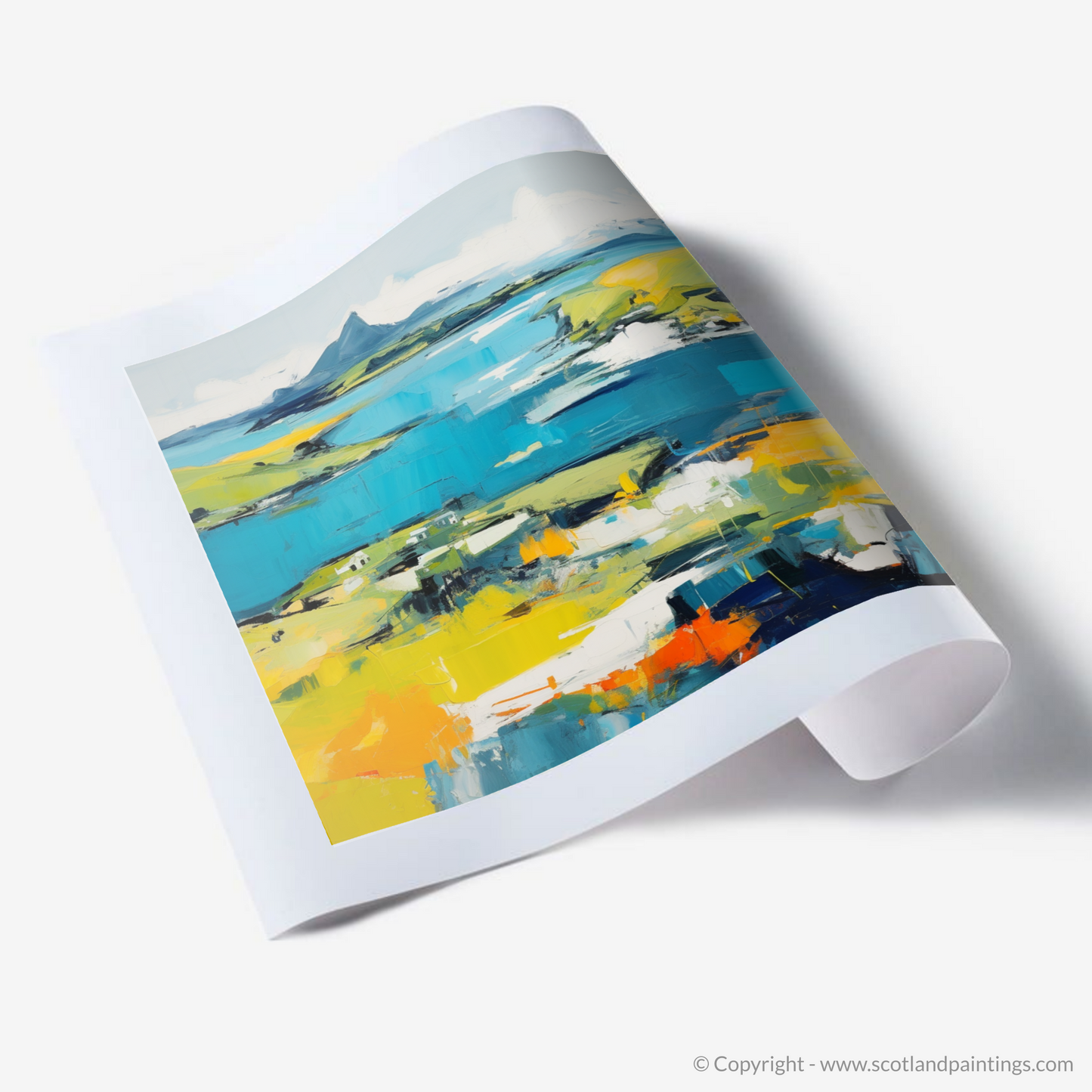 Capturing the essence of the Isle of Ulva in the summertime, this vibrant abstract print brings to life the unique beauty of the Inner Hebrides. Bold strokes of cobalt and cerulean dance across the canvas, evoking the crisp, undulating waters that surround the lush island. Swathes of rich yellow and verdant green suggest the sun-dappled fields and rolling meadows that are synonymous with Scotland during the warmer months.