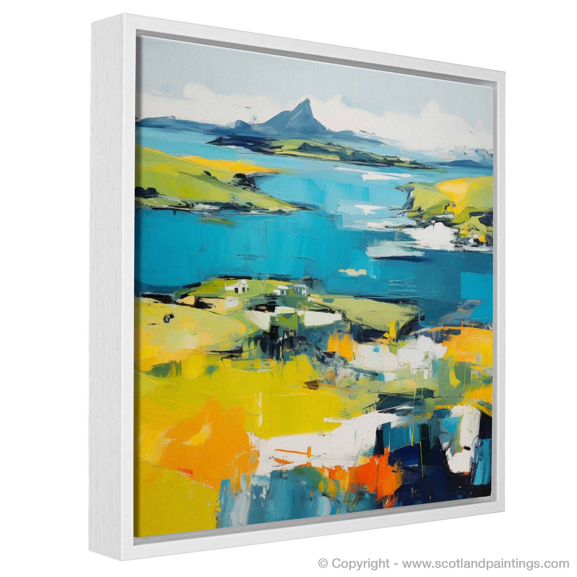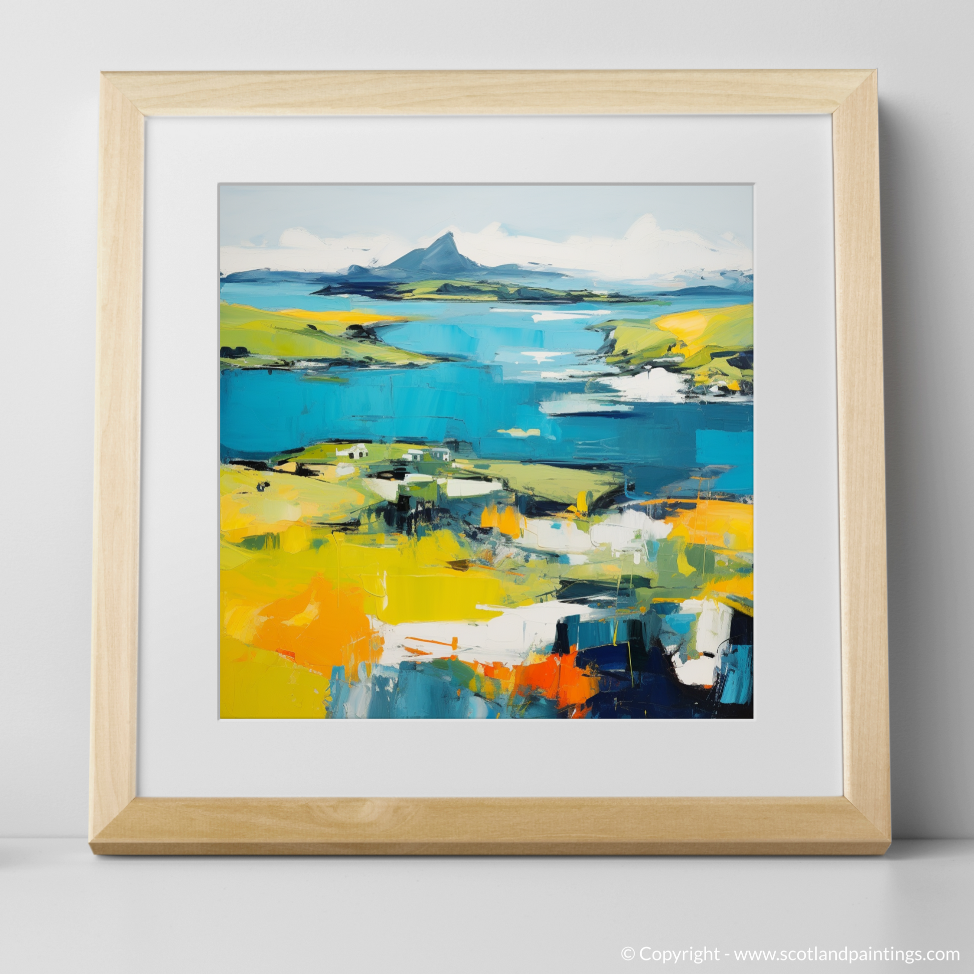 The composition is a symphony of colour and texture, with white highlights that mimic the bright Scottish daylight reflecting off natural elements. Patches of orange and pops of red add depth and contrast, infusing the scene with the warmth of a summer's day. The abstraction allows for a freedom of interpretation, where simple forms hint at the serene landscapes and cottages nestled within. This print is a celebration of Scotland's natural palette and the tranquillity of Ulva's shores, offering a modern take on the traditional landscape that encourages the viewer to lose themselves in its depths.