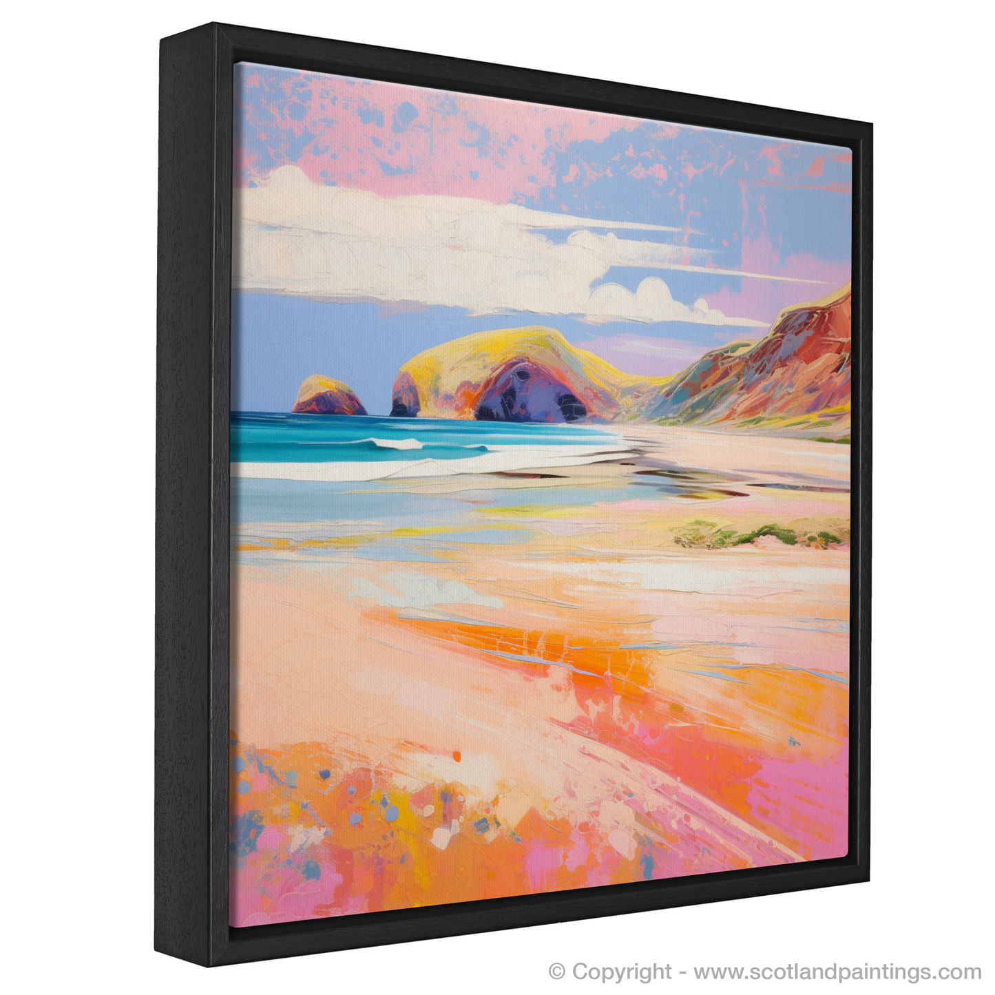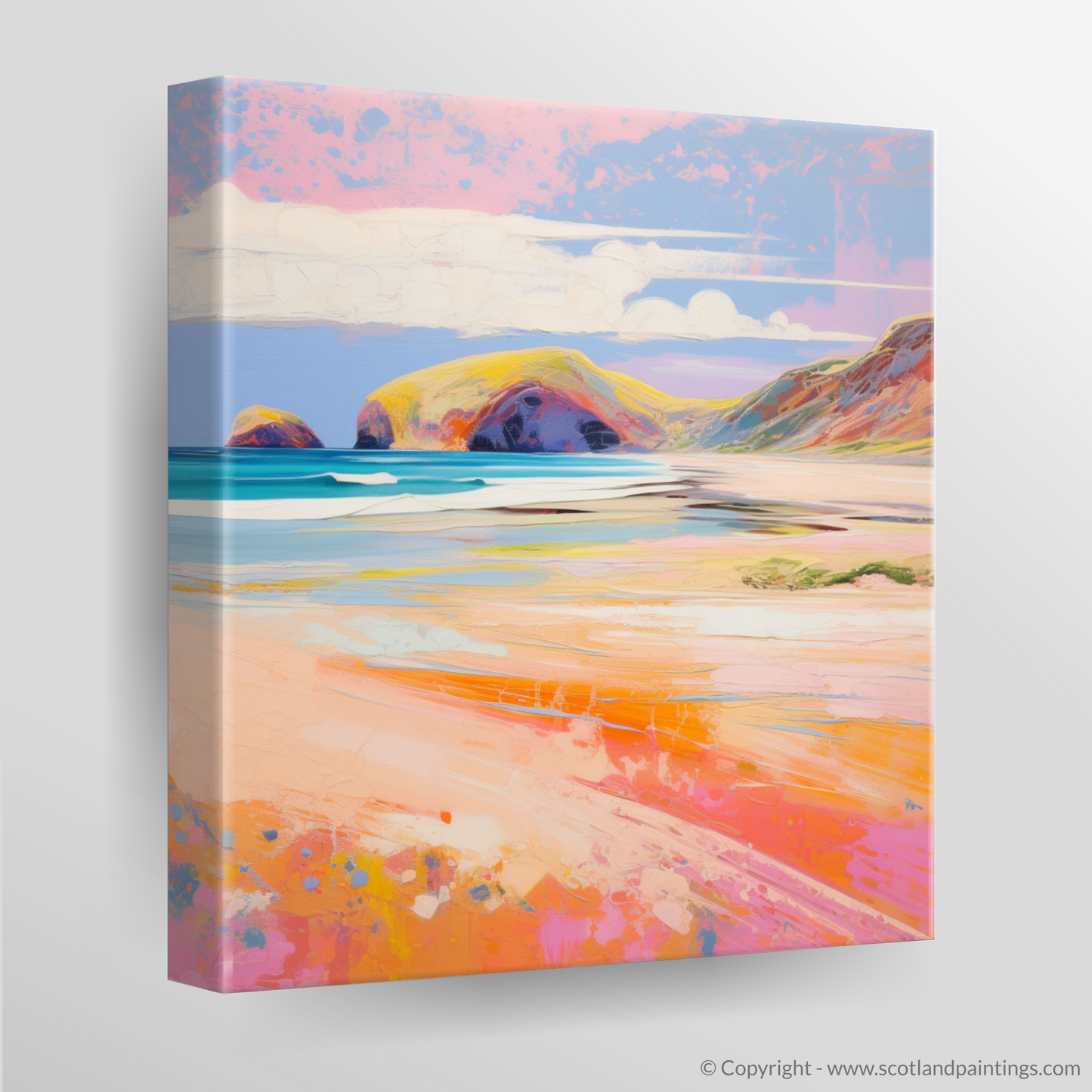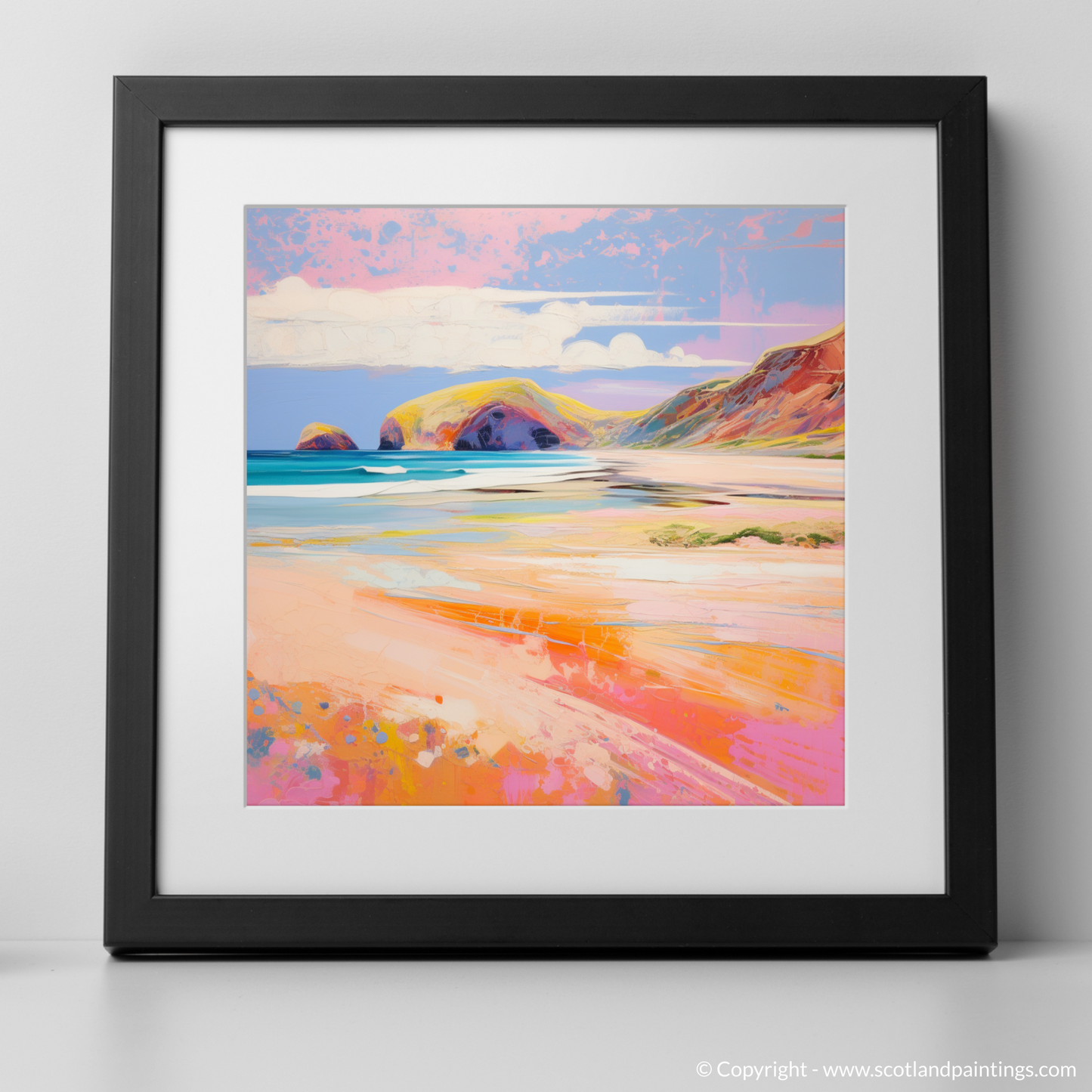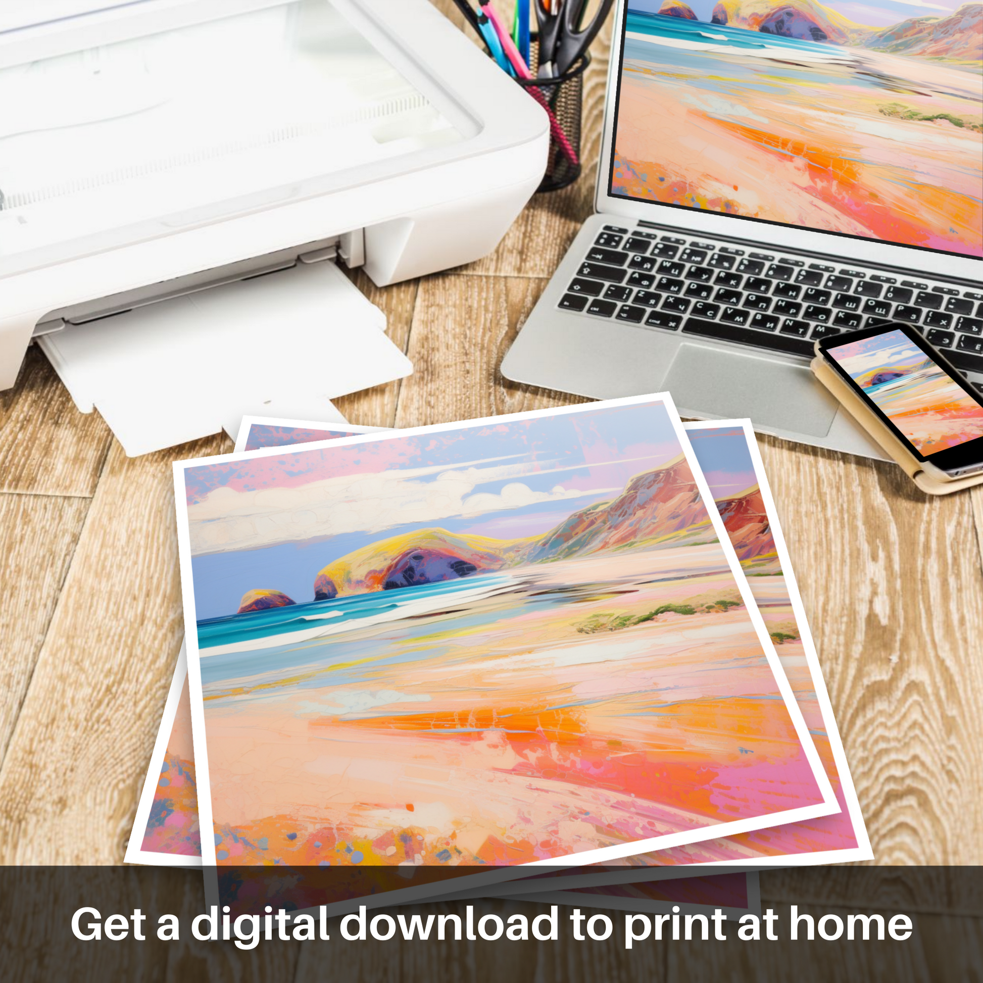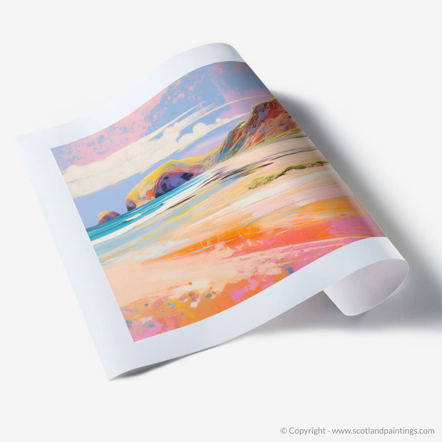 Capturing the essence of Sandwood Bay in the height of summer, this evocative print is a celebration of Scotland's natural grandeur. Broad, expressive brushstrokes conjure a wild landscape alive with colour and light, inviting one to lose themselves in a canvas of vibrant hues. The cerulean blues of the sea contrast strikingly with pastel sky, where hints of pink and white clouds drift lazily above. The golden tones of the beach, kissed by the warmth of the sun, shimmer against the rusts and ambers of imposing cliffs.