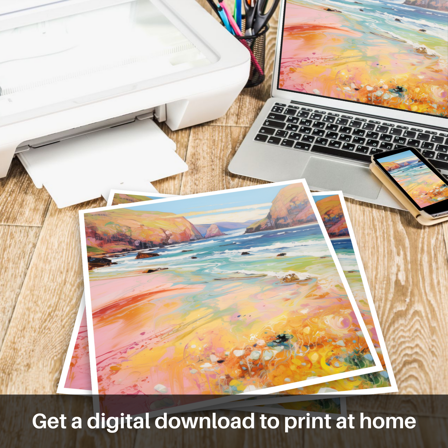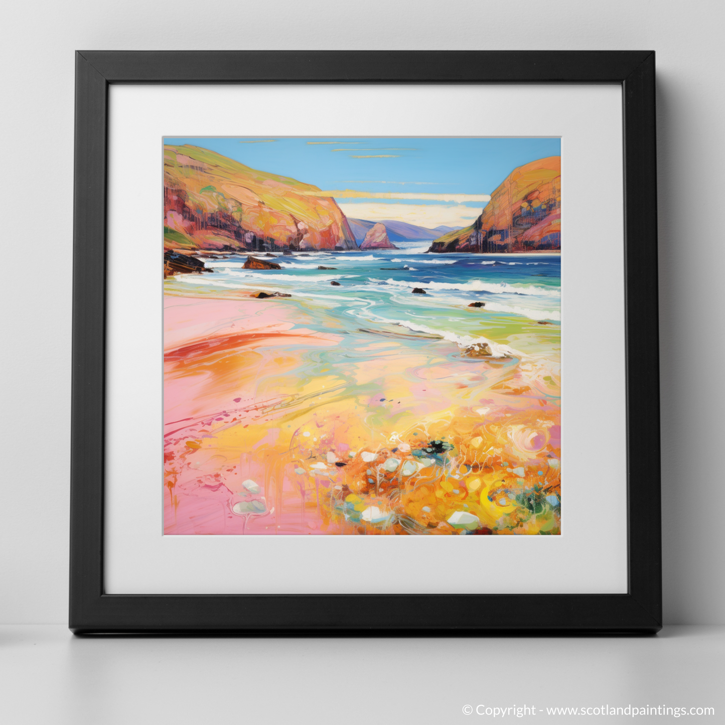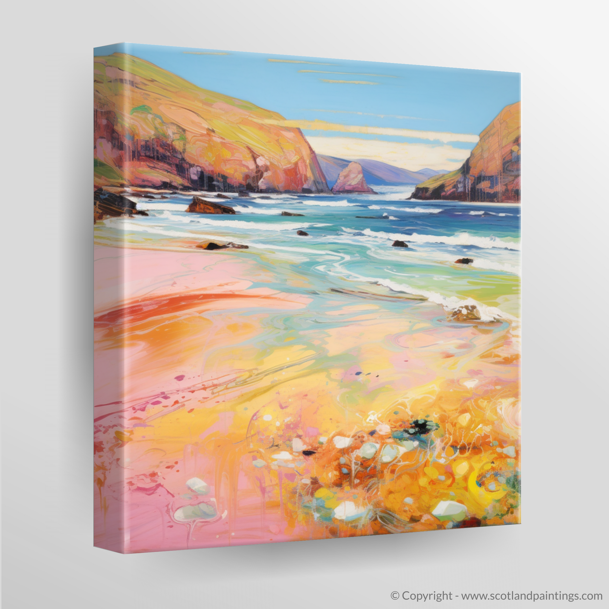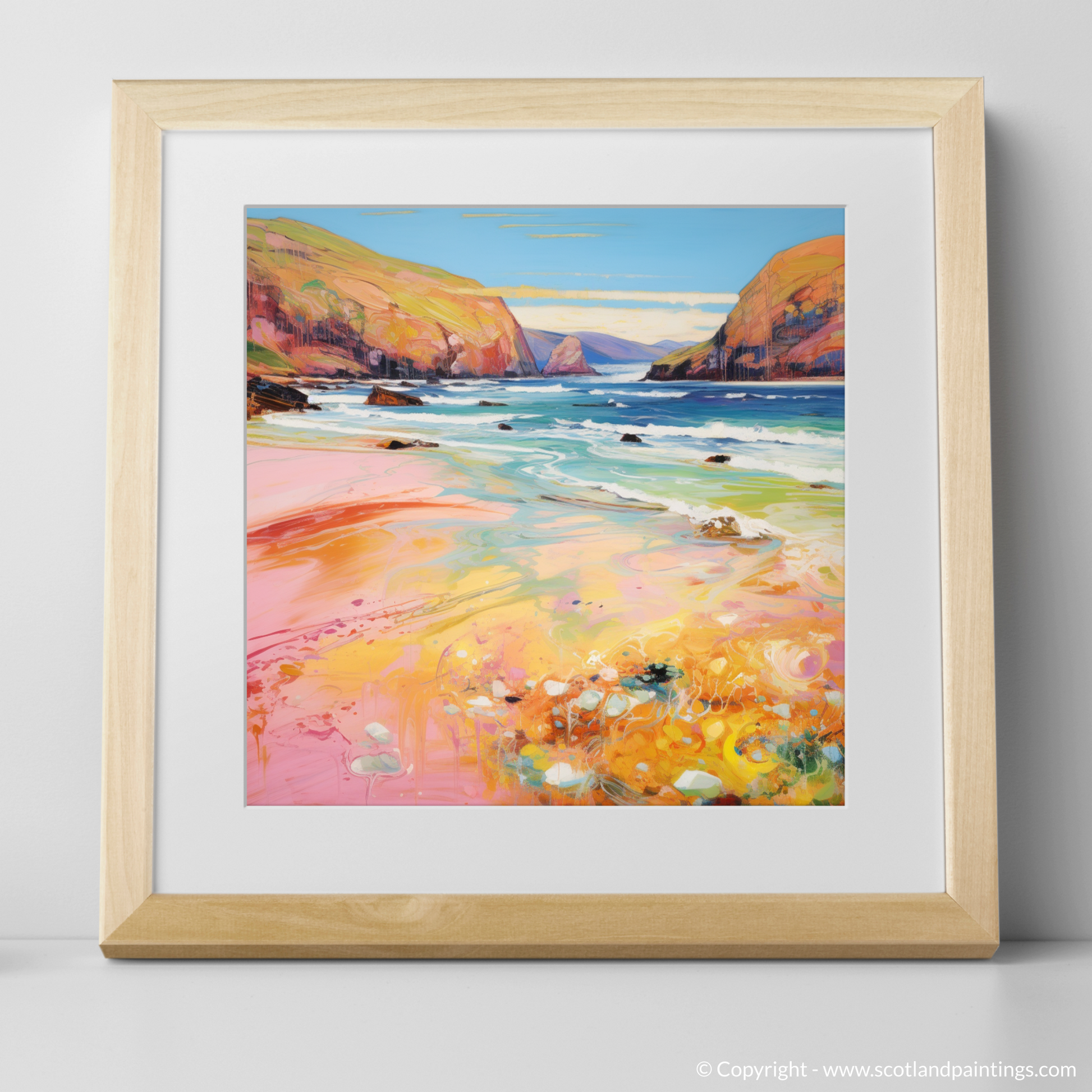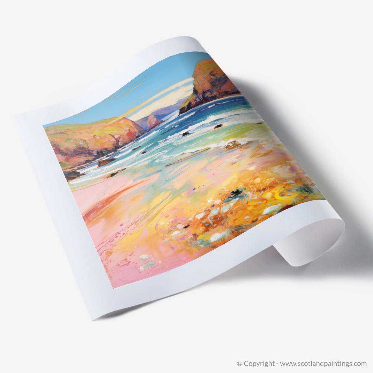 Capturing the ethereal beauty of Sandwood Bay, Sutherland, this exquisite print is a vibrant homage to the Scottish summertime. With a flourish of impressionistic technique, the artwork draws the viewer into a world where vivacious hues of coral, amber, and cerulean dance across the canvas, echoing the dynamic interplay of sunlight on water and sand.